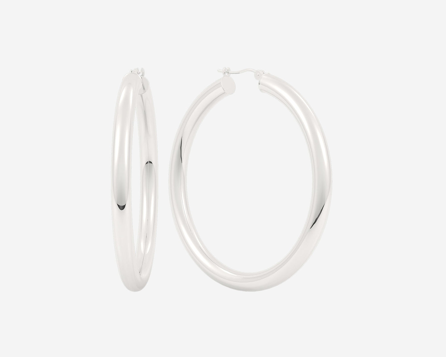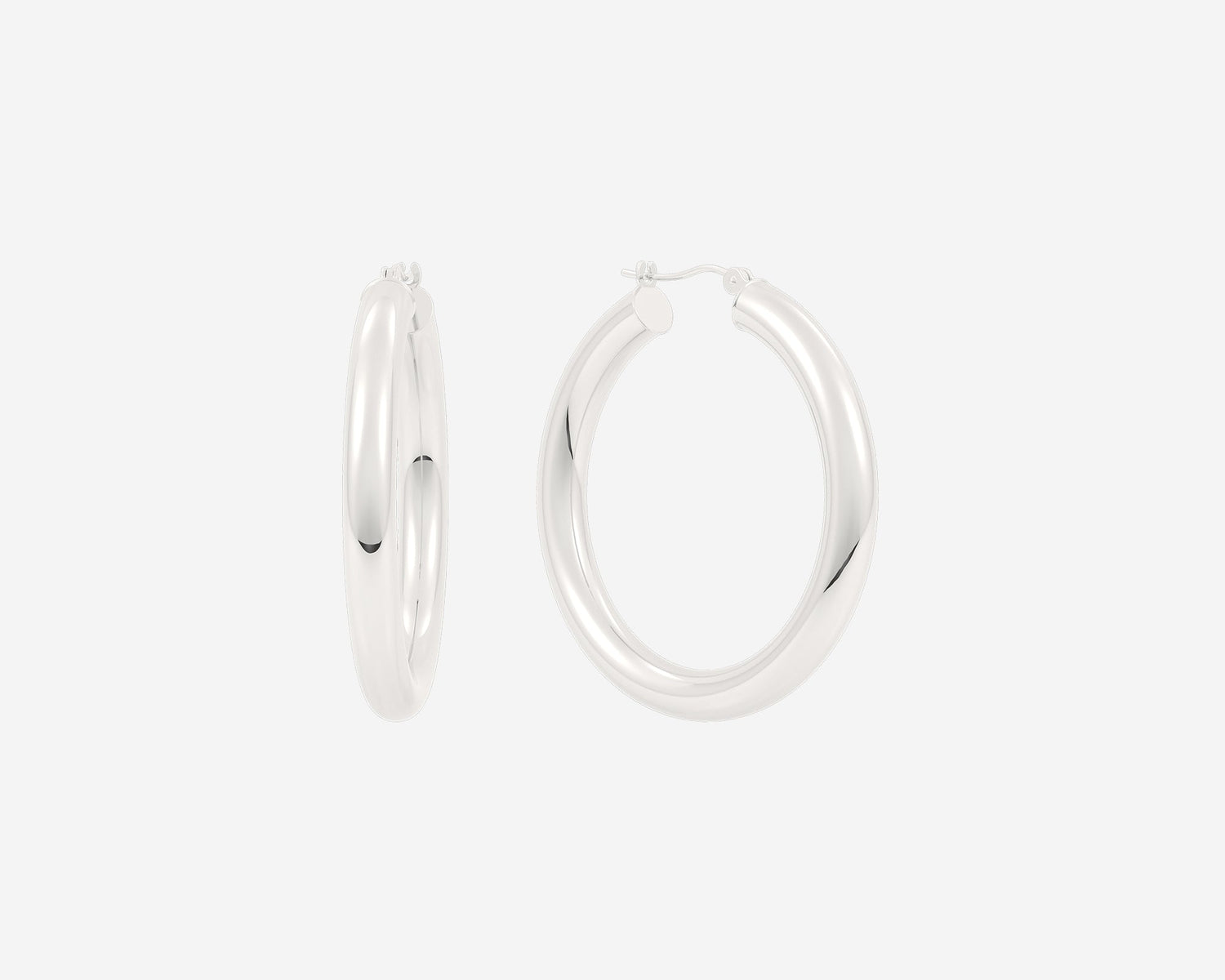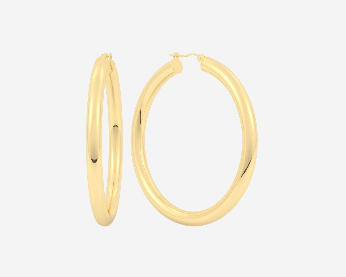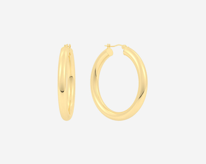 These Tube Hoops by Holden feature a cylindrical tube shape with a 20mm diameter, delivering bold yet timeless style. Available in 14k yellow and white gold, they offer a smooth profile and secure clicker closure for comfortable, confident wear. Crafted with sustainable practices in New York City, these hoops blend modern design with lasting elegance.
