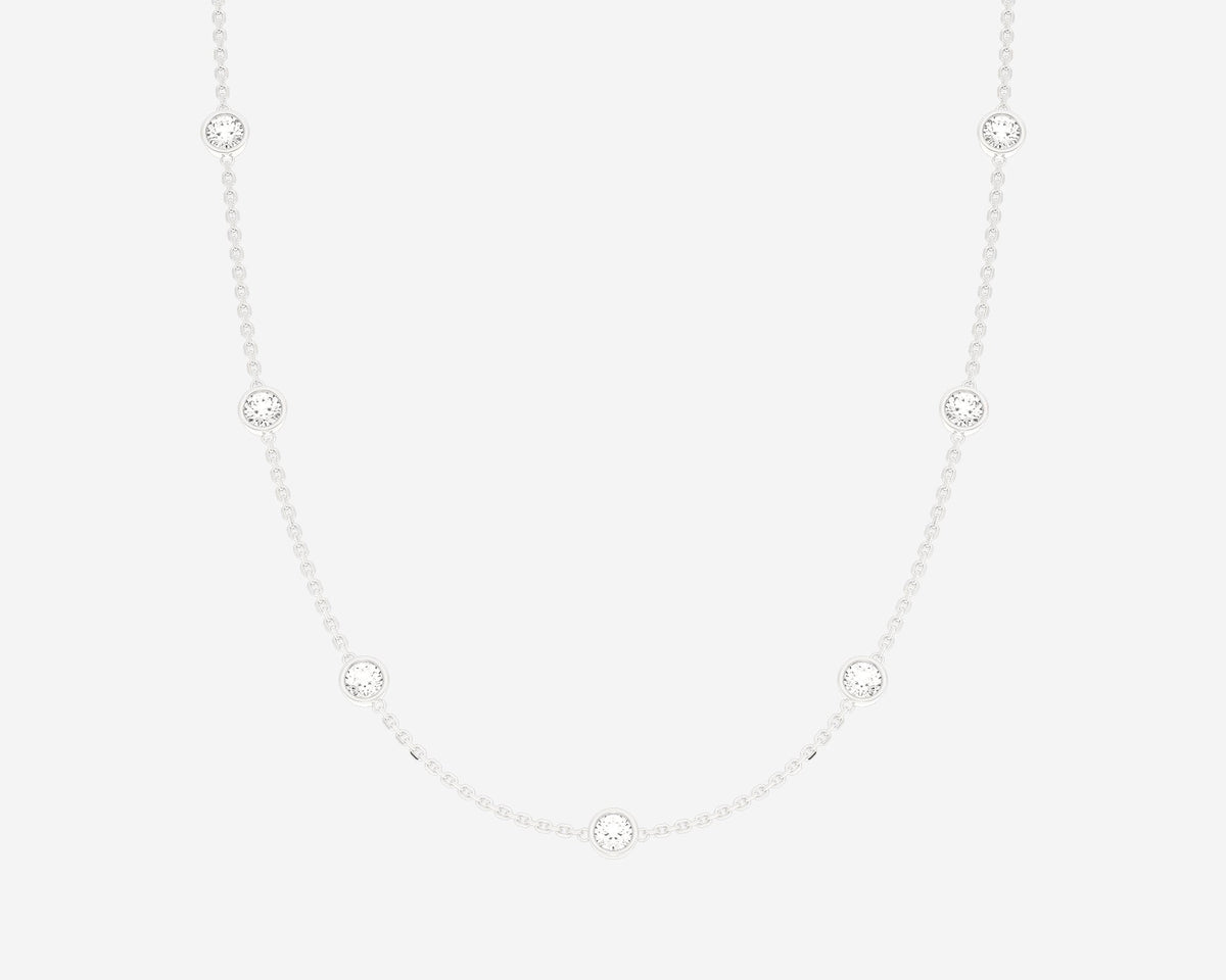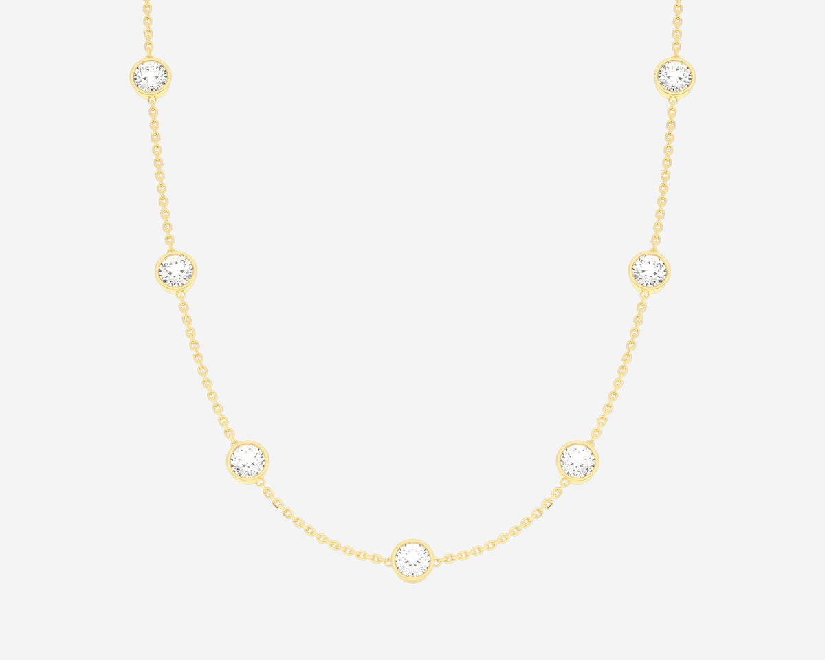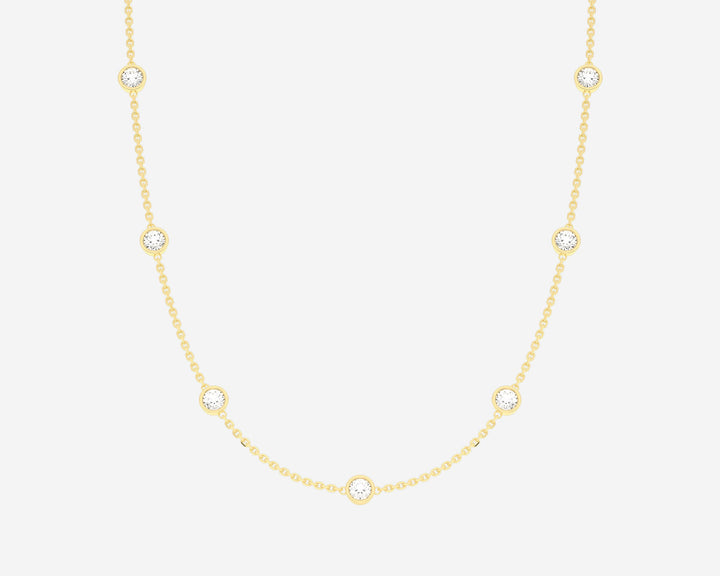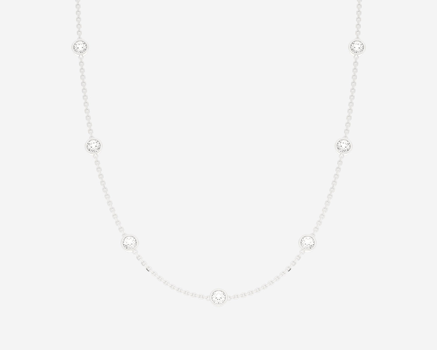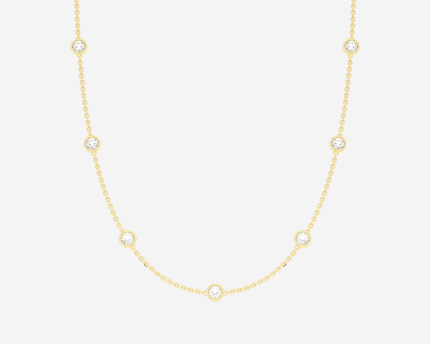 This Classic Station Necklace by Holden elevates any look with bezel-set lab-grown round diamonds spaced evenly along the chain. Available in 14k yellow, rose, or white gold, this versatile necklace is perfect for layering or wearing solo and is handcrafted to order with meticulous care and sustainable materials.
