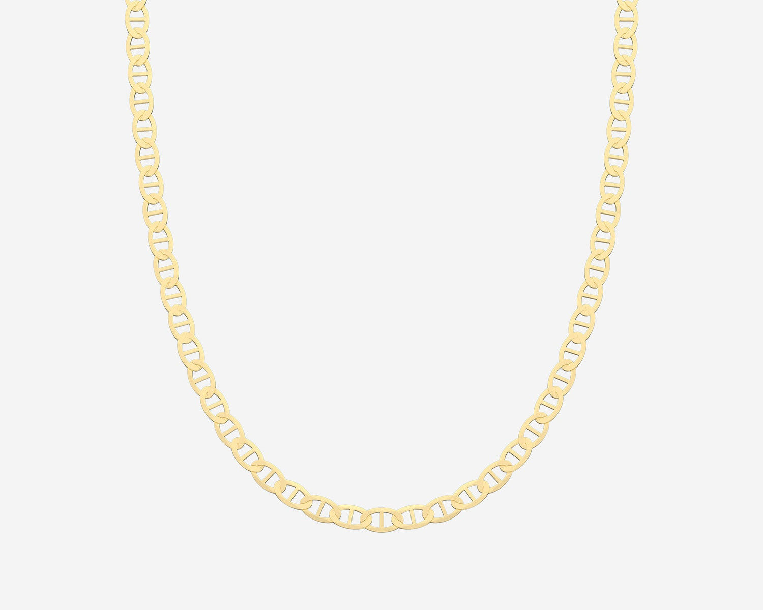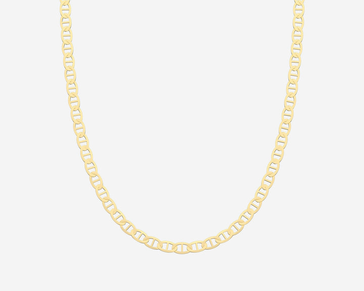 This Mariner Necklace by Holden is a 16-inch solid 14k yellow gold chain featuring the signature mariner link design. Measuring 3.25mm in width, it delivers a statement of classic elegance that pairs well with other jewelry or stands out alone. Crafted in New York City, it embodies sustainable luxury and timeless style.