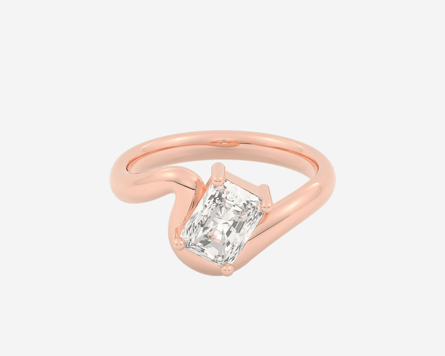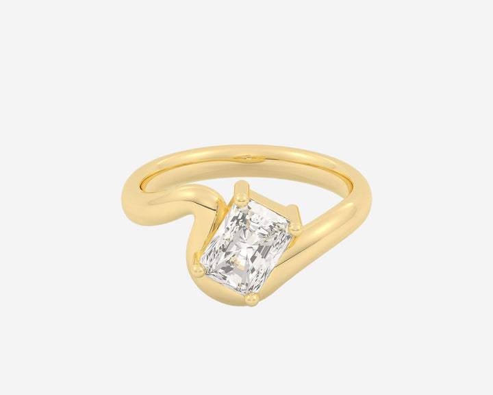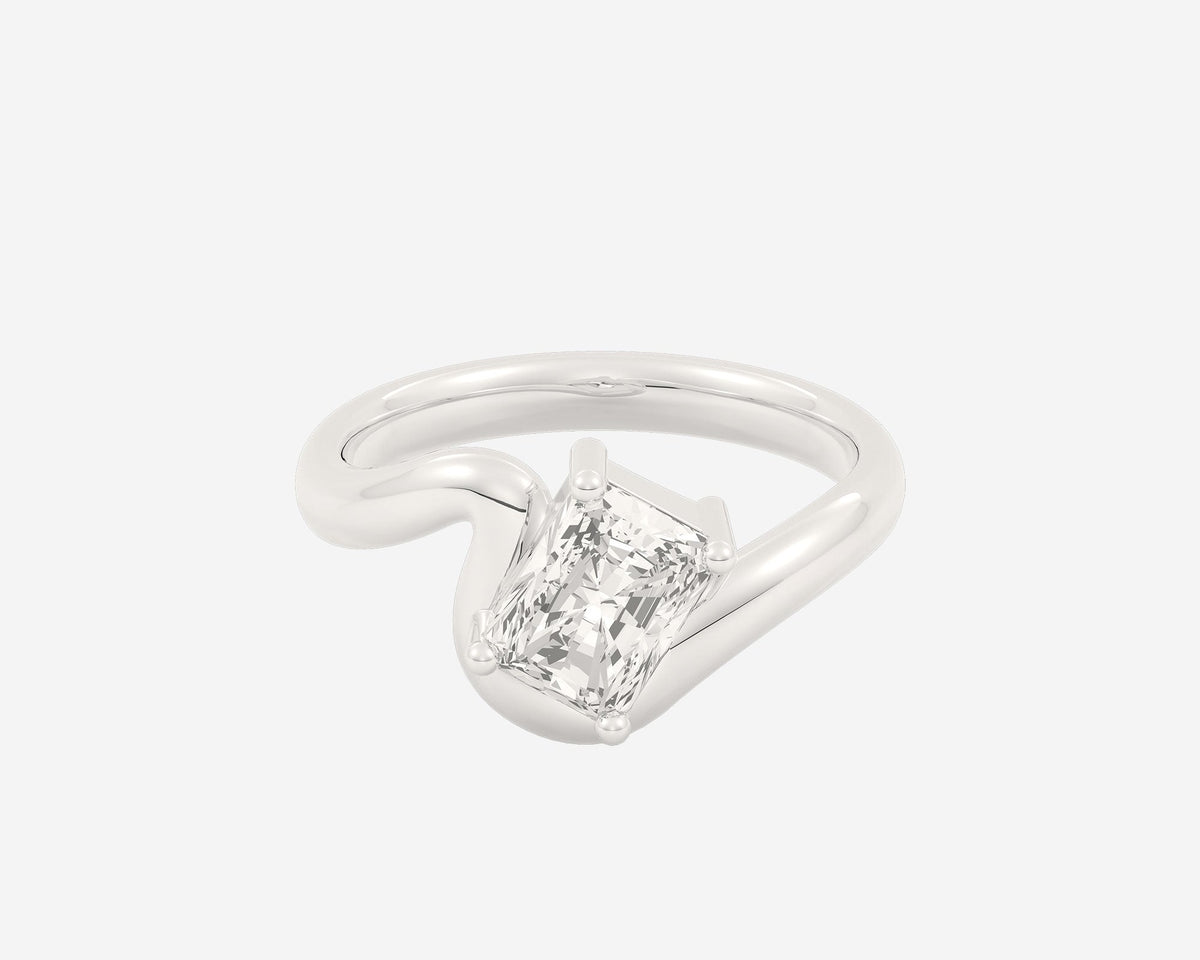 This Arc Solitaire — Radiant ring by Holden features a distinctive wave-shaped comfort-fit band paired with a lab-grown radiant-cut diamond secured by rounded prongs. Available in 14k or 18k yellow, white, or rose gold, or platinum, this ring blends modern design with classic sparkle, custom made with expert craftsmanship.