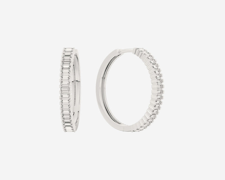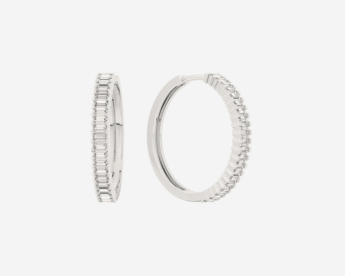 These Baguette Hoops by Holden radiate contemporary luxury with ethical lab-grown baguette diamonds set elegantly into 14k yellow gold. Their sleek 3mm width and secure clicker closure combine comfort with sophistication. Perfect for elevating any look, they symbolize clarity and timeless glamour, ideal for everyday elegance or special occasions.