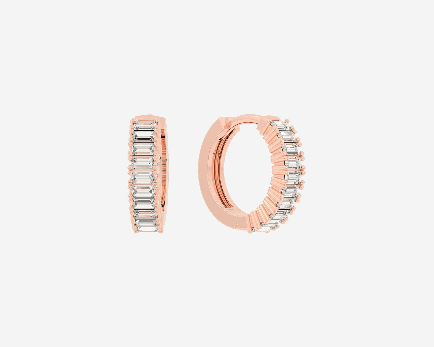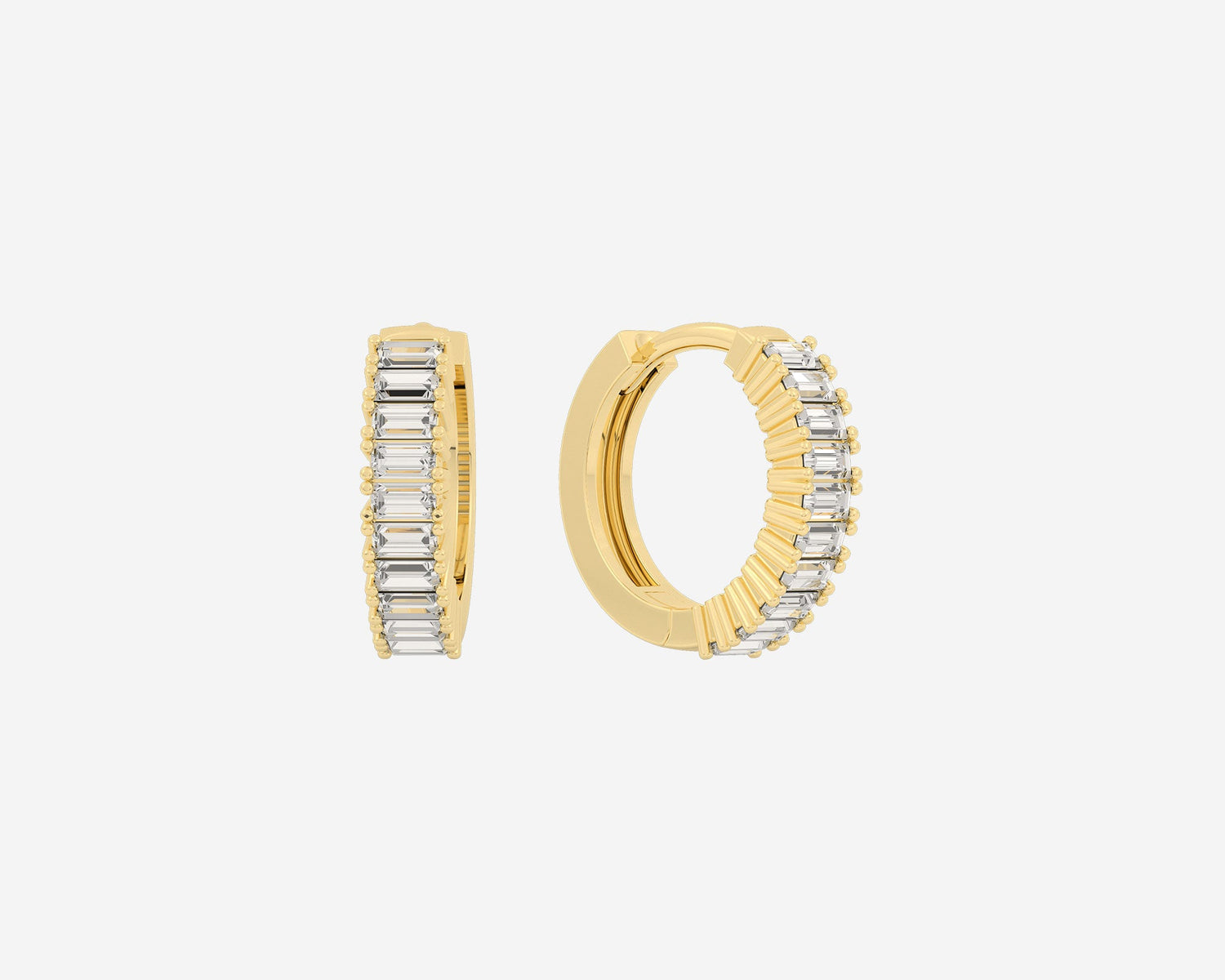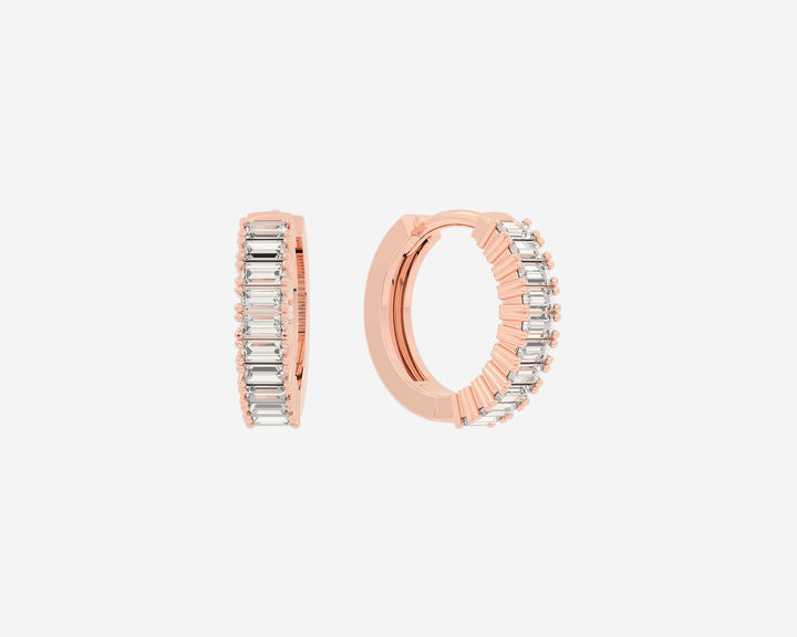 These Baguette Huggies by Holden are designed for subtle sparkle and everyday sophistication, featuring ethical lab-grown baguette diamonds set in 14k yellow gold. With a 3mm width and secure clicker closure, they offer comfort and style that can be worn alone or stacked for a personalized look.