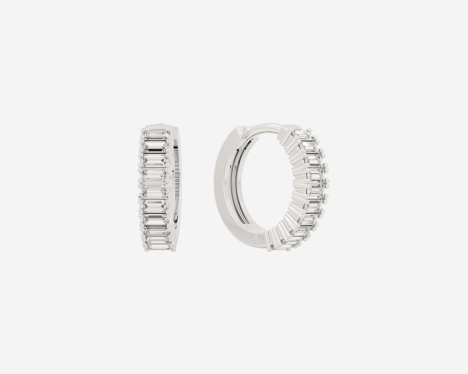 Handcrafted in 14k yellow gold with ethical lab-grown baguette diamonds. Measures 3mm wide. Features a clicker closure. Sold as a pair.