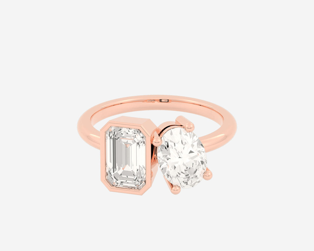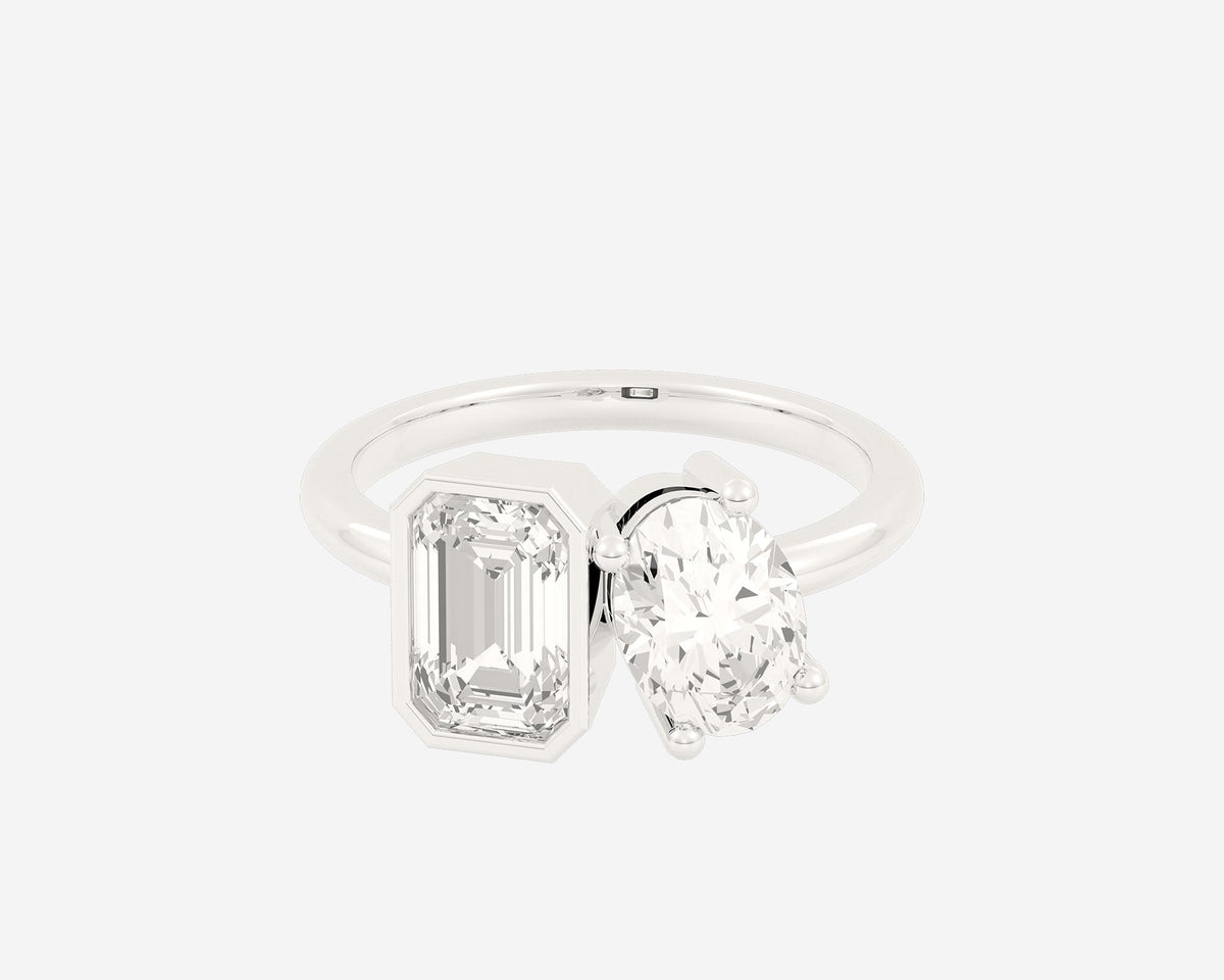 These Bezel Toi et Moi — Emerald/Oval by Holden combine an emerald and oval lab-grown diamond in a protective bezel setting, reflecting a timeless “You and Me” motif with modern sustainability.