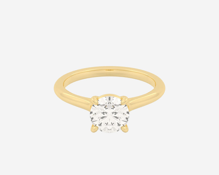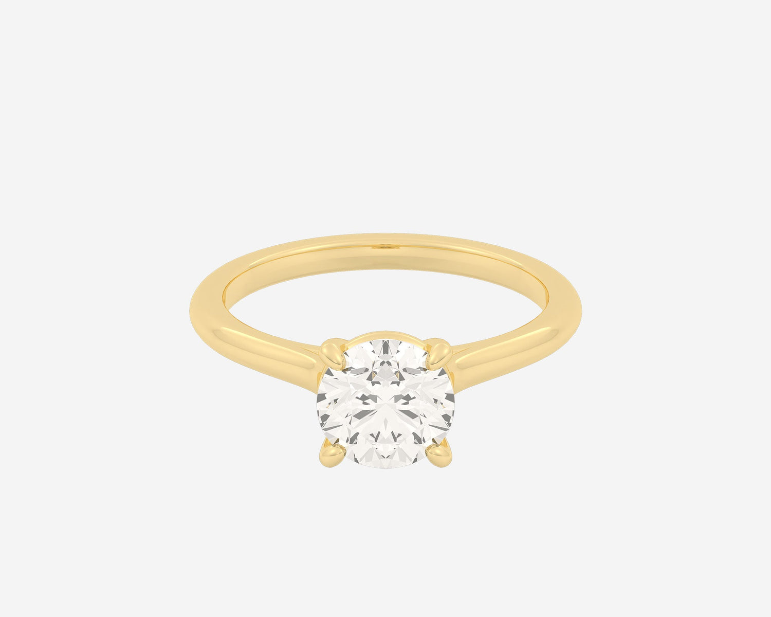 Handcrafted in 14k yellow gold, 2mm band width with four-prong set lab-grown round brilliant diamond.