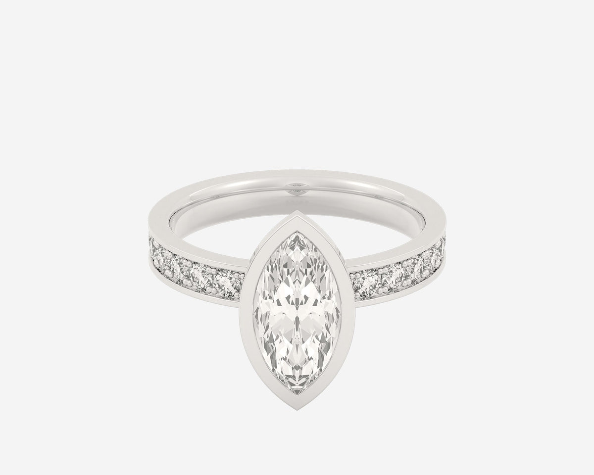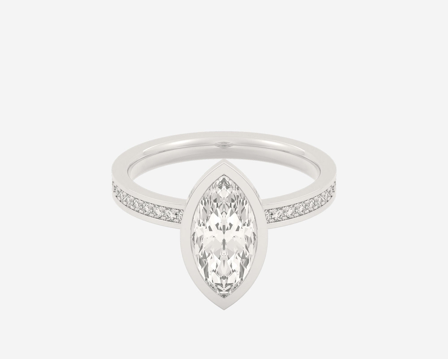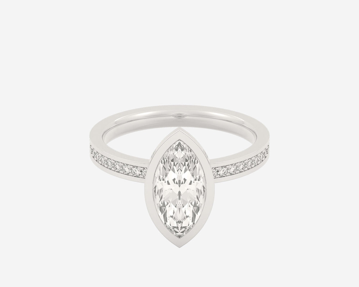 This Channel Eternity Bezel Solitaire Marquise by Holden features a marquise-cut lab-grown diamond framed by a continuous 2mm bezel channel band. The elongated shape and seamless setting symbolize elegance and eternal commitment, crafted with sustainable materials in NYC.