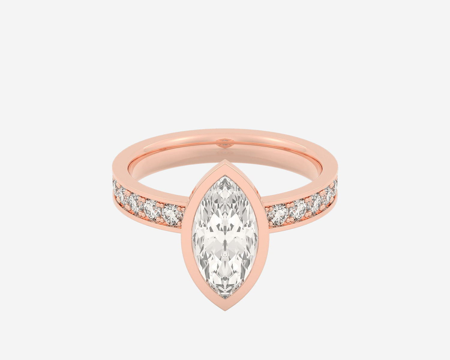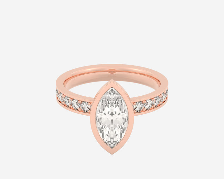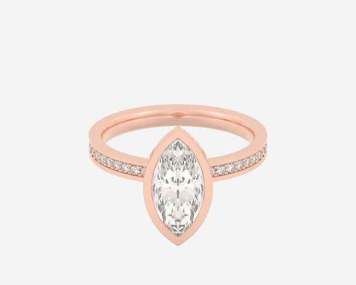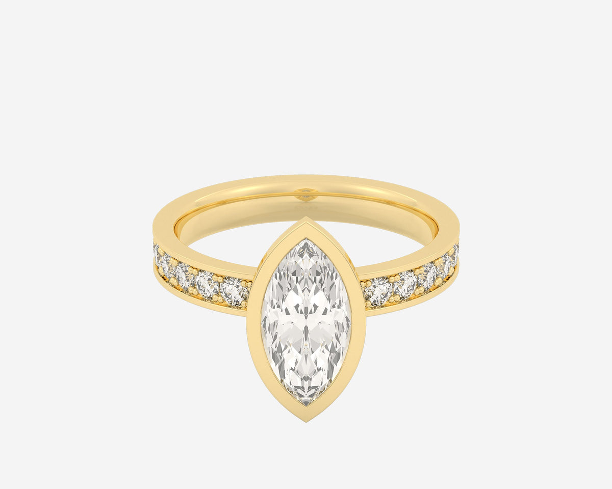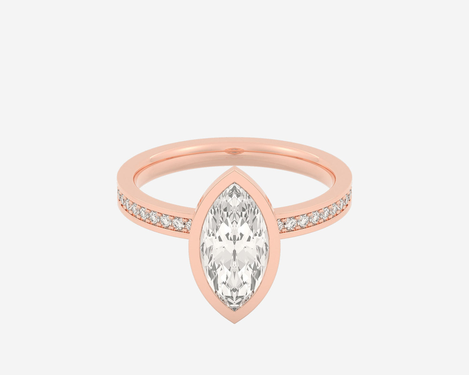 This Channel Eternity Bezel Solitaire Marquise by Holden features a marquise-cut lab-grown diamond framed by a continuous 2mm bezel channel band. The elongated shape and seamless setting symbolize elegance and eternal commitment, crafted with sustainable materials in NYC.