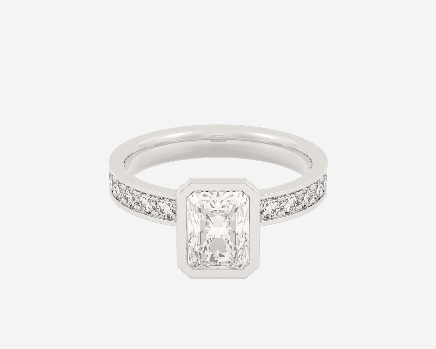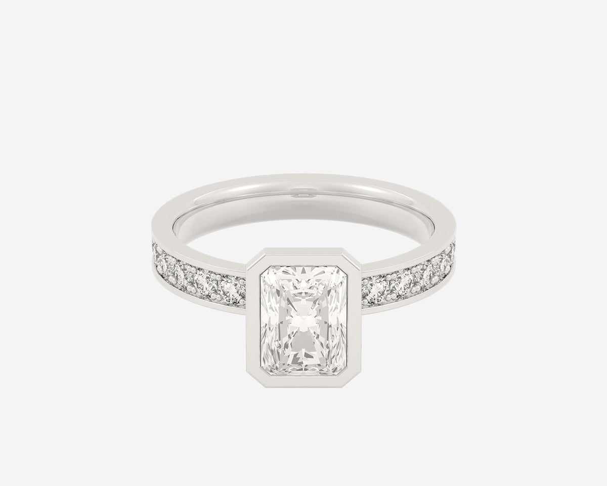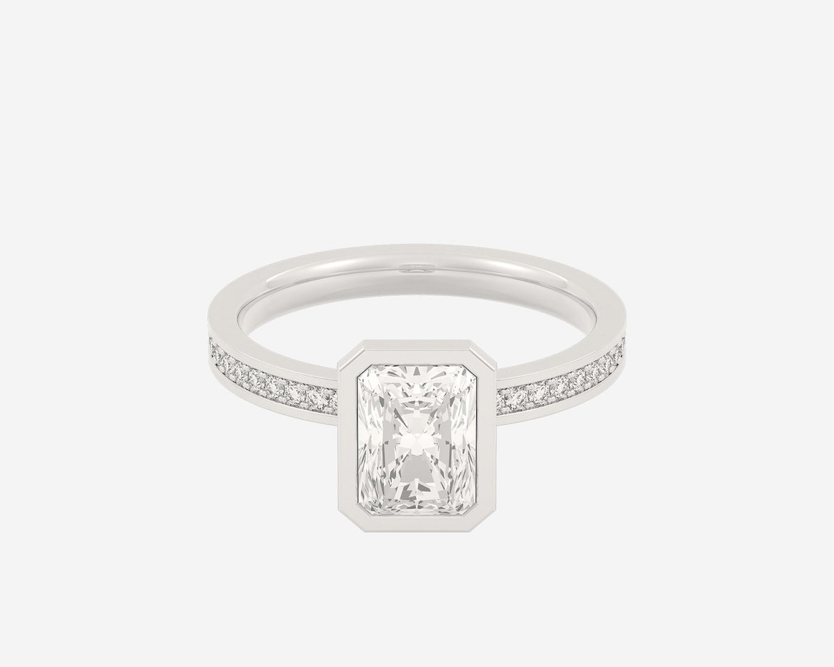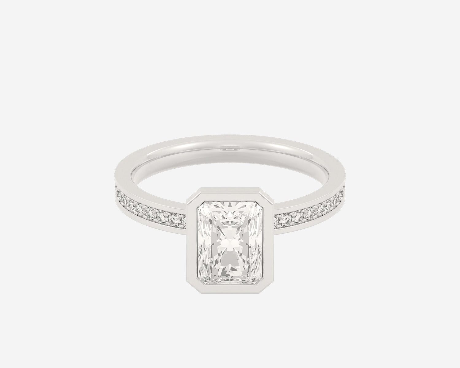 This Channel Eternity Bezel Solitaire Radiant by Holden showcases a radiant-cut lab-grown diamond framed by a 2mm bezel channel band. The radiant cut’s brilliance is enhanced by the sleek eternity setting, symbolizing vibrant love and lasting elegance with responsible craftsmanship.