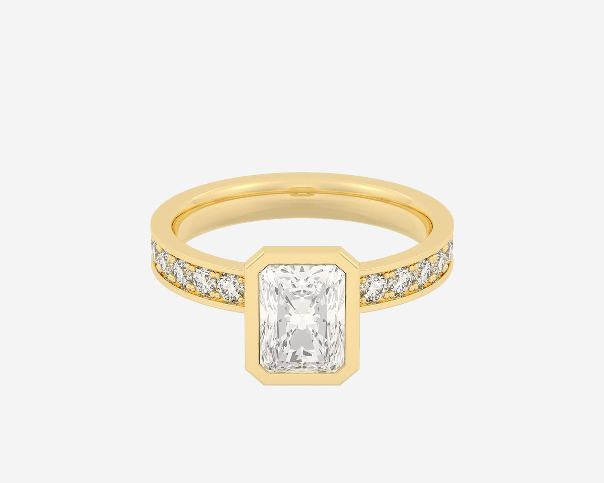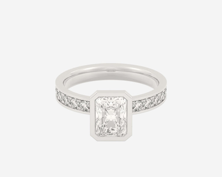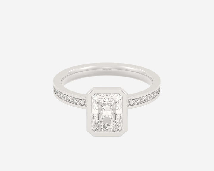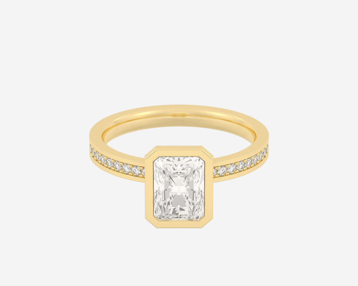 This Channel Eternity Bezel Solitaire Radiant by Holden showcases a radiant-cut lab-grown diamond framed by a 2mm bezel channel band. The radiant cut’s brilliance is enhanced by the sleek eternity setting, symbolizing vibrant love and lasting elegance with responsible craftsmanship.