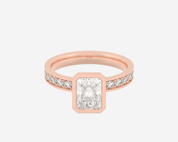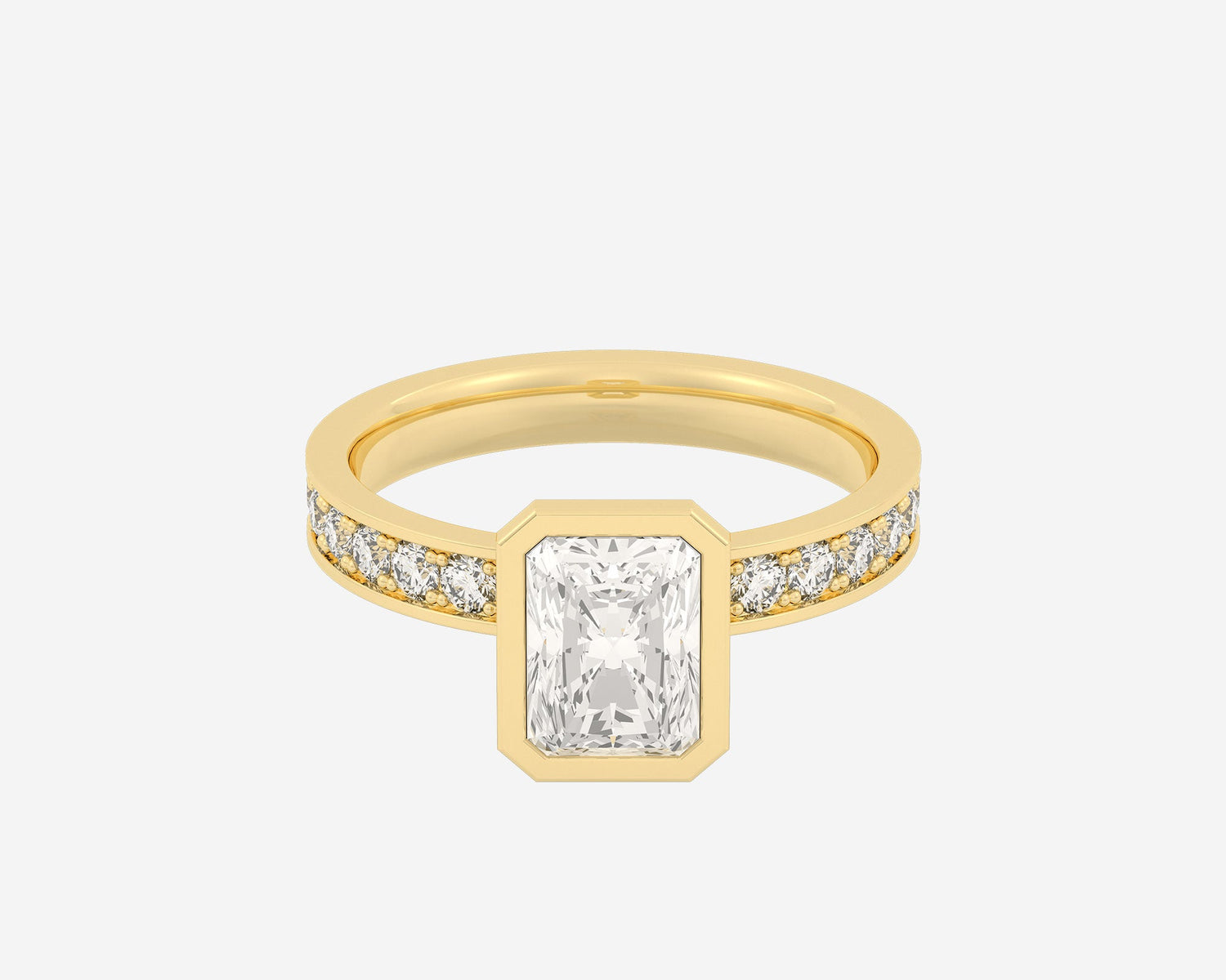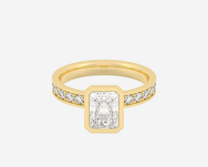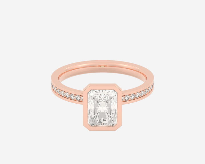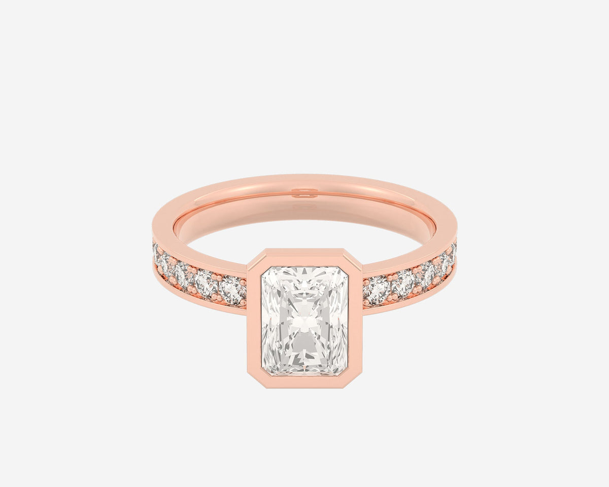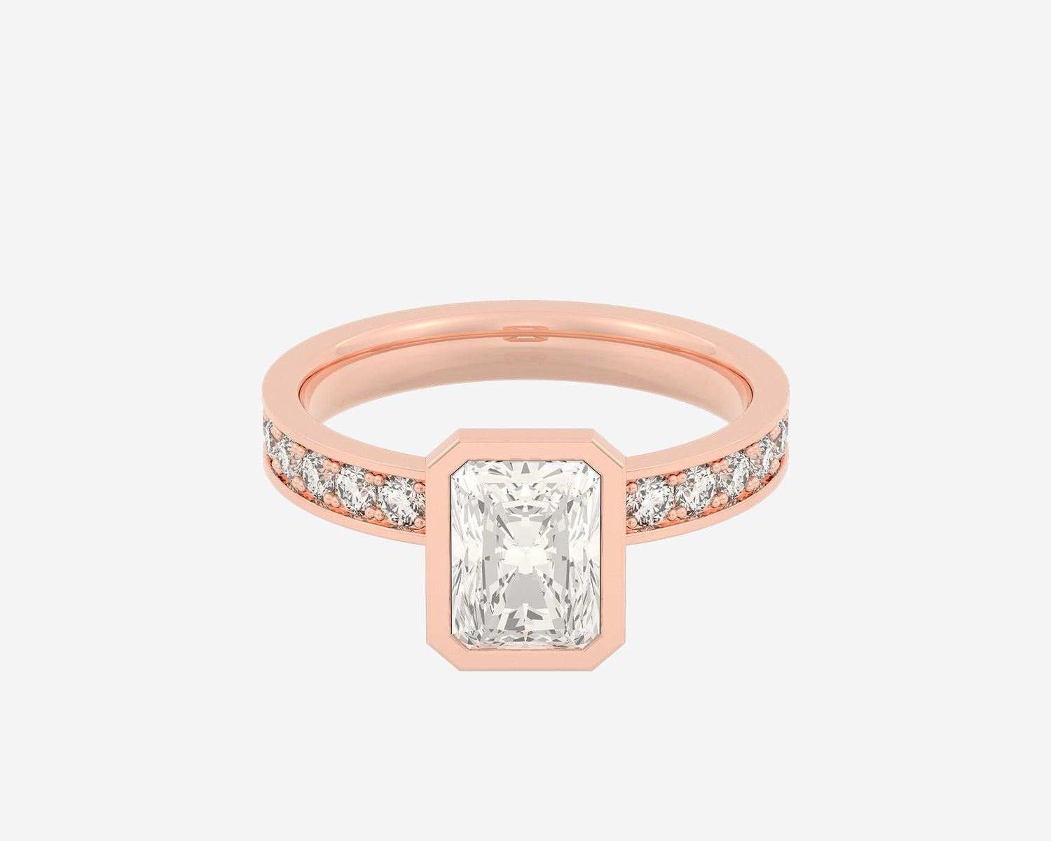 This Channel Eternity Bezel Solitaire Radiant by Holden showcases a radiant-cut lab-grown diamond framed by a 2mm bezel channel band. The radiant cut’s brilliance is enhanced by the sleek eternity setting, symbolizing vibrant love and lasting elegance with responsible craftsmanship.