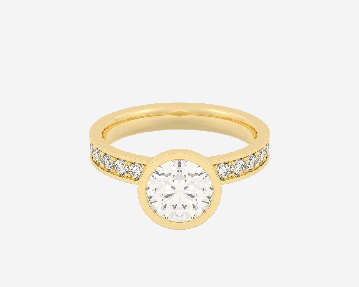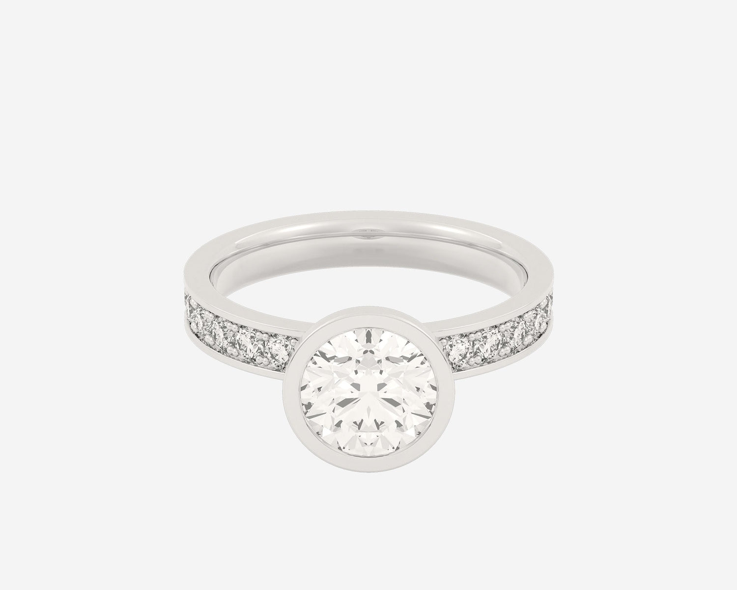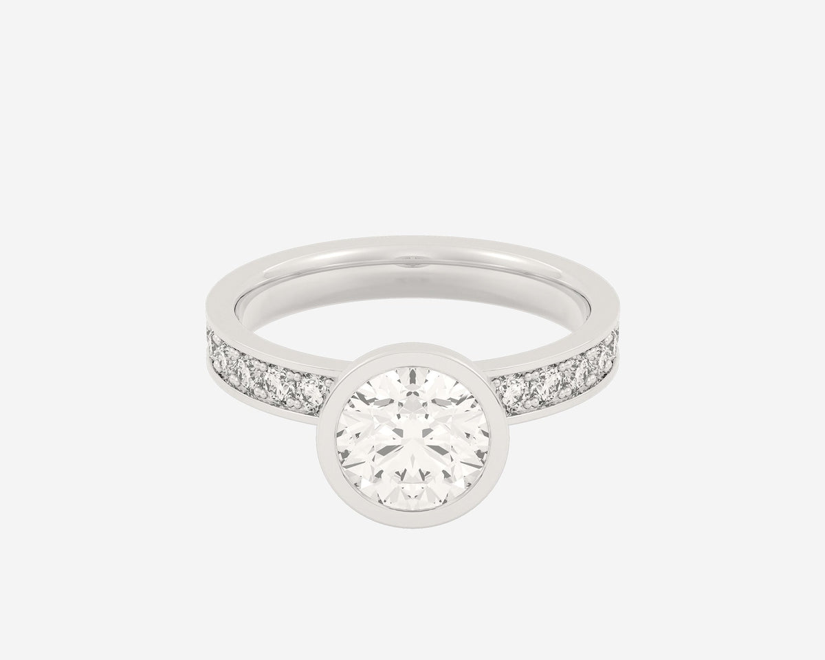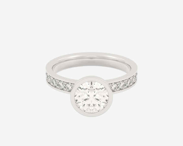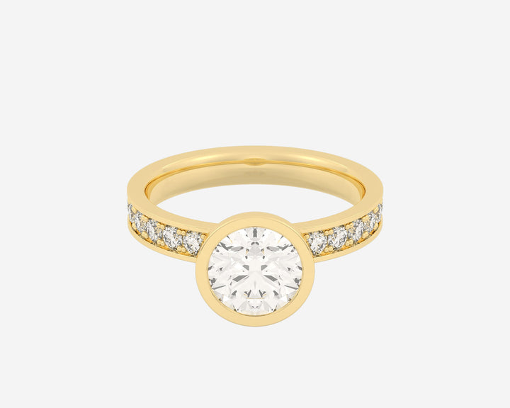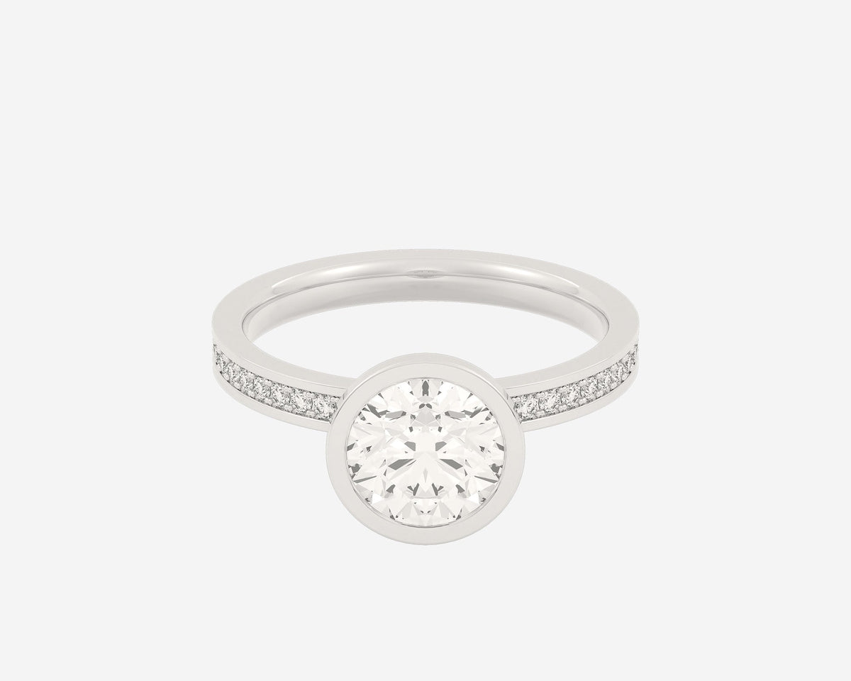 This Channel Eternity Bezel Solitaire Round by Holden showcases a round lab-grown diamond set within a continuous 2mm bezel channel band, creating an elegant and secure design. The ring reflects timeless commitment and modern luxury with sustainable and ethical craftsmanship.