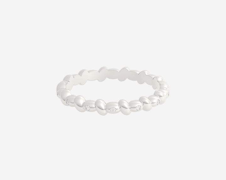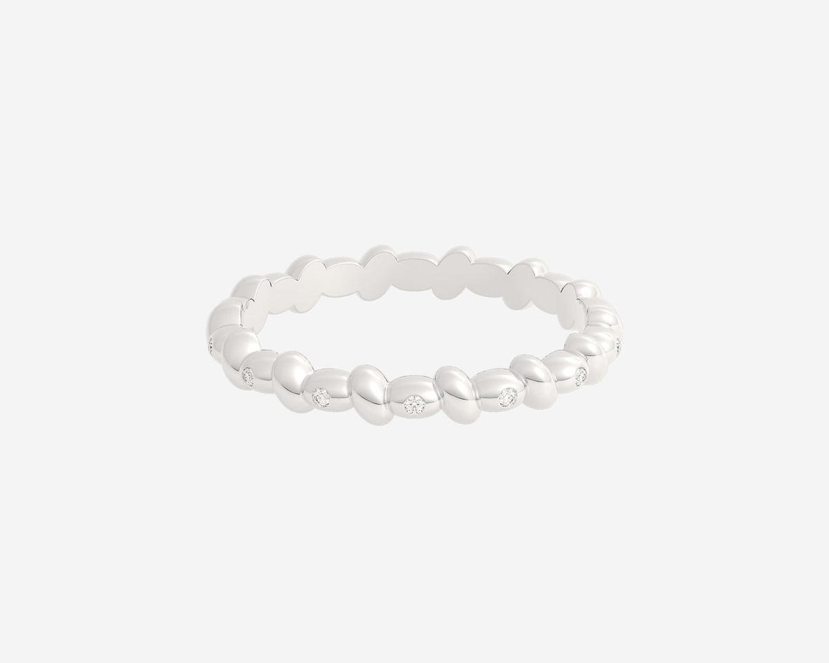 This Diamond Bubble ring by Holden adds playful charm to any ring stack with subtle lab-grown diamonds and a distinctive bubble texture. Available in recycled gold or platinum, this 2.75mm band is perfect as a unique wedding band or a fun, stackable everyday piece, handcrafted to order with attention to detail and sustainability.