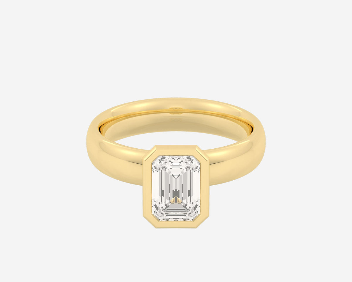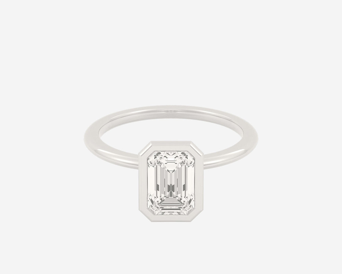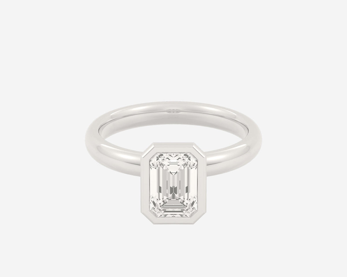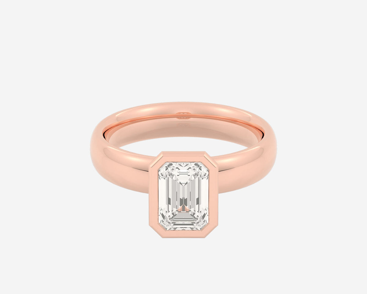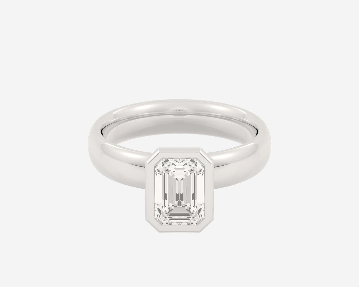 This Domed Bezel Solitaire Emerald by Holden highlights the emerald-cut diamond framed by a domed bezel setting that provides secure protection and elevates the stone’s architectural beauty. The 1.5mm band balances strength and refinement, embodying classic elegance with a modern twist. Crafted sustainably in NYC.