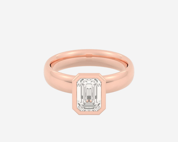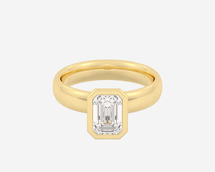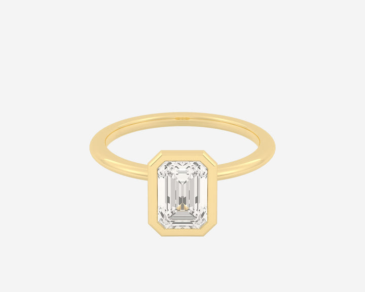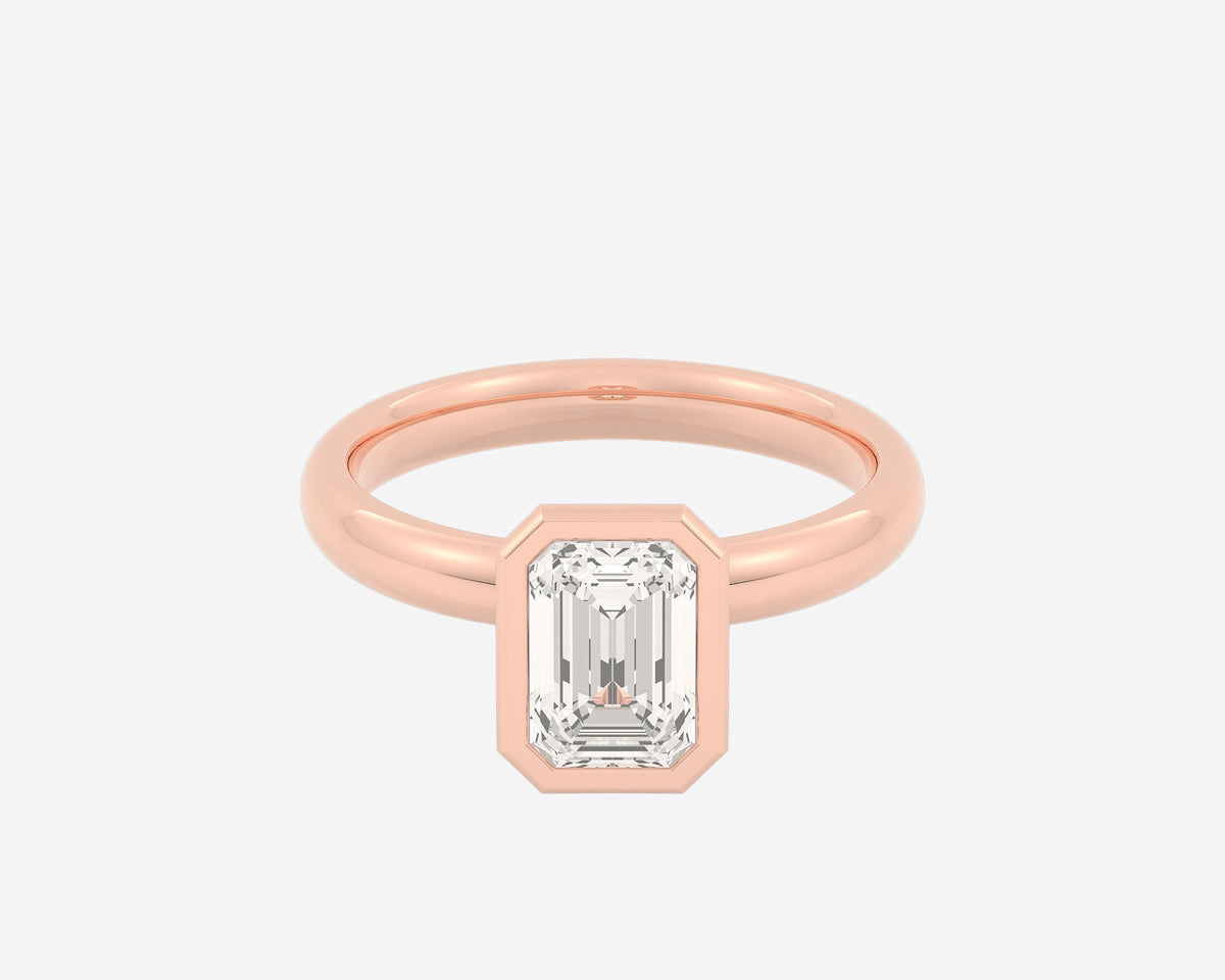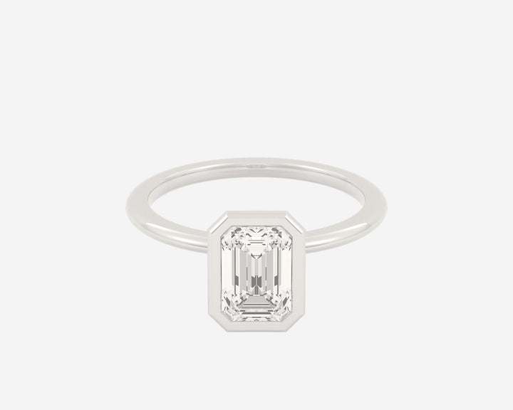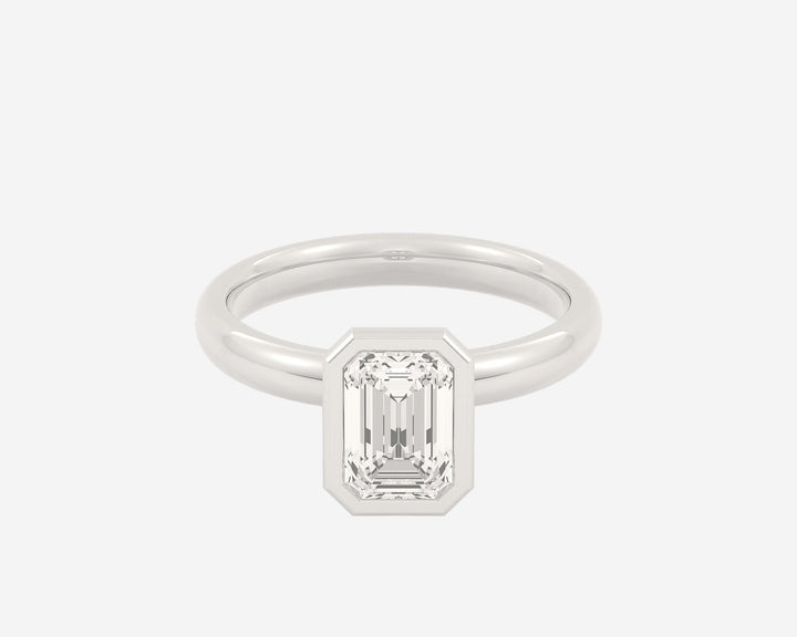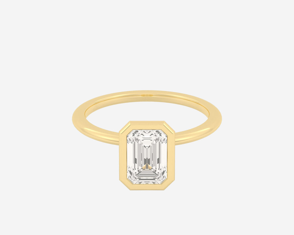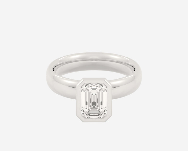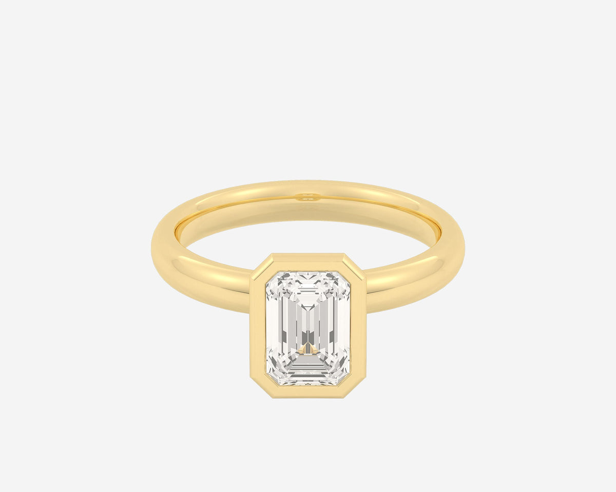 This Domed Bezel Solitaire Emerald by Holden highlights the emerald-cut diamond framed by a domed bezel setting that provides secure protection and elevates the stone’s architectural beauty. The 1.5mm band balances strength and refinement, embodying classic elegance with a modern twist. Crafted sustainably in NYC.