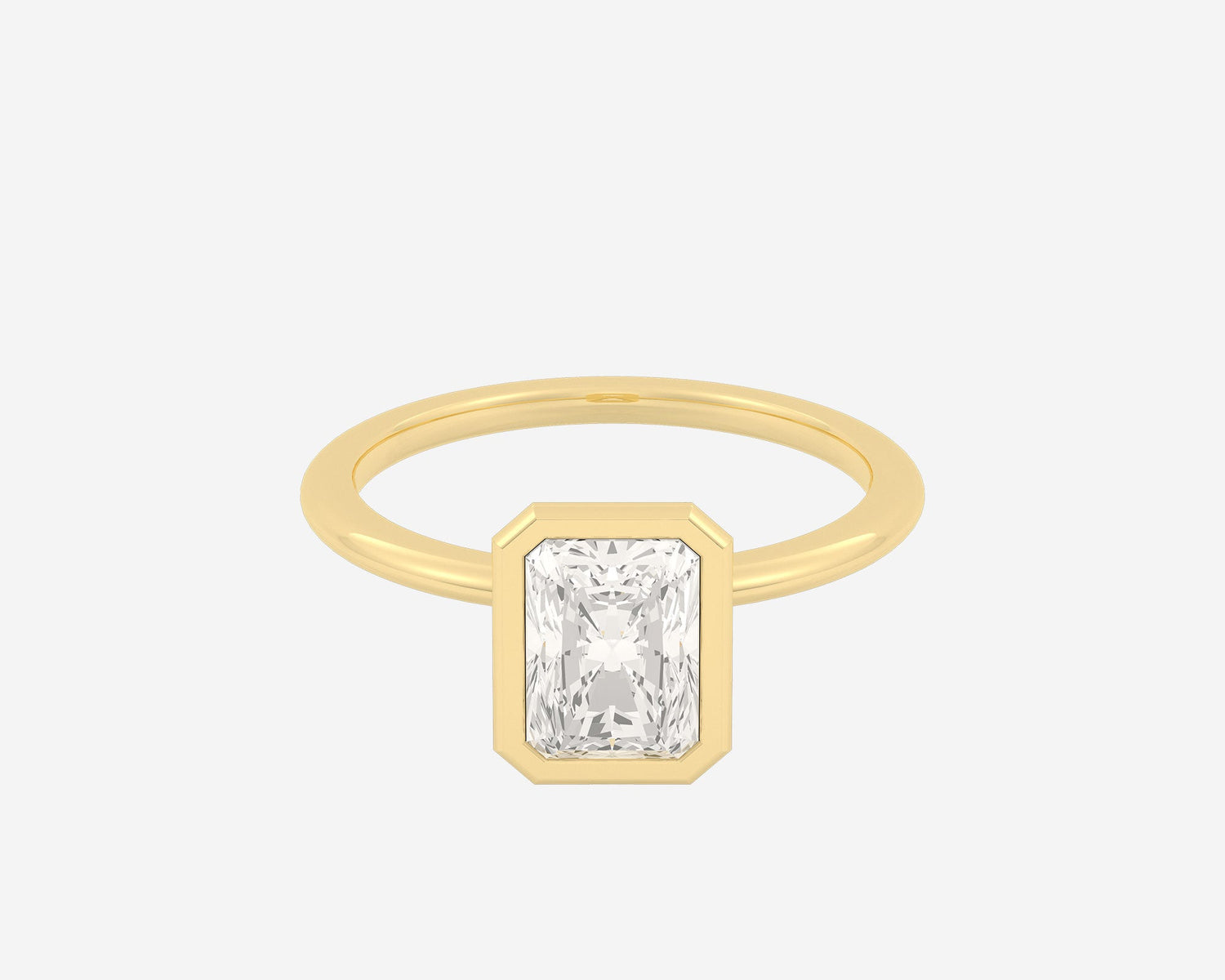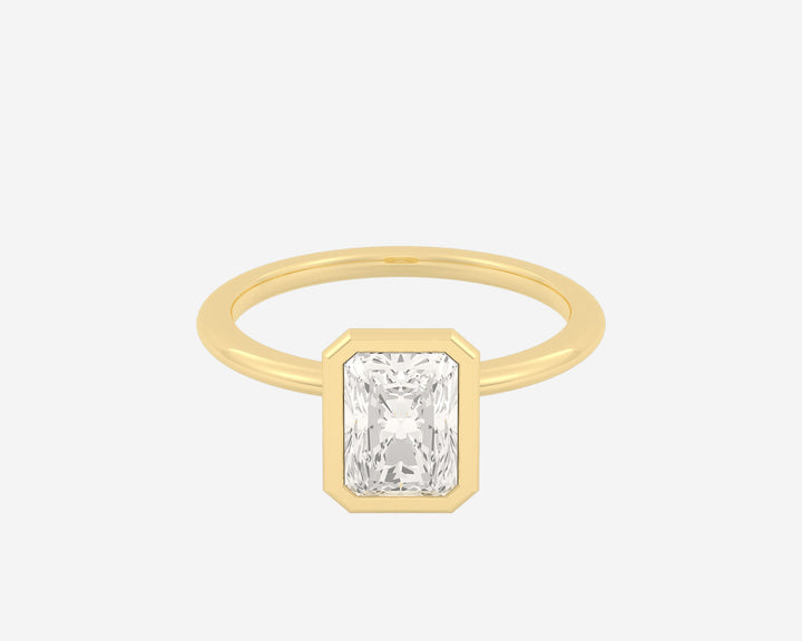 Handcrafted in 14k yellow gold with a radiant-cut lab-grown diamond. Band width measures 1.5mm. Made from recycled metals and ethical lab-grown diamonds, crafted in NYC.