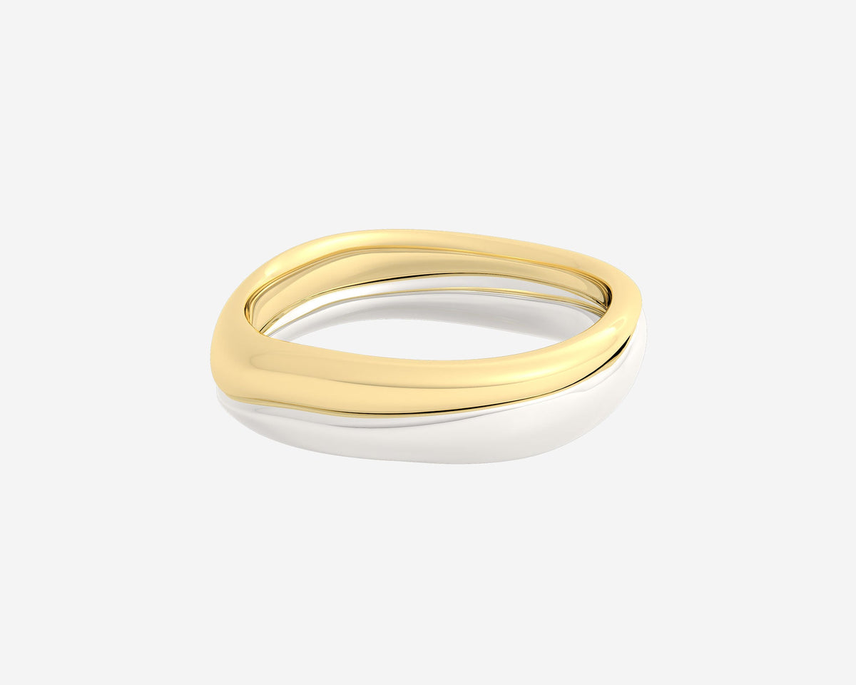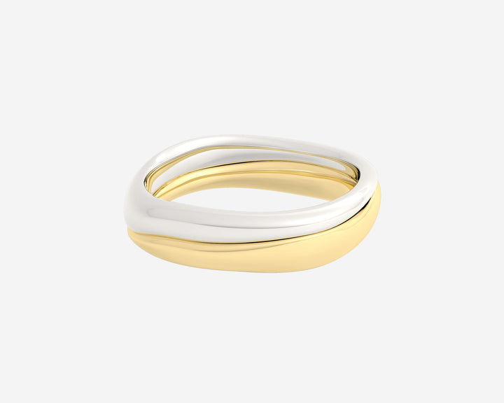 These Duo Melt rings by Holden present a two-tone stackable ring set handcrafted from recycled 10k yellow gold. Featuring a sleek, organic design, these rings are perfect for layering or wearing solo, embodying modern minimalism and versatile elegance. Each set is crafted to order in NYC with an emphasis on sustainability and craftsmanship.