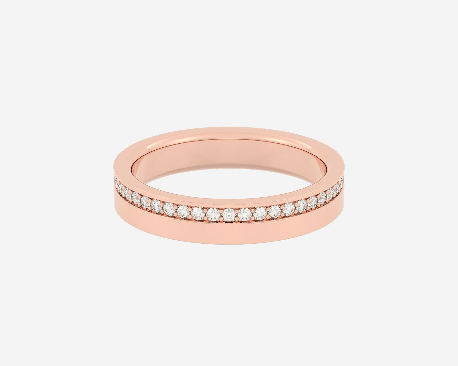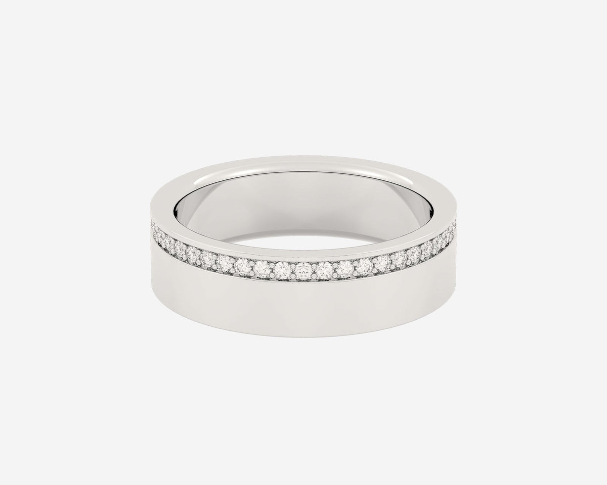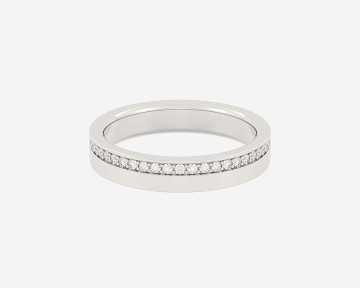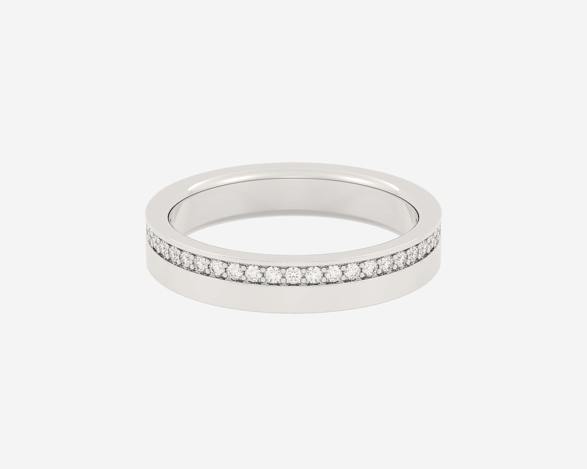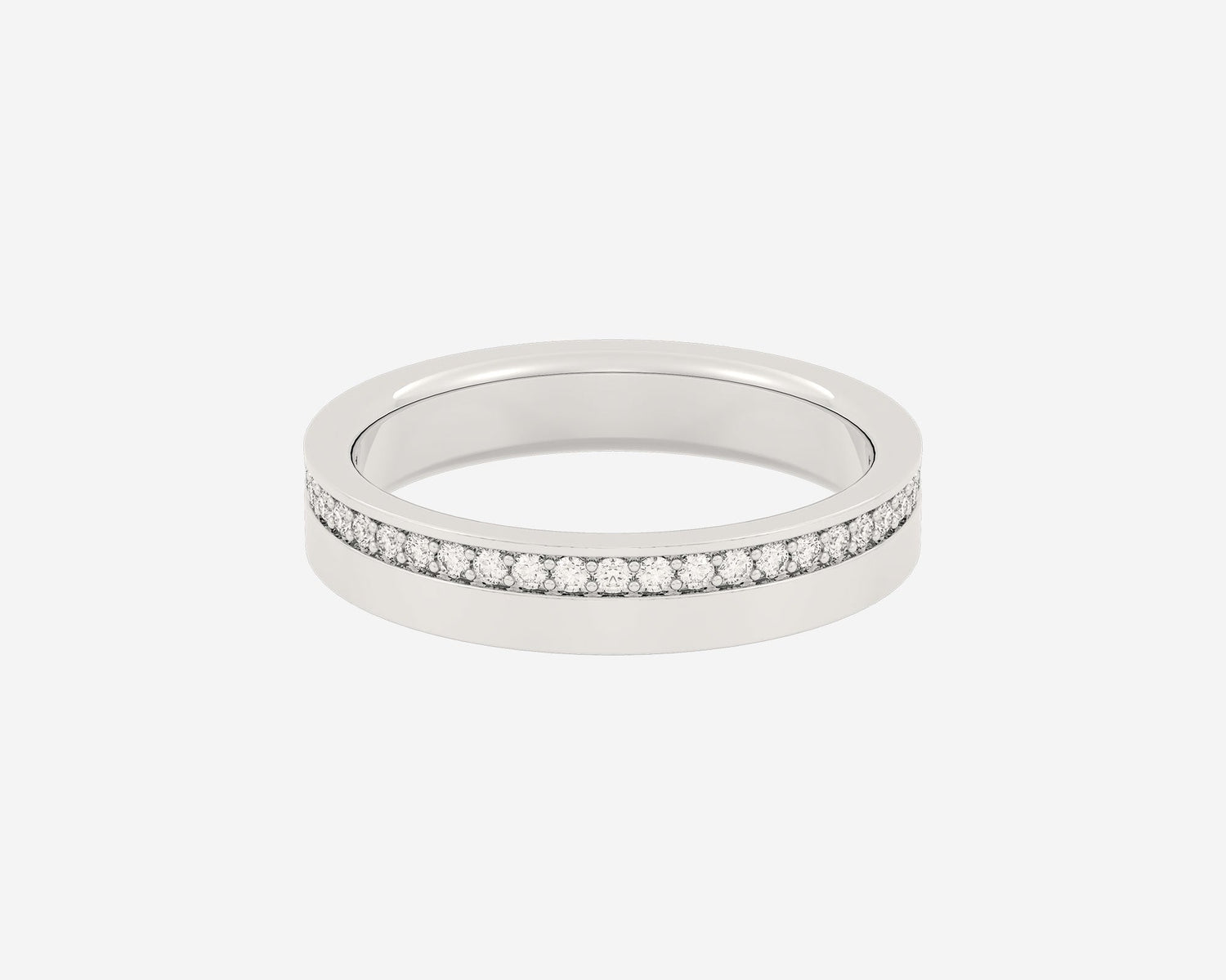 This Edge Eternity ring by Holden is a bold yet refined statement piece featuring a continuous row of brilliant round-cut lab-grown diamonds encircling a recycled gold or platinum band. Finished in either matte or mirror polish, it symbolizes eternal love and strength. Custom-made with expert craftsmanship for a personalized luxury experience.