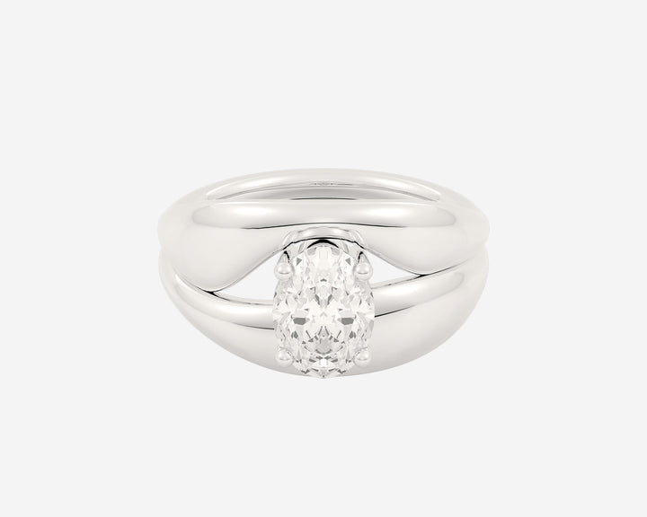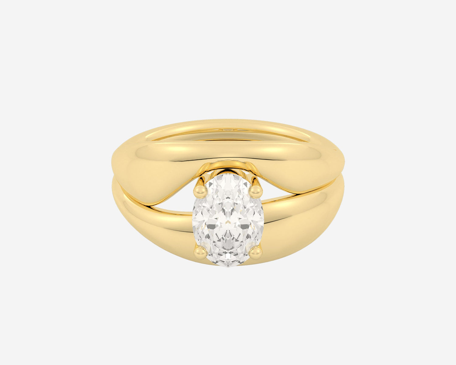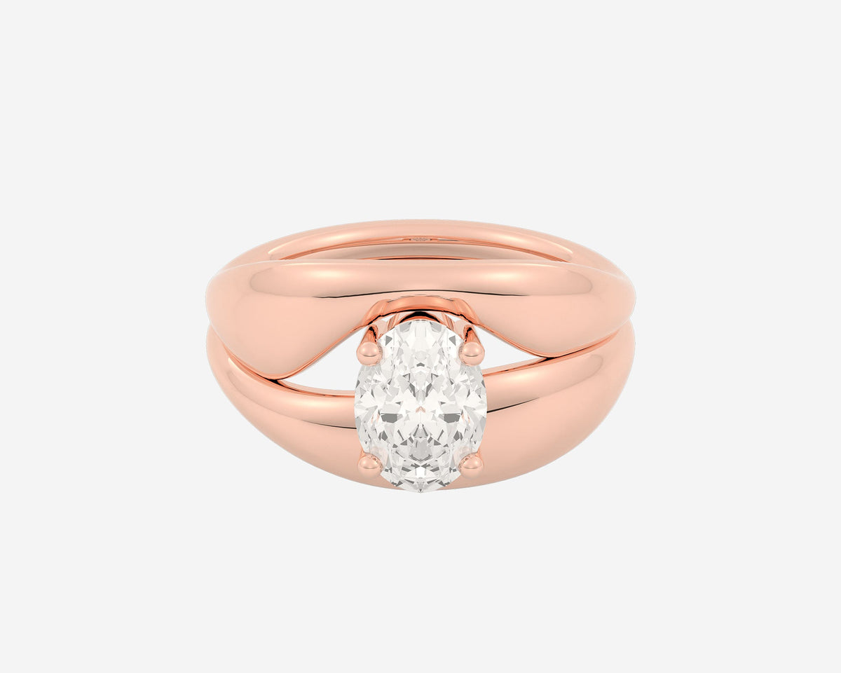 This Embrace Solitaire Set — Oval by Holden features a wedding band and solitaire engagement ring with non-traditional curved comfort-fit bands that seamlessly meld like a warm embrace. The engagement ring highlights an oval-cut lab-grown diamond set with round prongs, perfect for wearing together or sharing as a symbol of affection and harmony. This set is a modern expression of partnership and style.