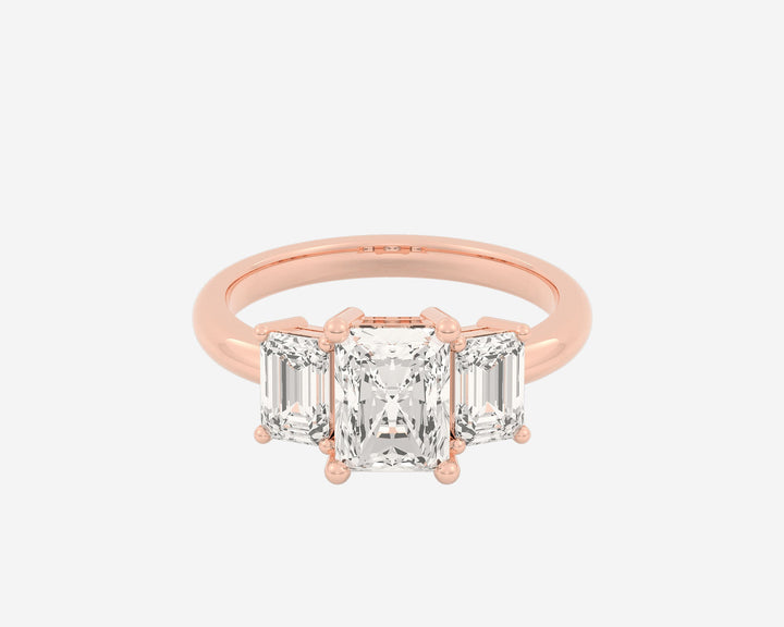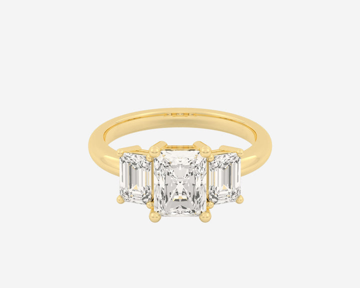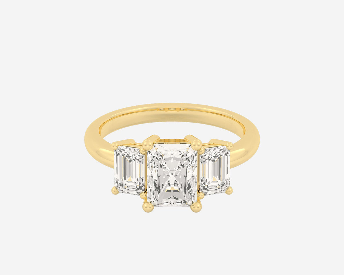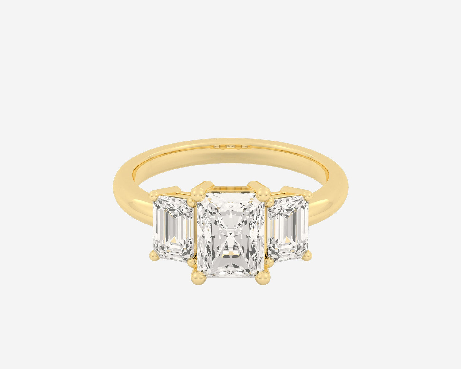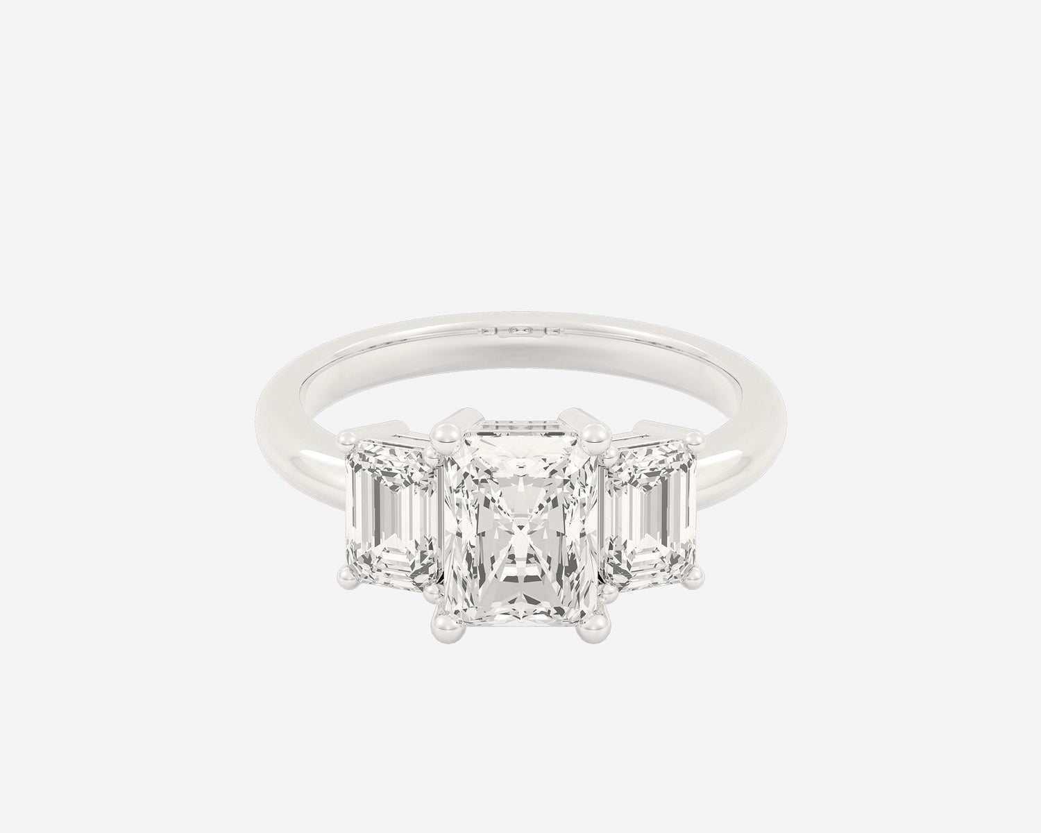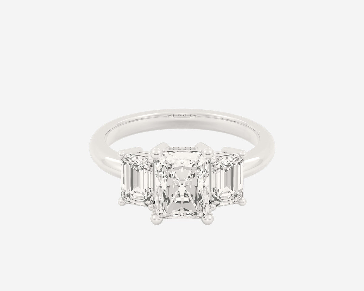These Emerald 3-Stone — Radiant by Holden fuse the timeless elegance of the emerald three-stone setting with radiant-cut diamonds, offering a brilliant play of light and color. This piece carries the symbolism of transformation and vibrant love, meticulously crafted using sustainable recycled metals and ethical lab-grown stones, perfect for a bold yet classic statement.