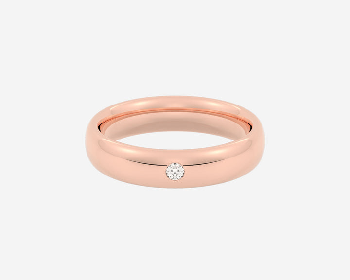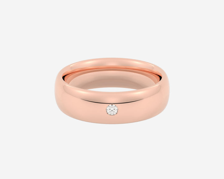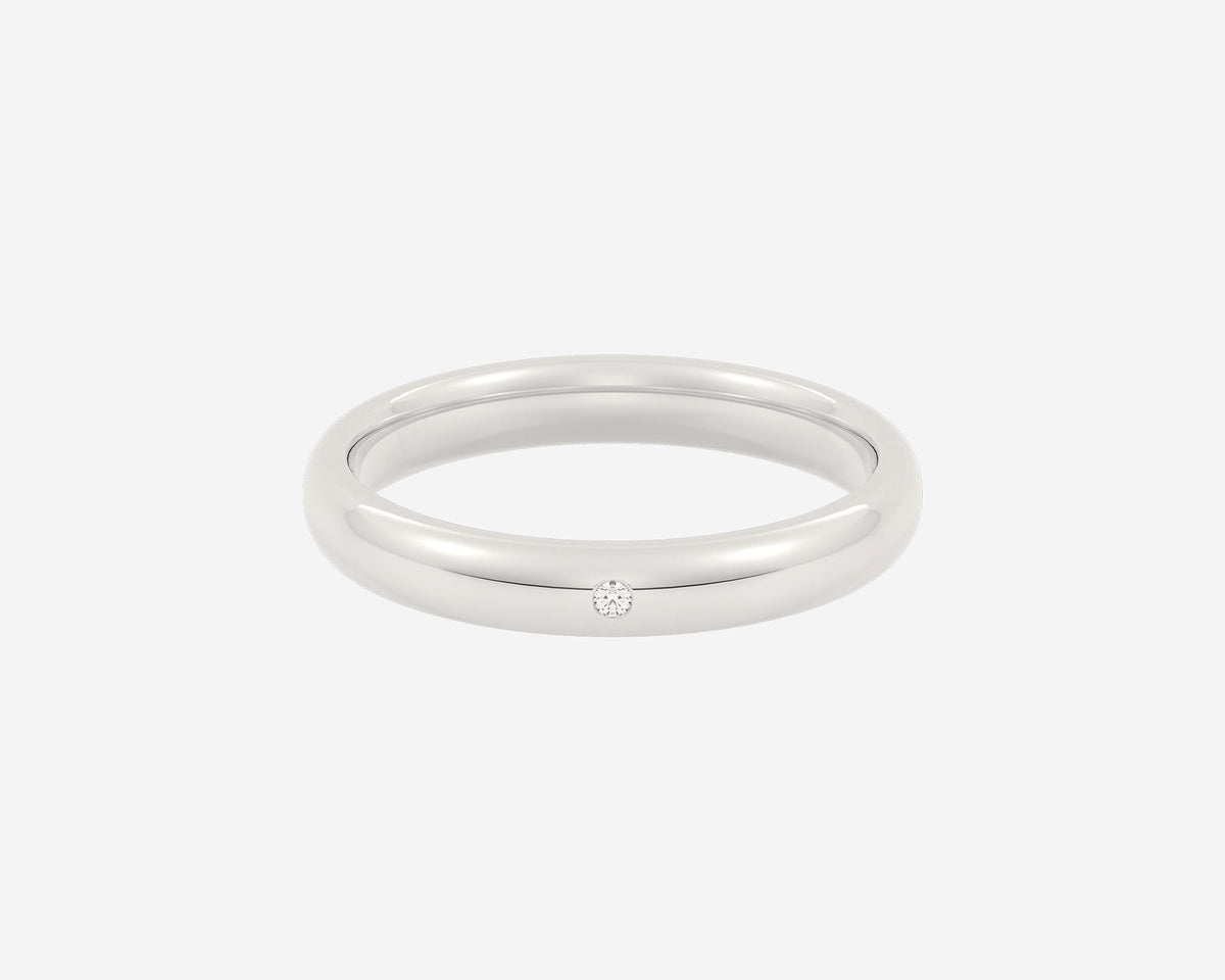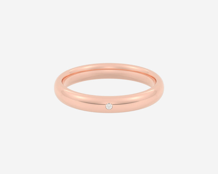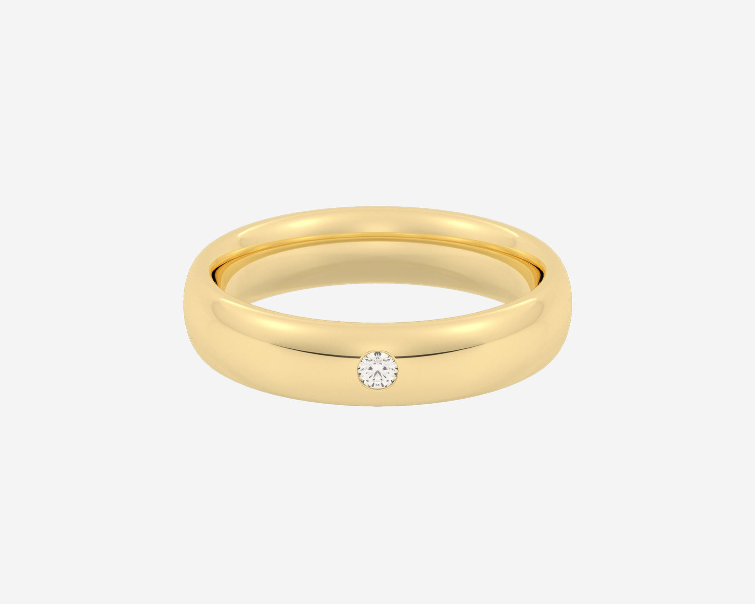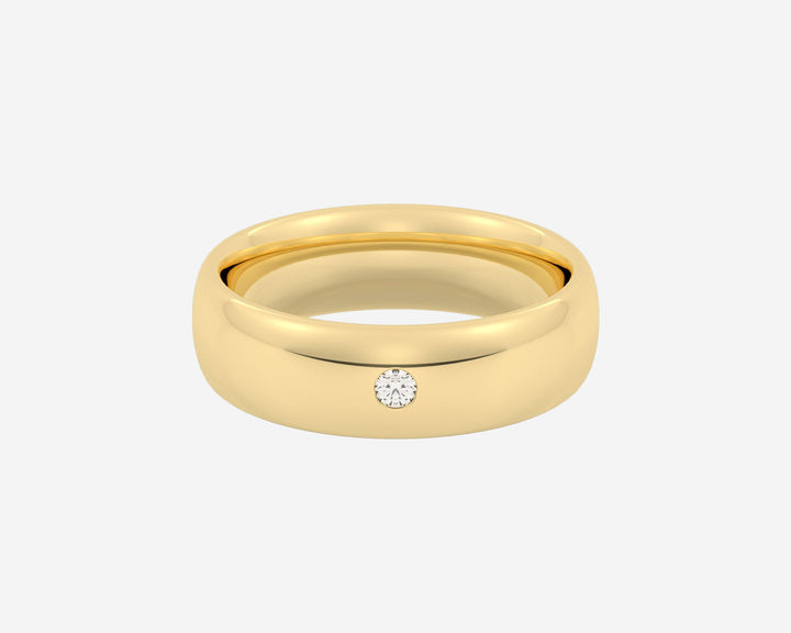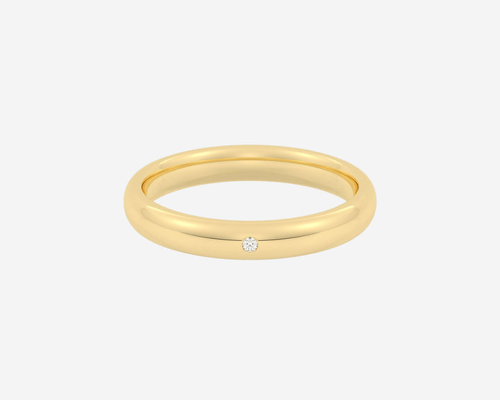Handcrafted in 10k yellow gold, 3mm width with a single lab-grown diamond (E-G color, VS clarity) set flush. Made with conflict-free recycled metals and a unisex, comfort-fit design.