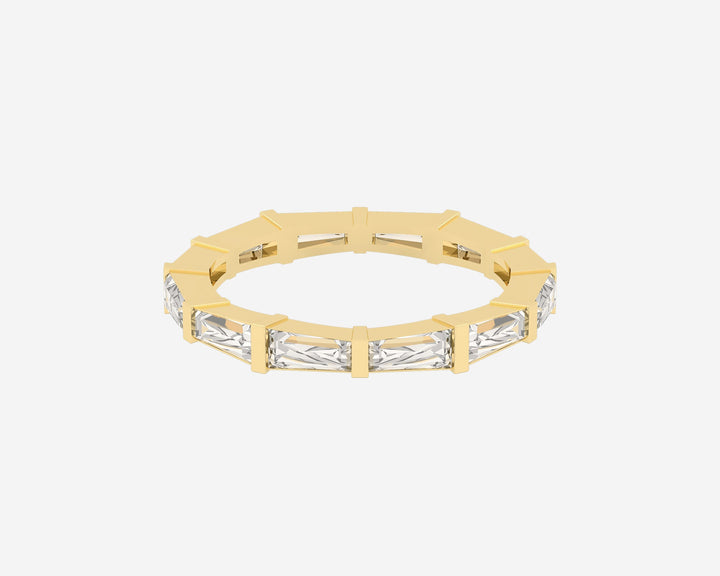 Handcrafted in 14k yellow gold with tapered baguette lab-grown diamonds. Band width measures 3mm. Made from recycled metals and ethical lab-grown diamonds, crafted in NYC.