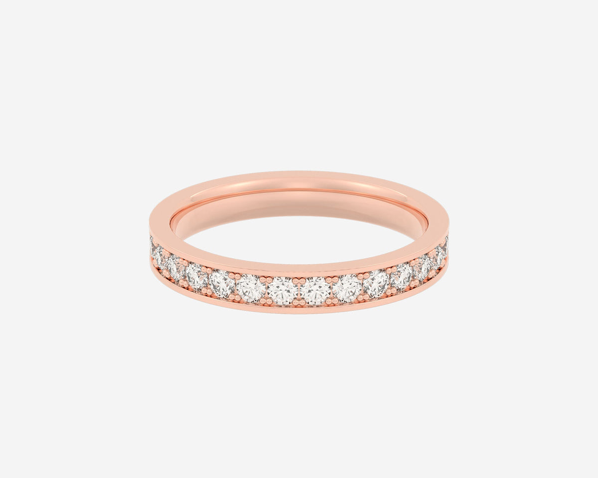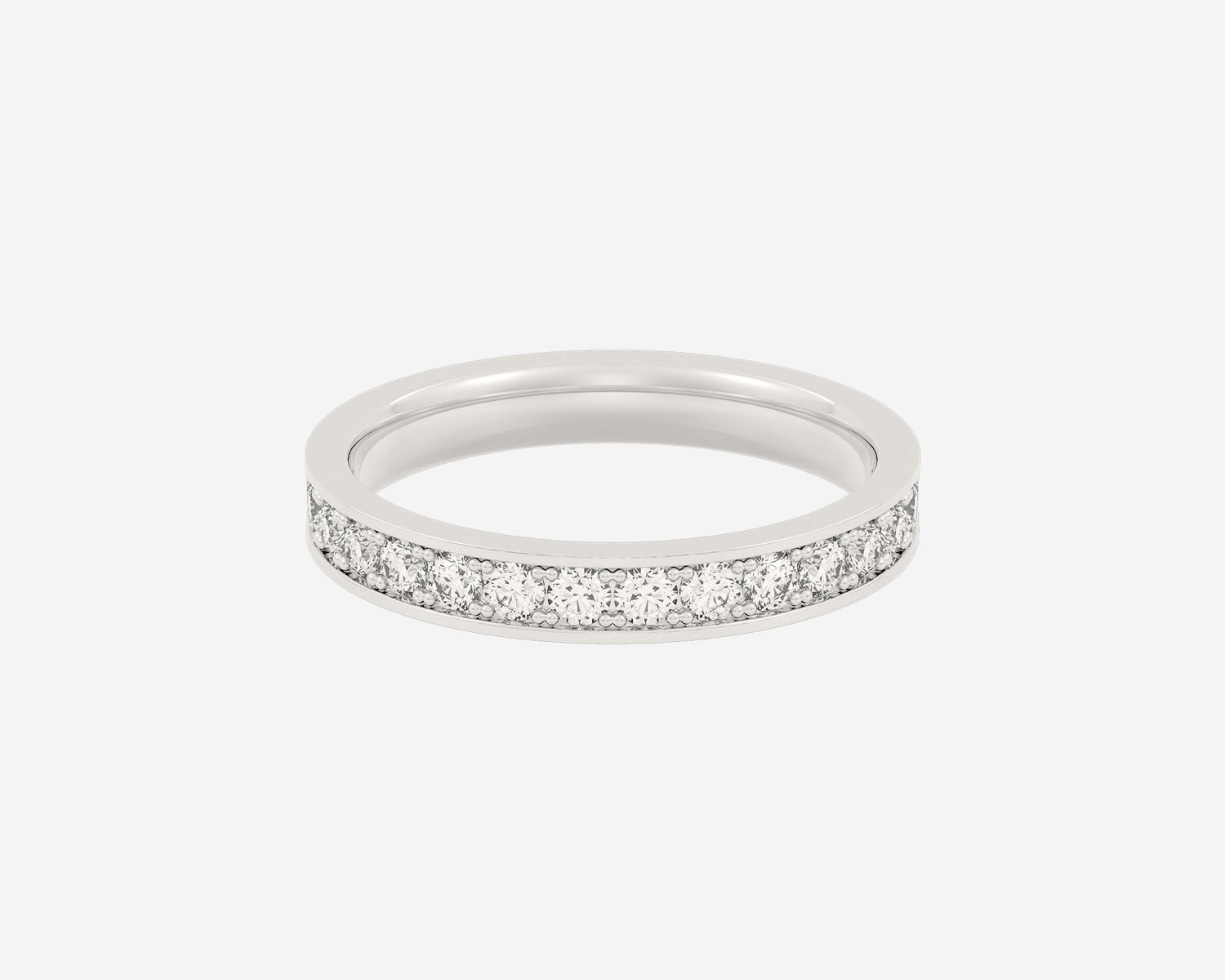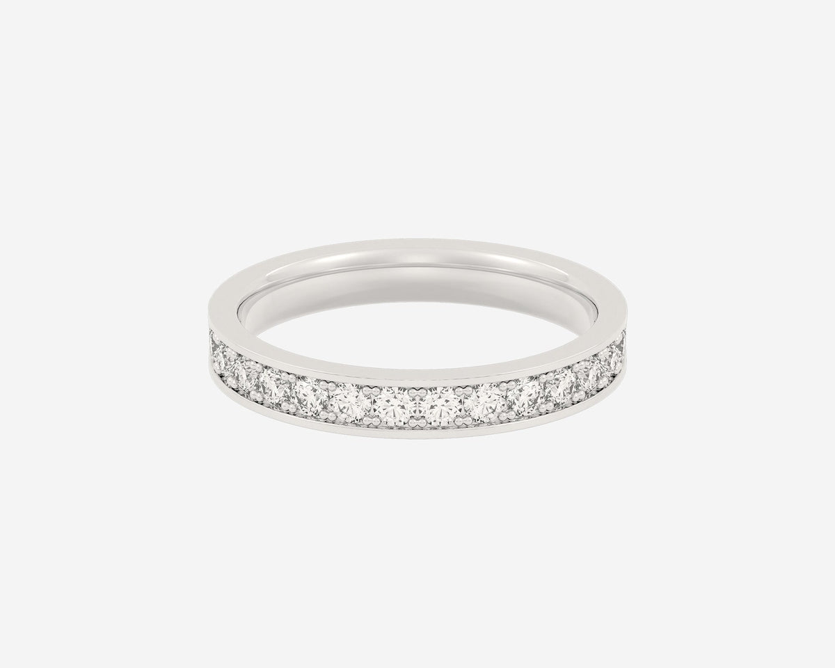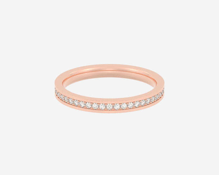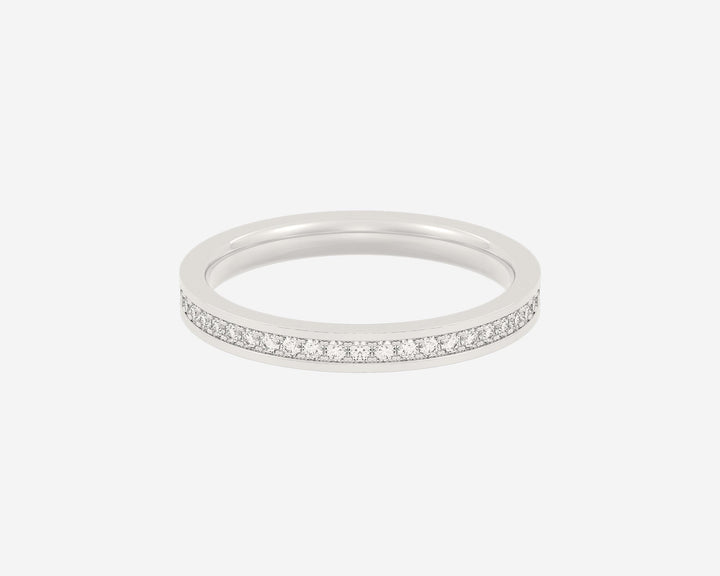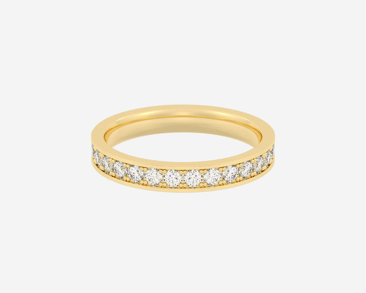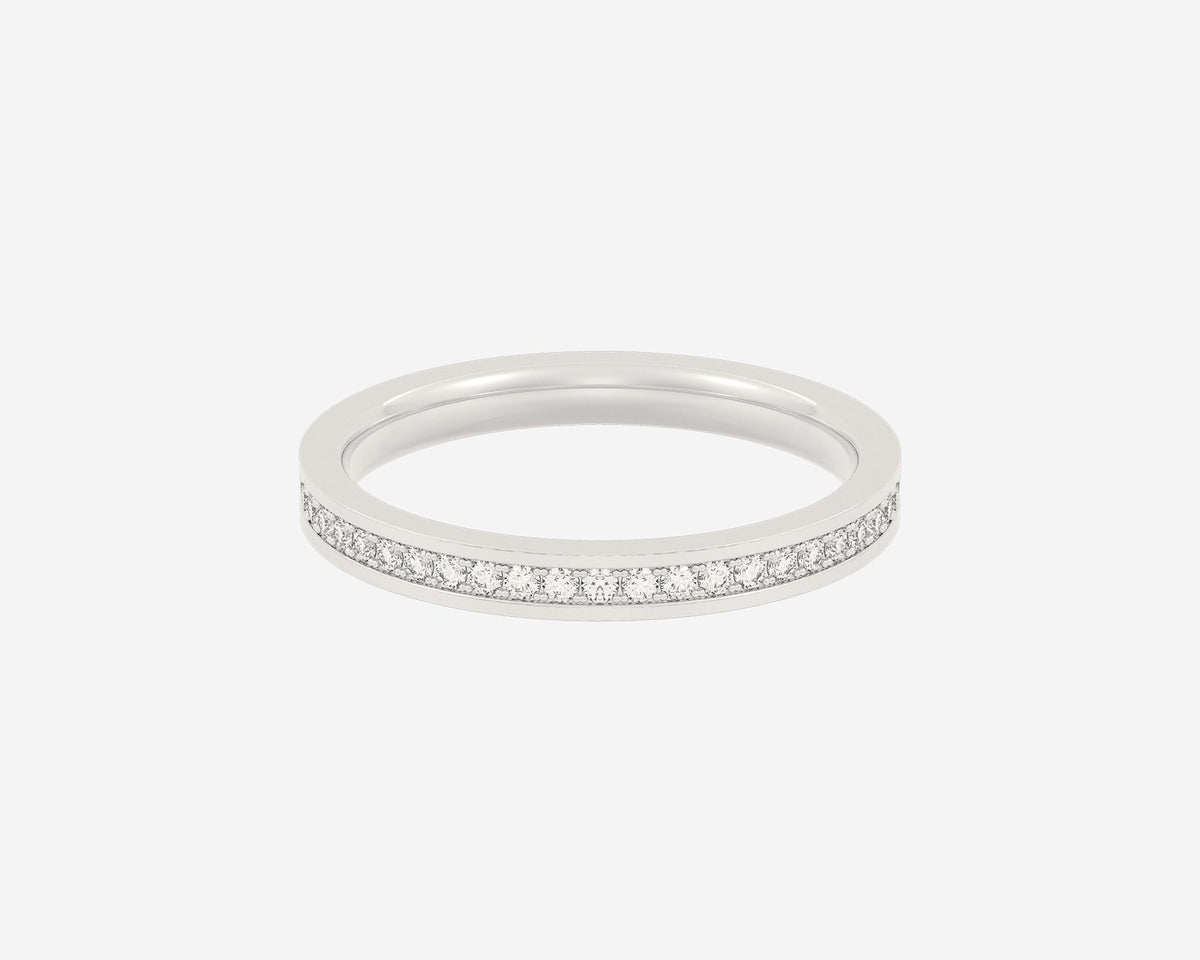This Full Channel Eternity ring by Holden dazzles with ethical lab-grown diamonds set fully around the 2mm band in a classic channel setting. Featuring E-G color and VS clarity, the stones emit delicate brilliance. Custom made in New York City with a unisex comfort-fit design, it’s a timeless symbol of enduring elegance.