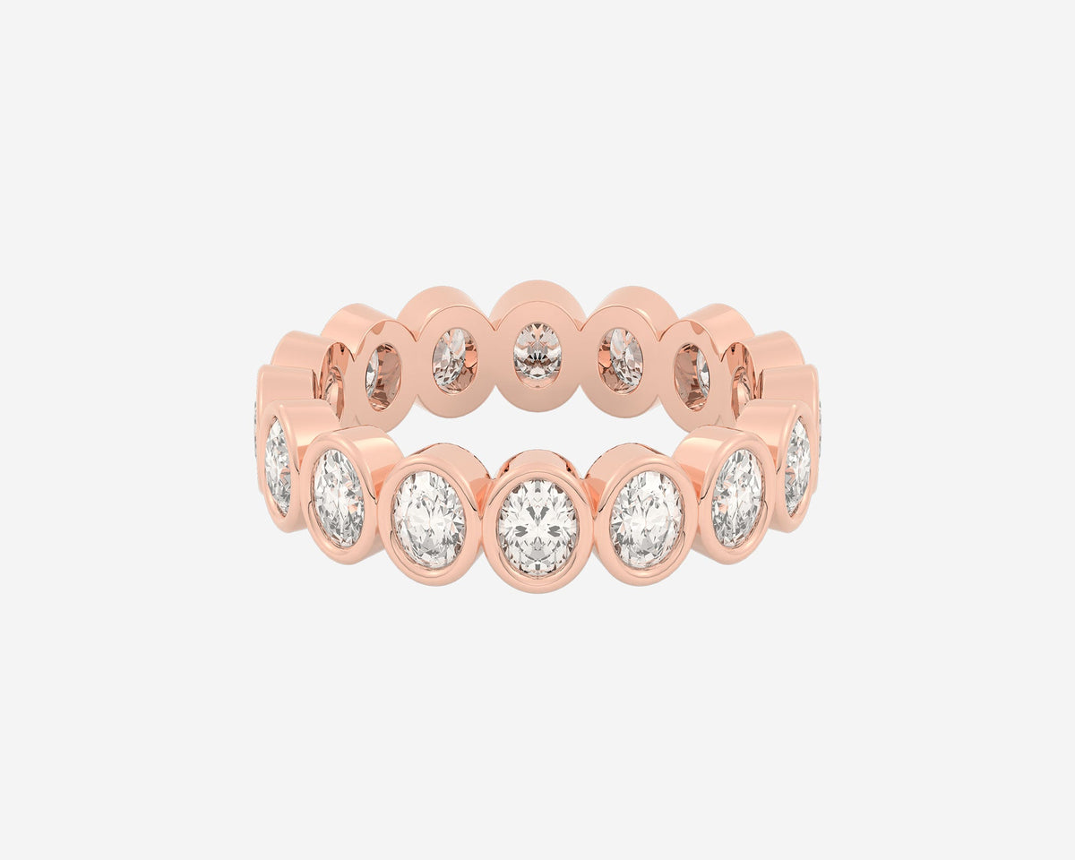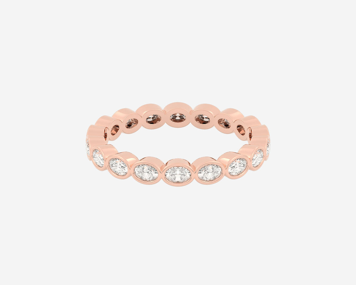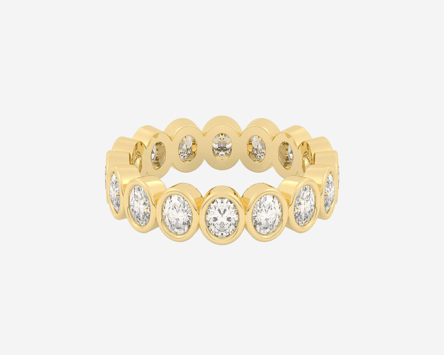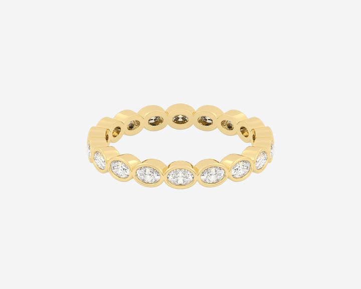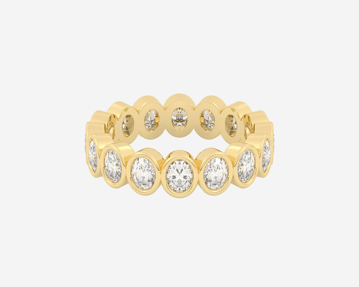 Handcrafted in 14k yellow gold. Width 3mm. Lab-grown oval-cut diamonds bezel-set around the full band. Comfort-fit design.
