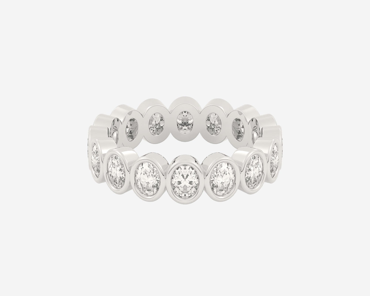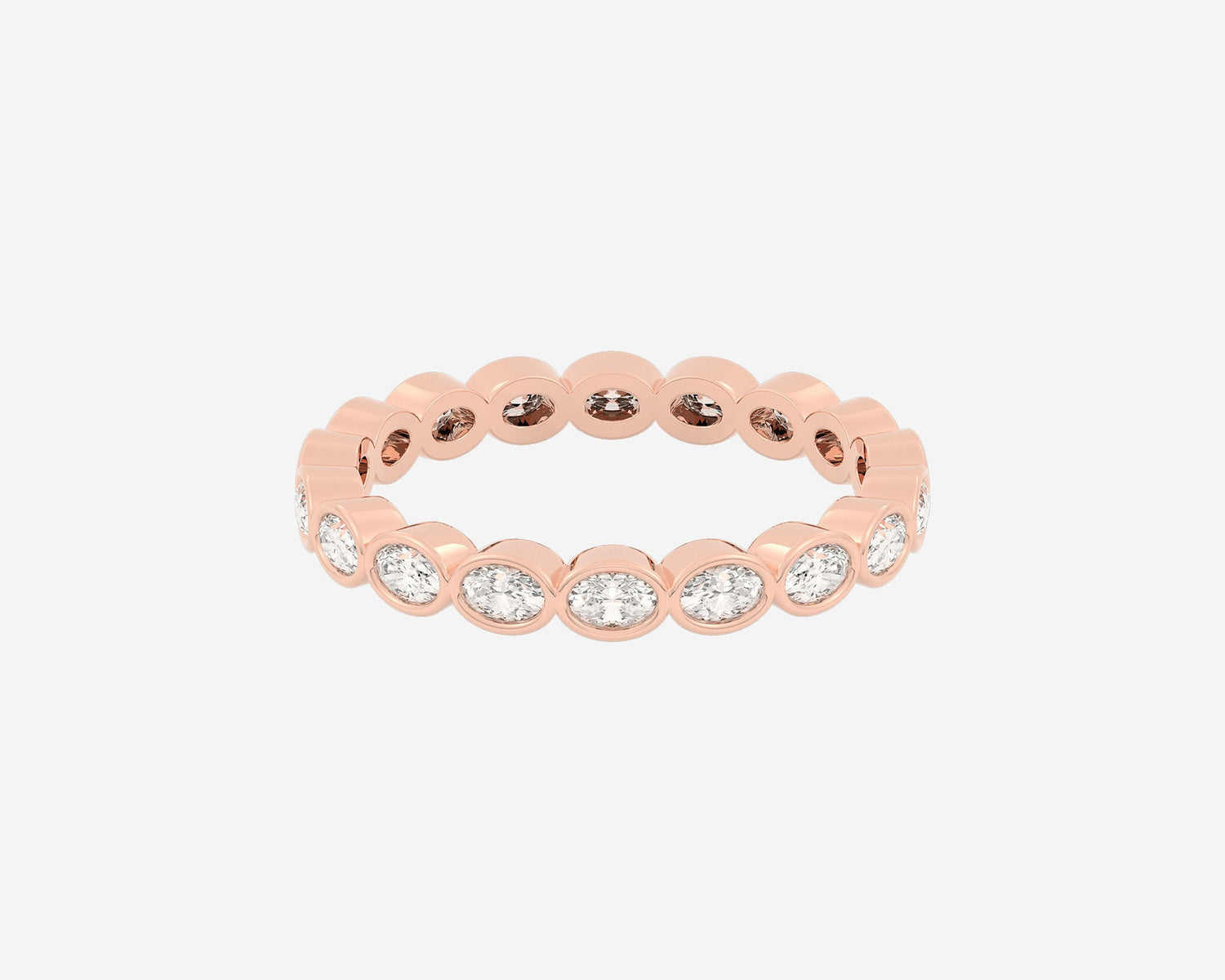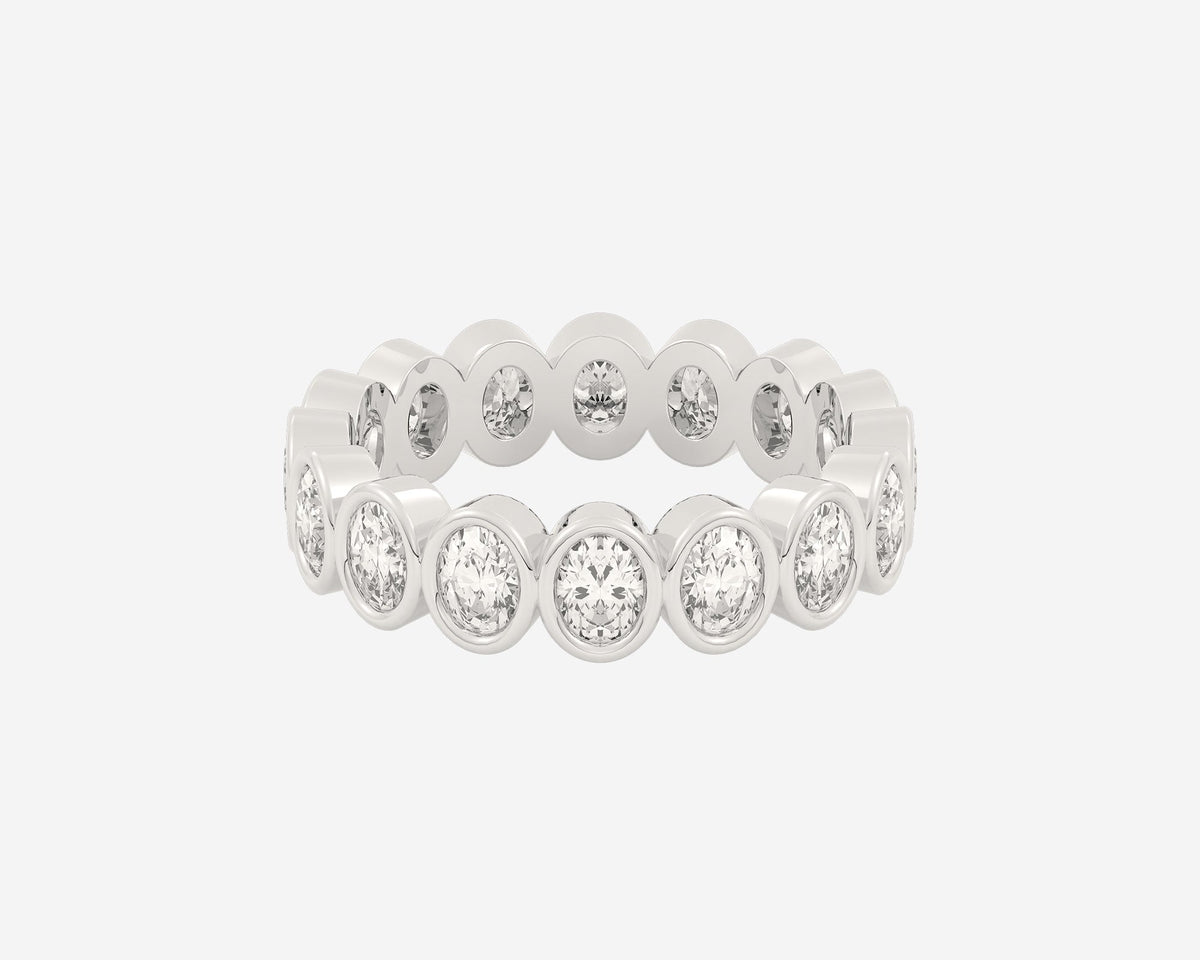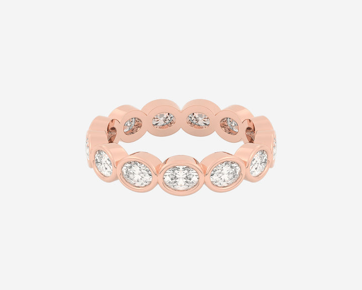 Handcrafted in 14k yellow gold. Width 3mm. Lab-grown oval-cut diamonds bezel-set around the full band. Comfort-fit design.