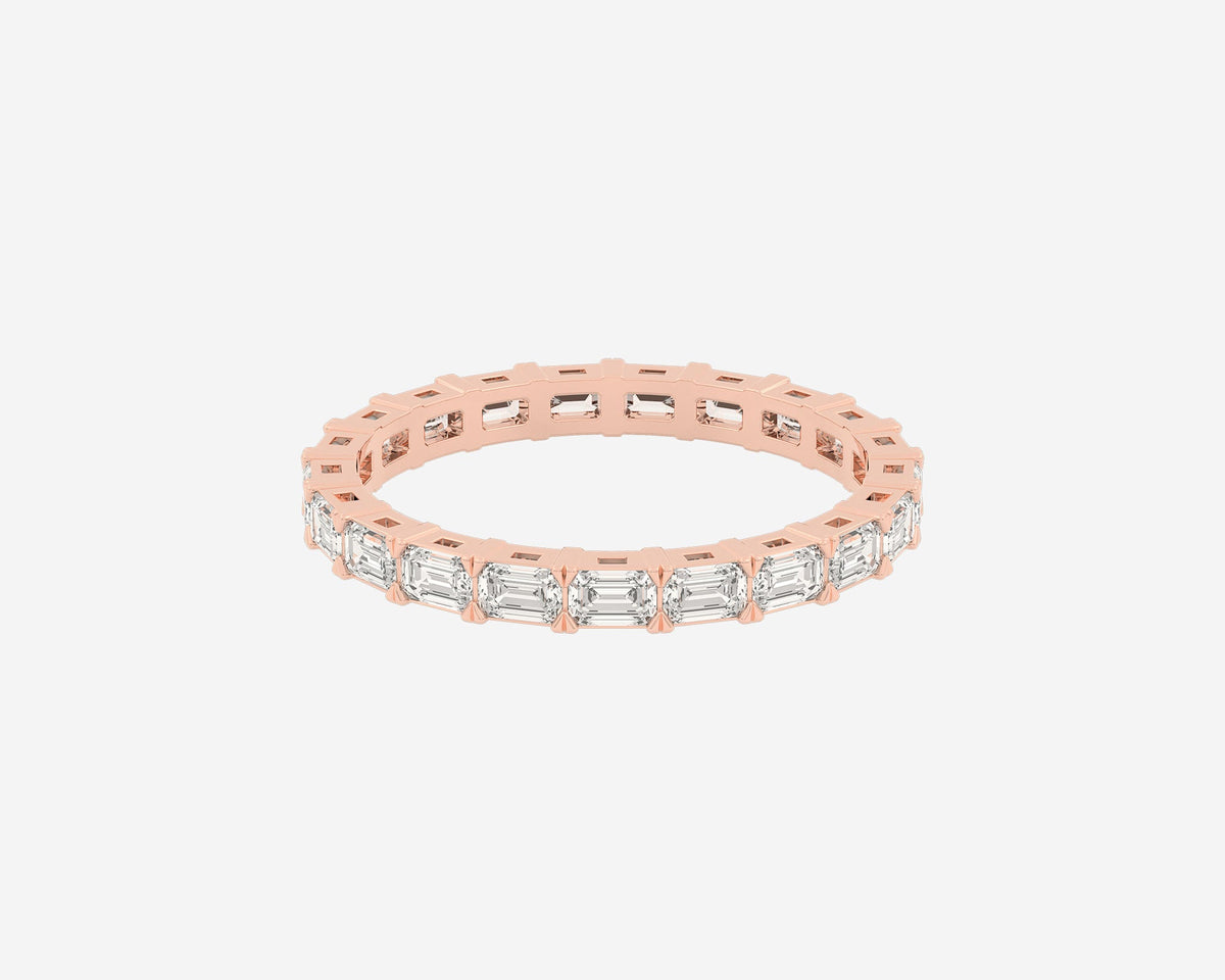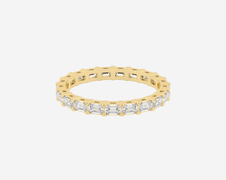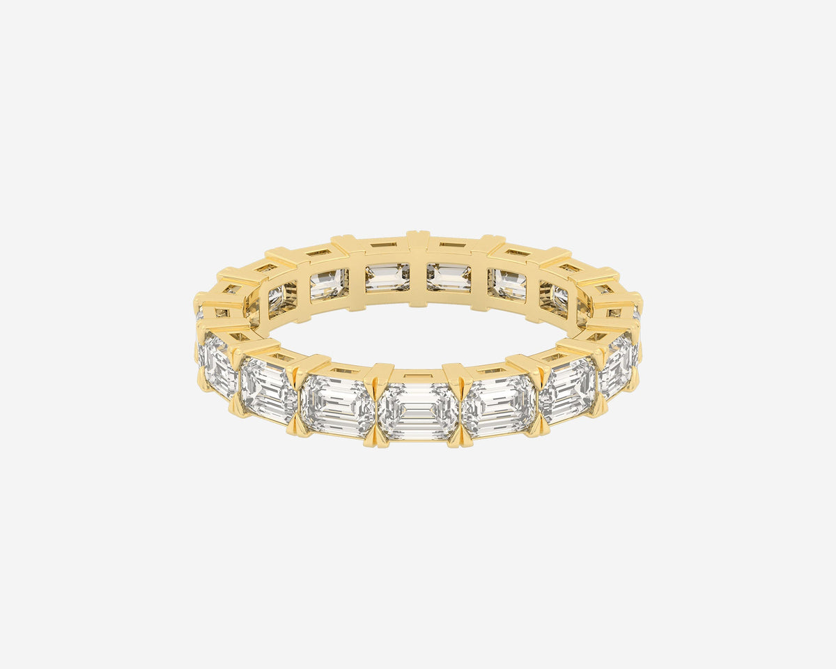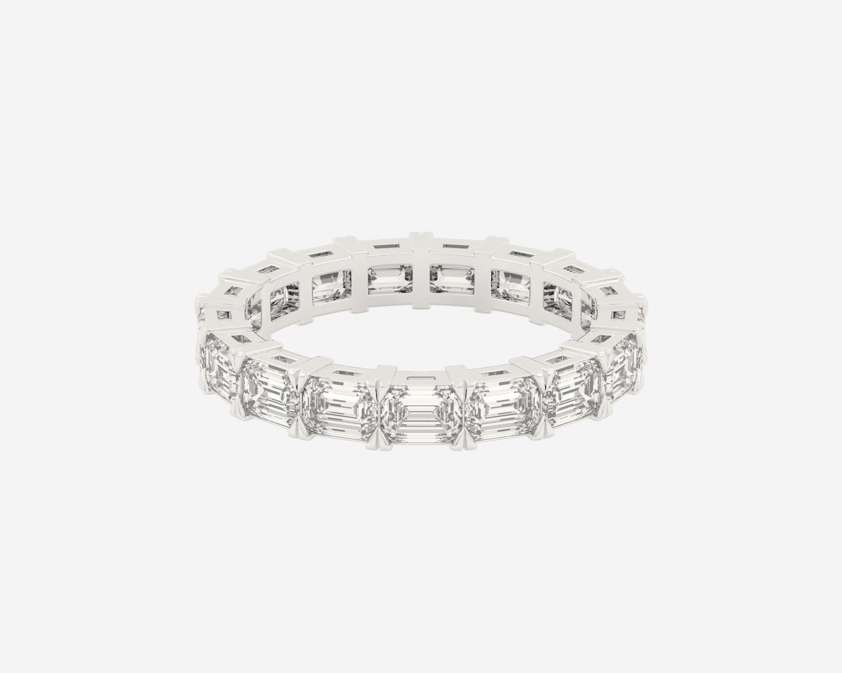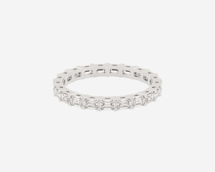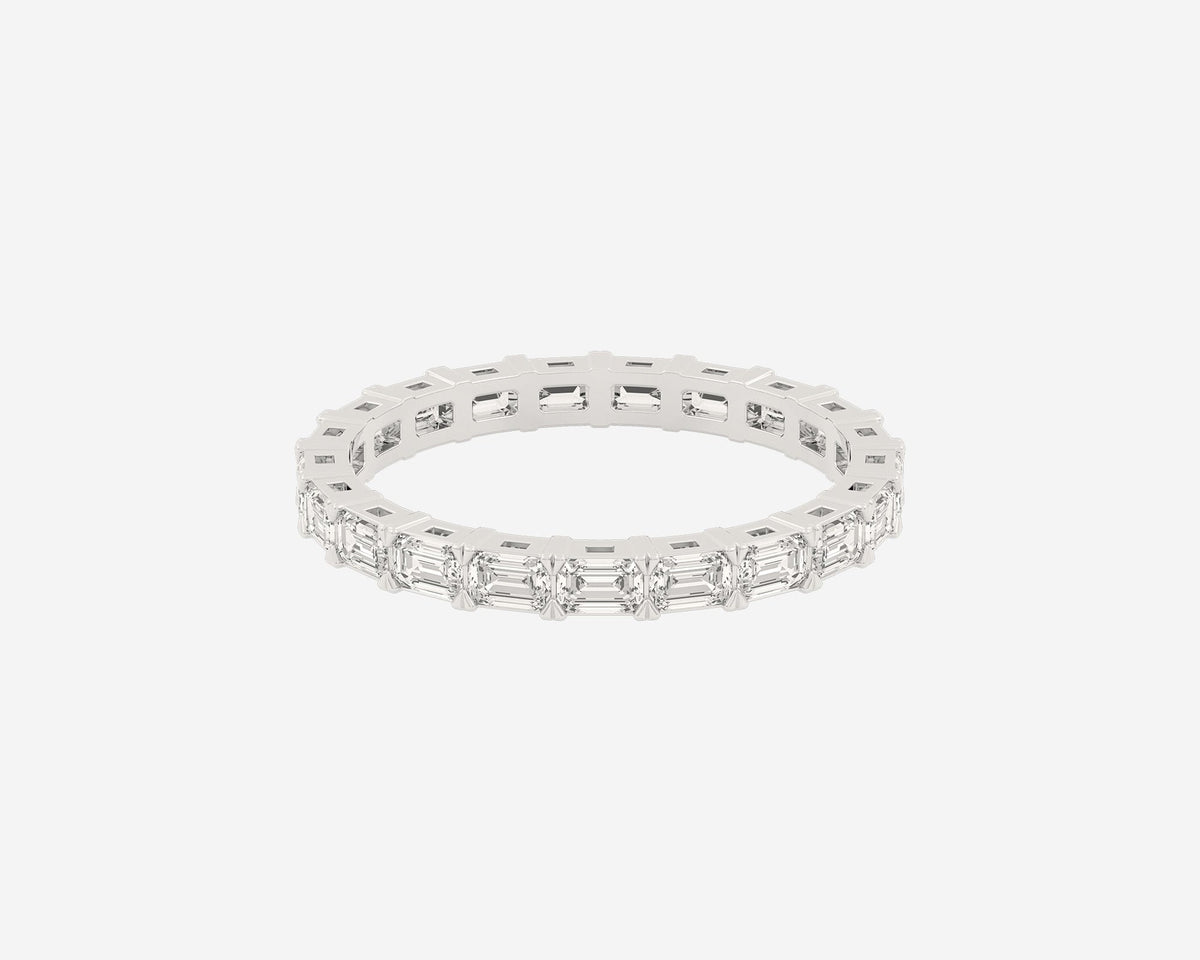This Full Row Emerald wedding ring by Holden features a continuous line of emerald-cut lab-grown diamonds set in a 2.75mm wide band. Crafted in NYC from sustainable, recycled metals, this piece blends architectural beauty with conscious luxury, perfect for marking lasting commitment.