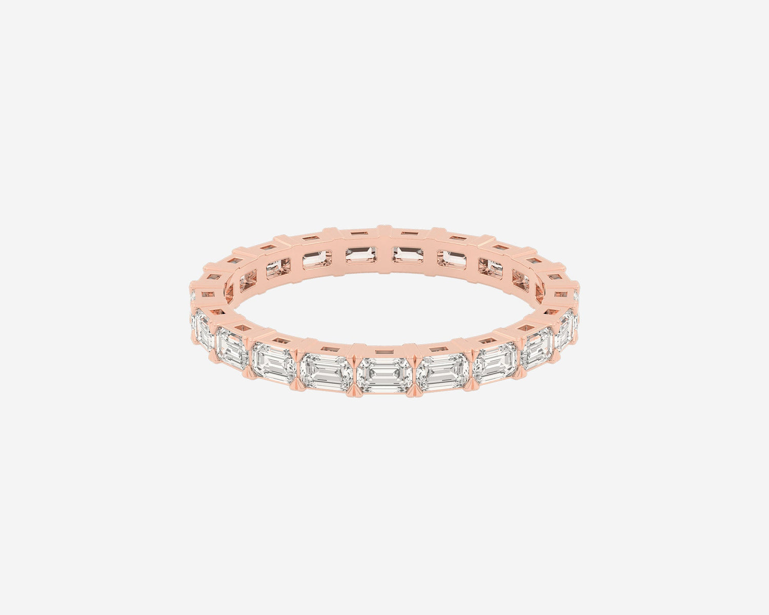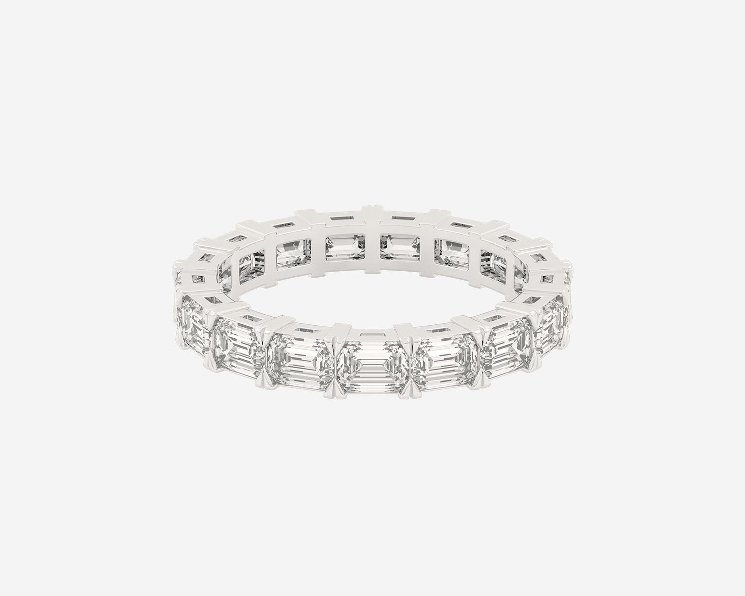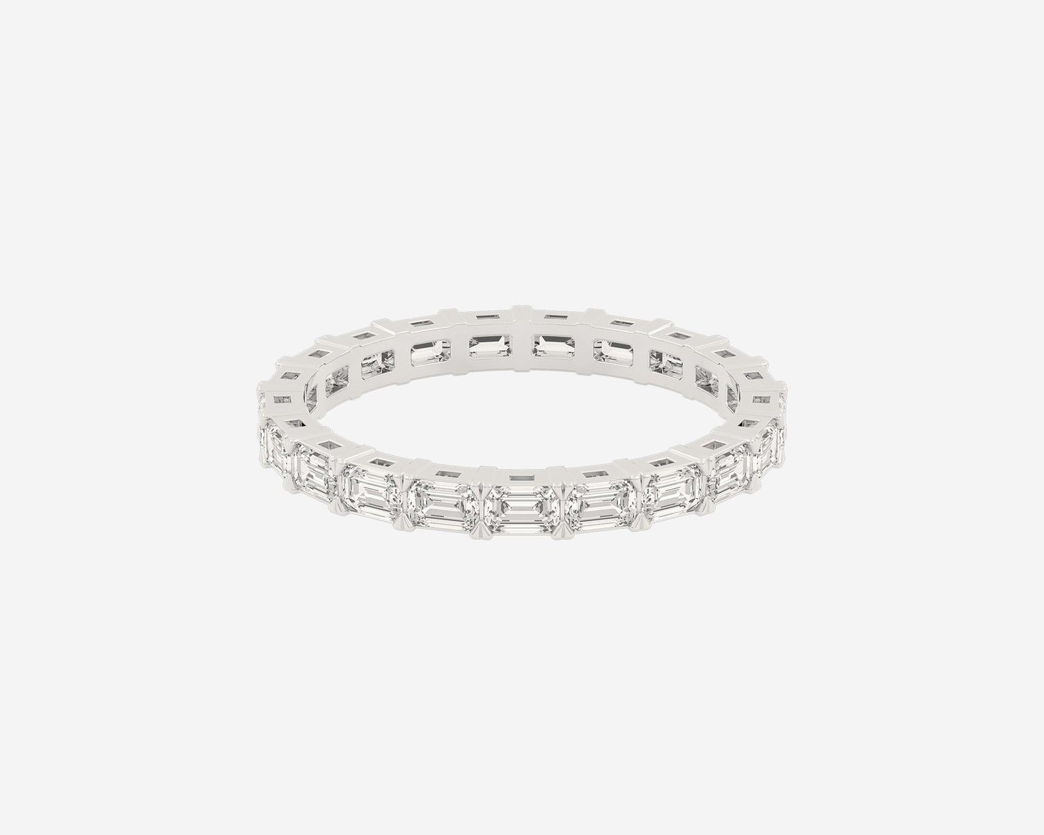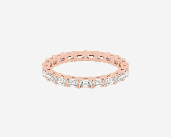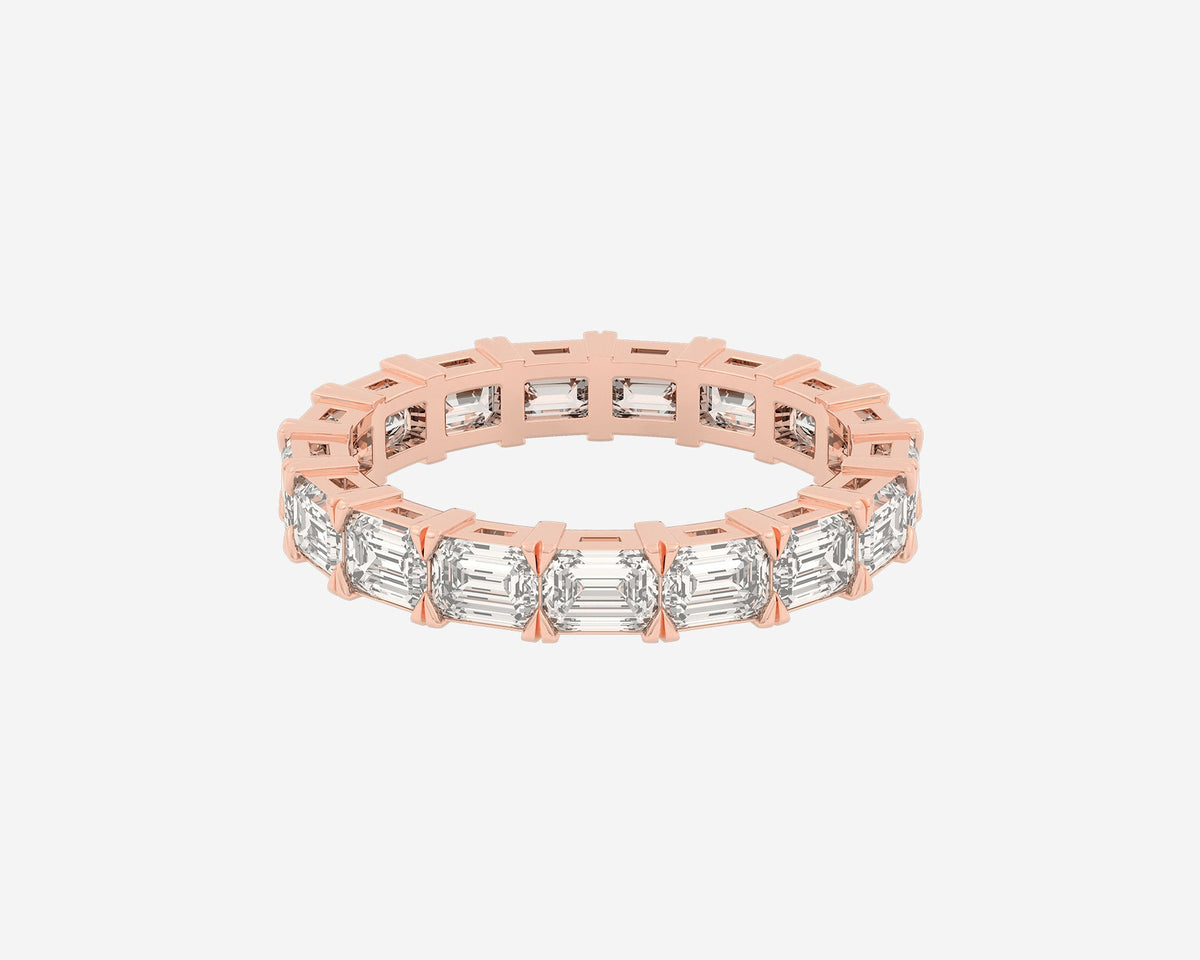 This Full Row Emerald wedding ring by Holden features a continuous line of emerald-cut lab-grown diamonds set in a 2.75mm wide band. Crafted in NYC from sustainable, recycled metals, this piece blends architectural beauty with conscious luxury, perfect for marking lasting commitment.