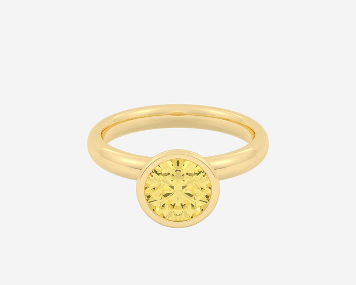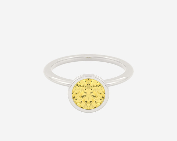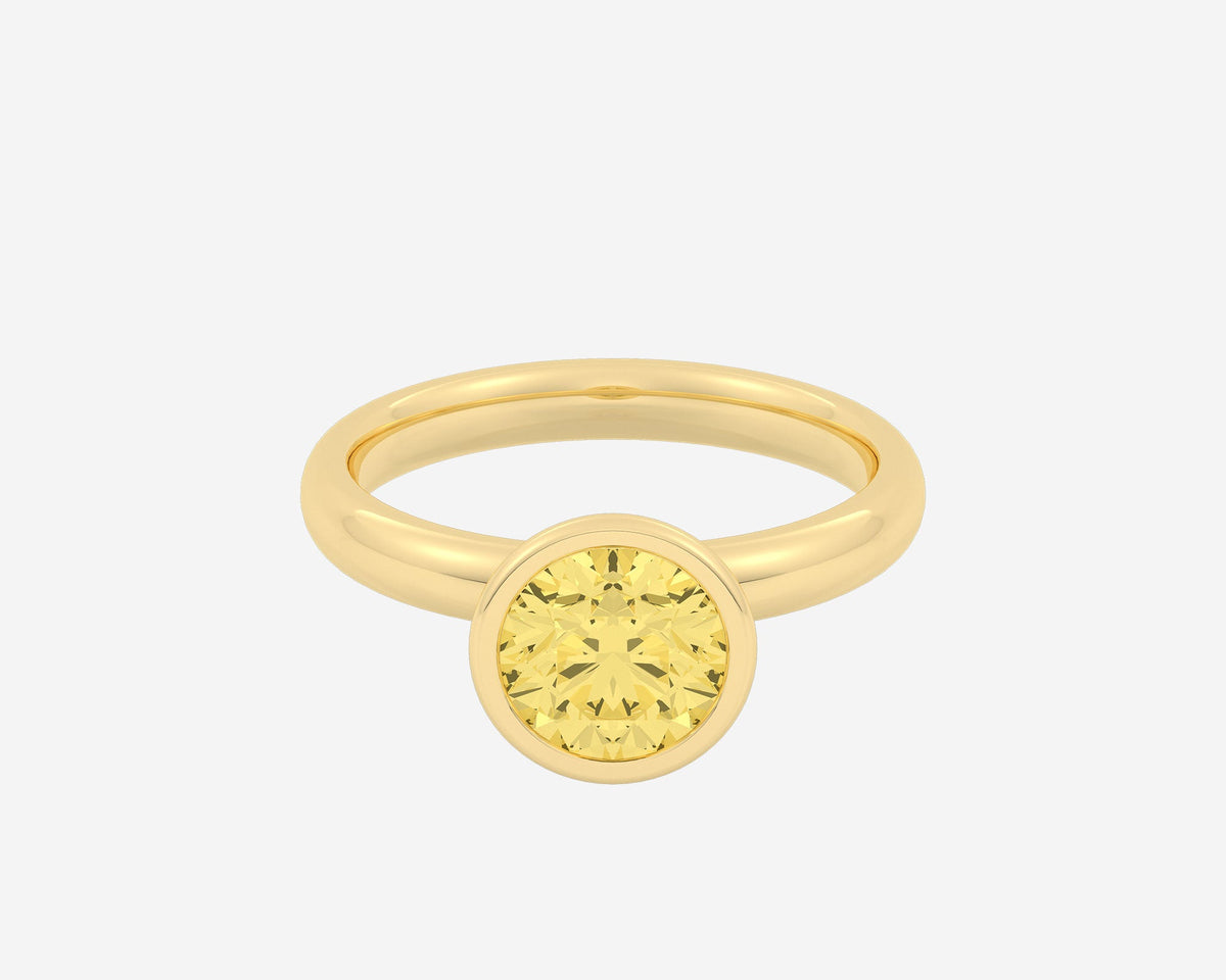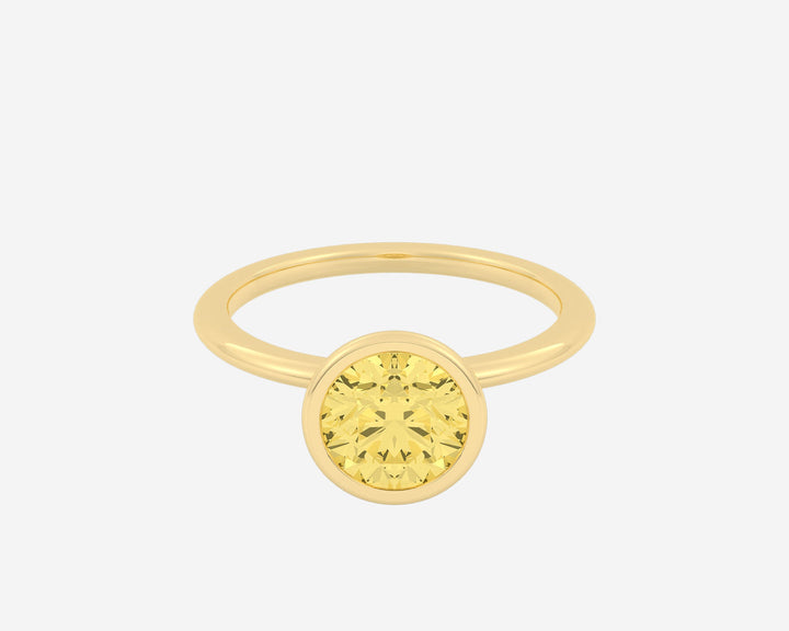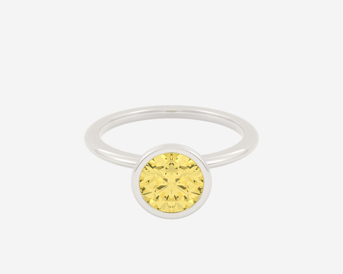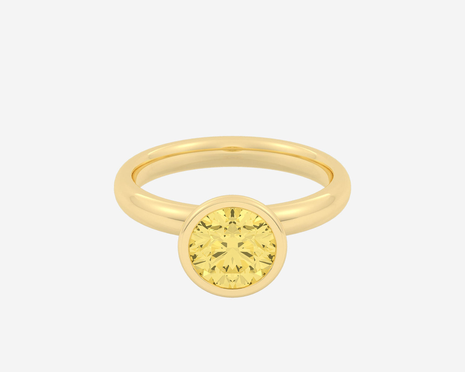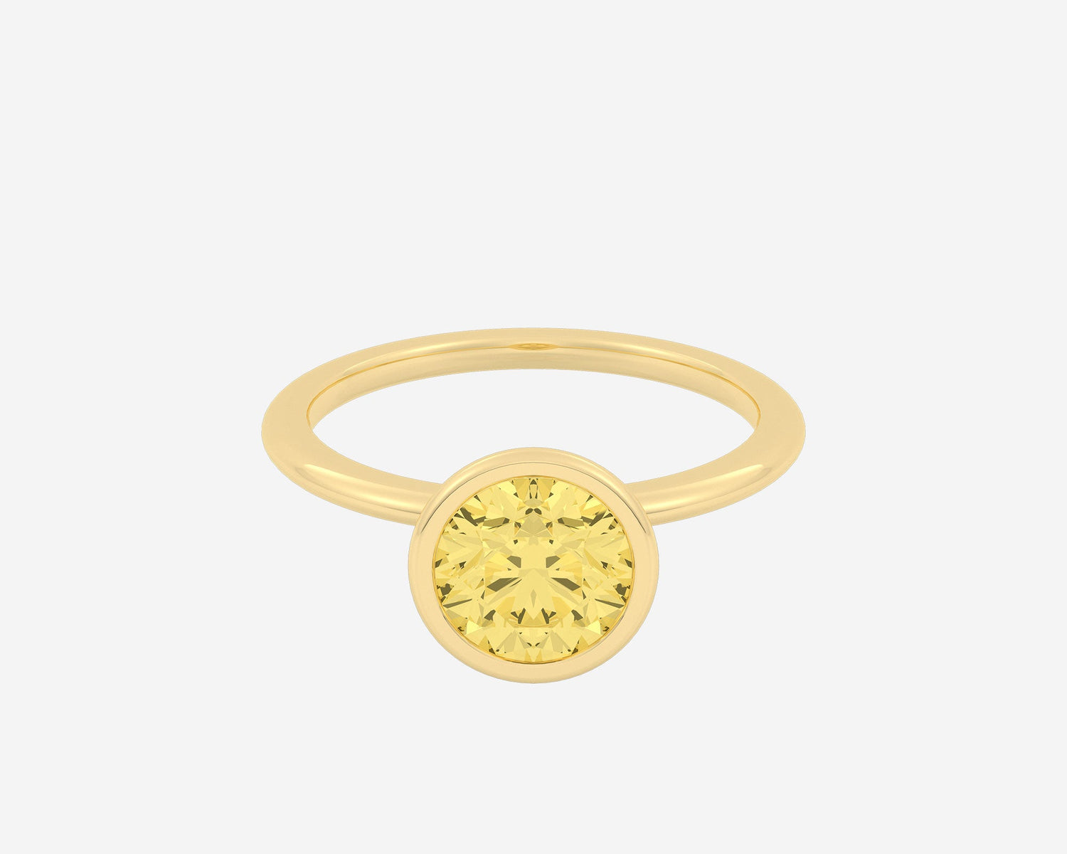 This Gem Bezel Solitaire — Round by Holden offers a sleek and secure setting for a round-cut lab-grown gemstone, set in recycled solid gold or 950 platinum bezel setting. The slender 1.5mm band elegantly showcases the gem’s brilliance, available in various karats and gold tones. This solitaire engagement ring is a meaningful blend of modern design, ethical craftsmanship, and vibrant color choices, with a portion of proceeds donated to The Trevor Project.
