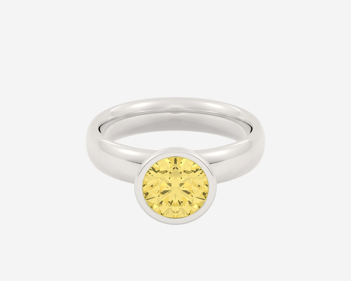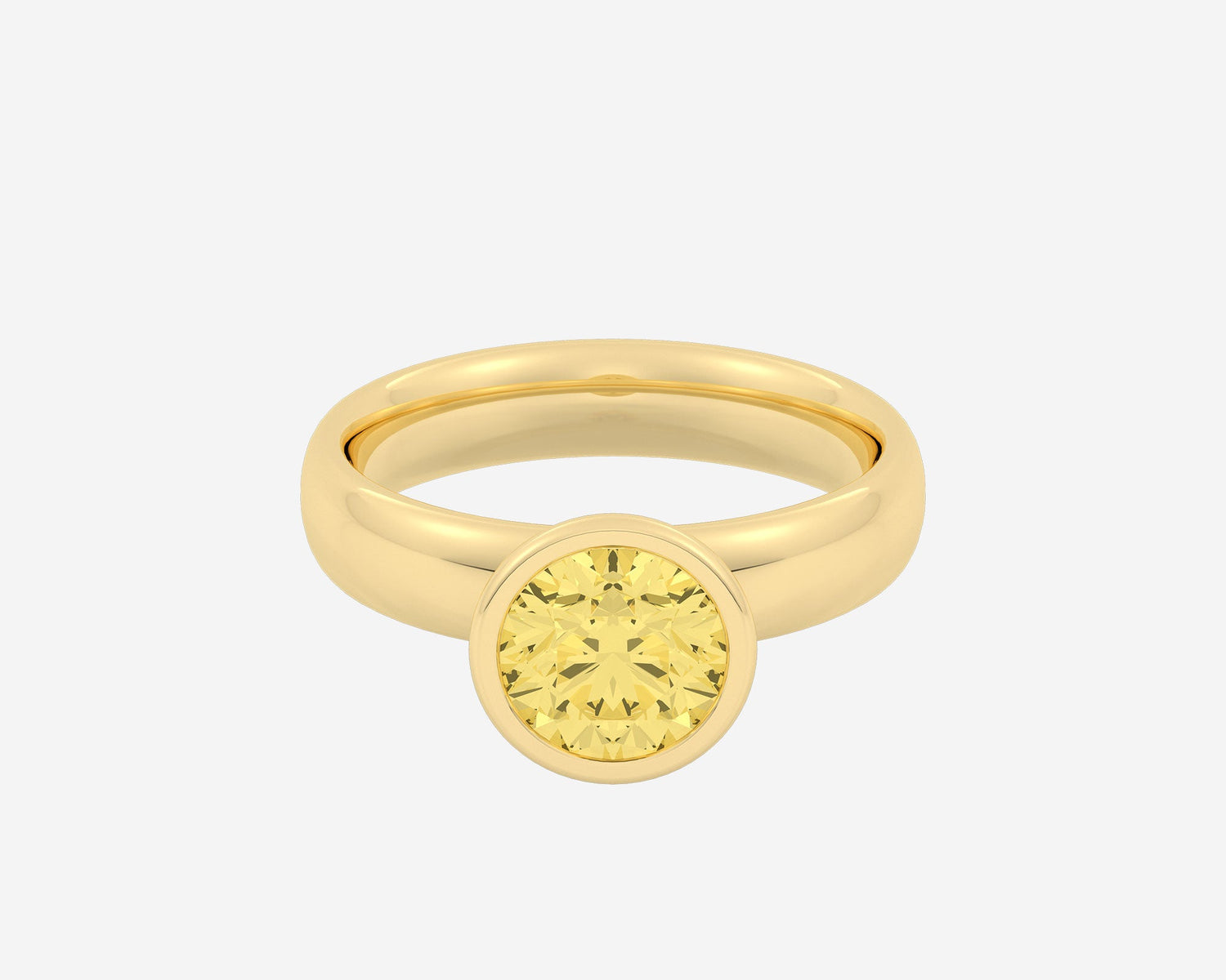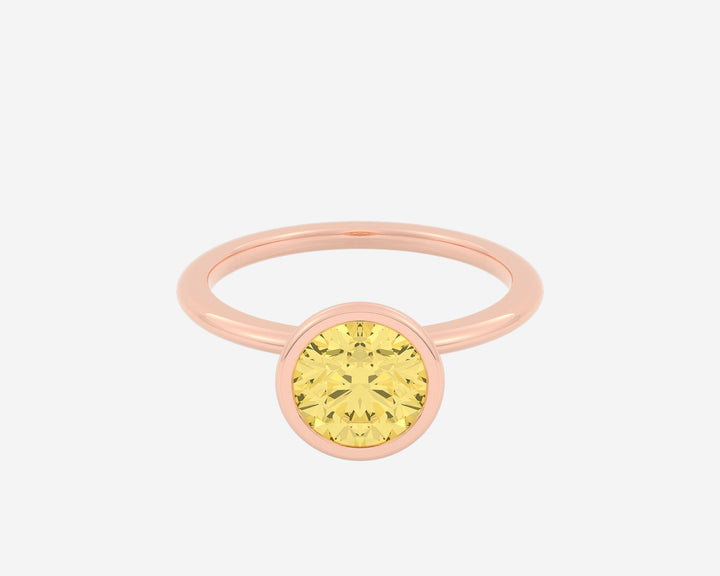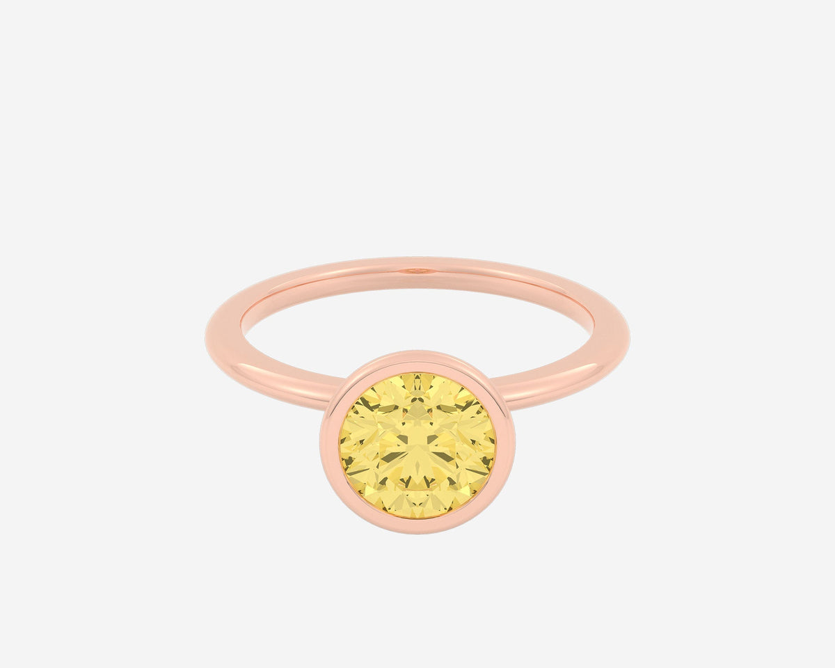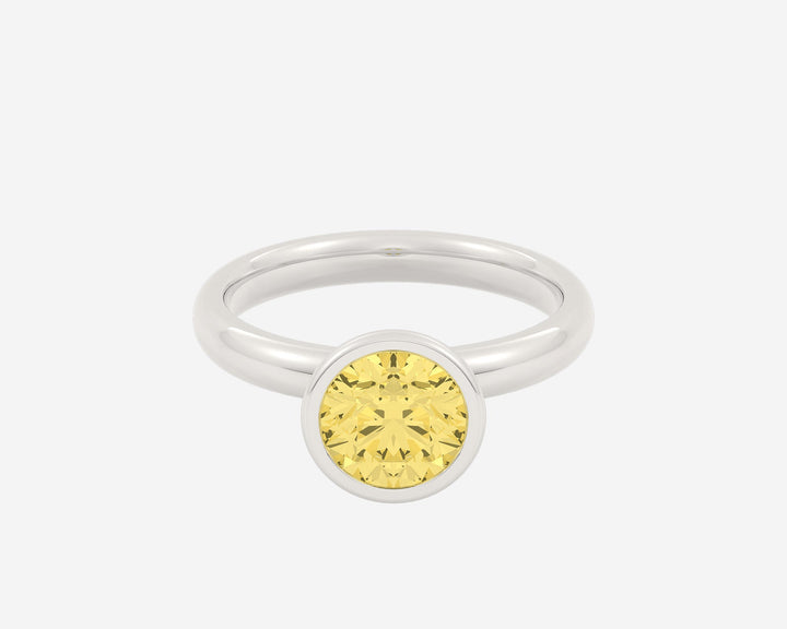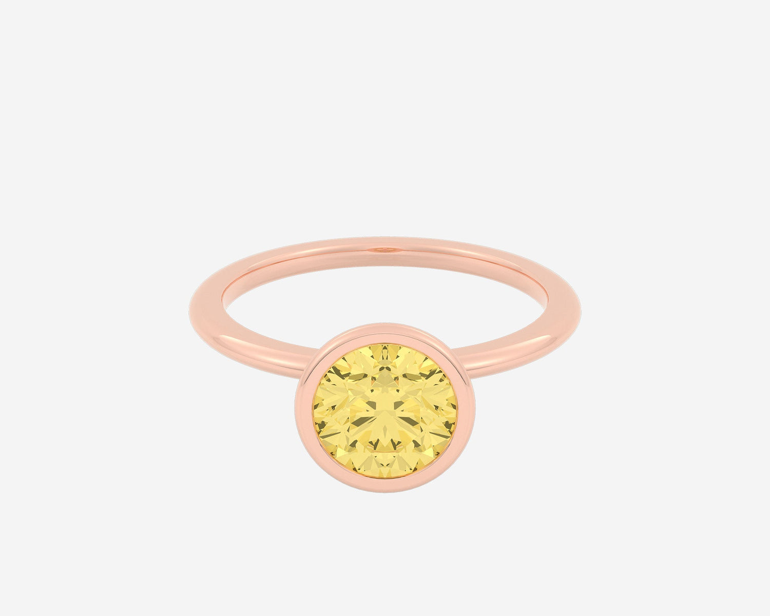 This Gem Bezel Solitaire — Round by Holden offers a sleek and secure setting for a round-cut lab-grown gemstone, set in recycled solid gold or 950 platinum bezel setting. The slender 1.5mm band elegantly showcases the gem’s brilliance, available in various karats and gold tones. This solitaire engagement ring is a meaningful blend of modern design, ethical craftsmanship, and vibrant color choices, with a portion of proceeds donated to The Trevor Project.