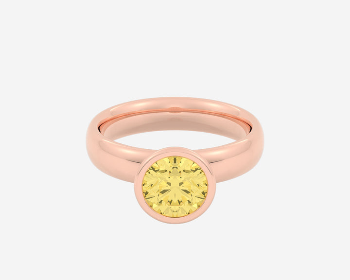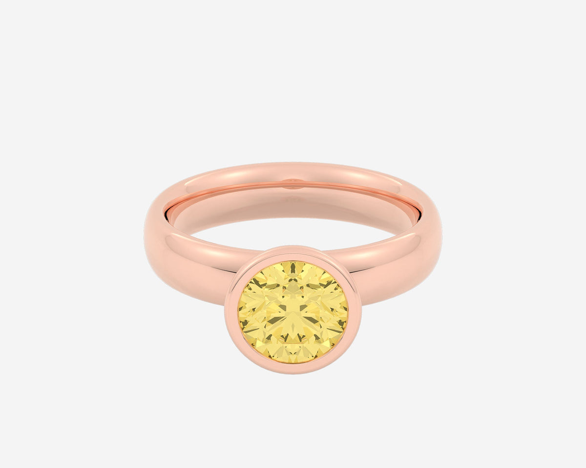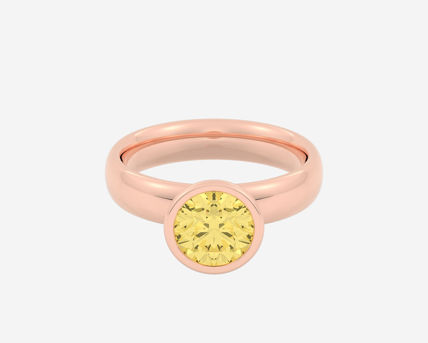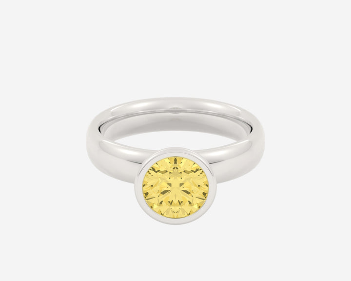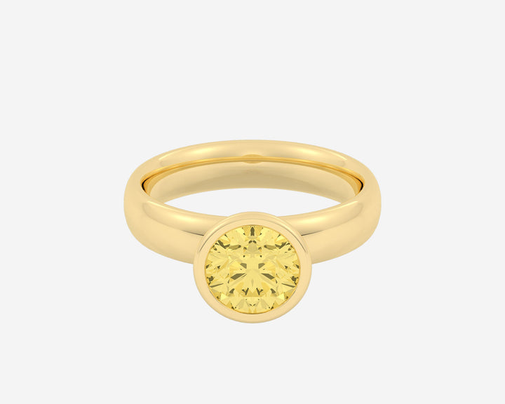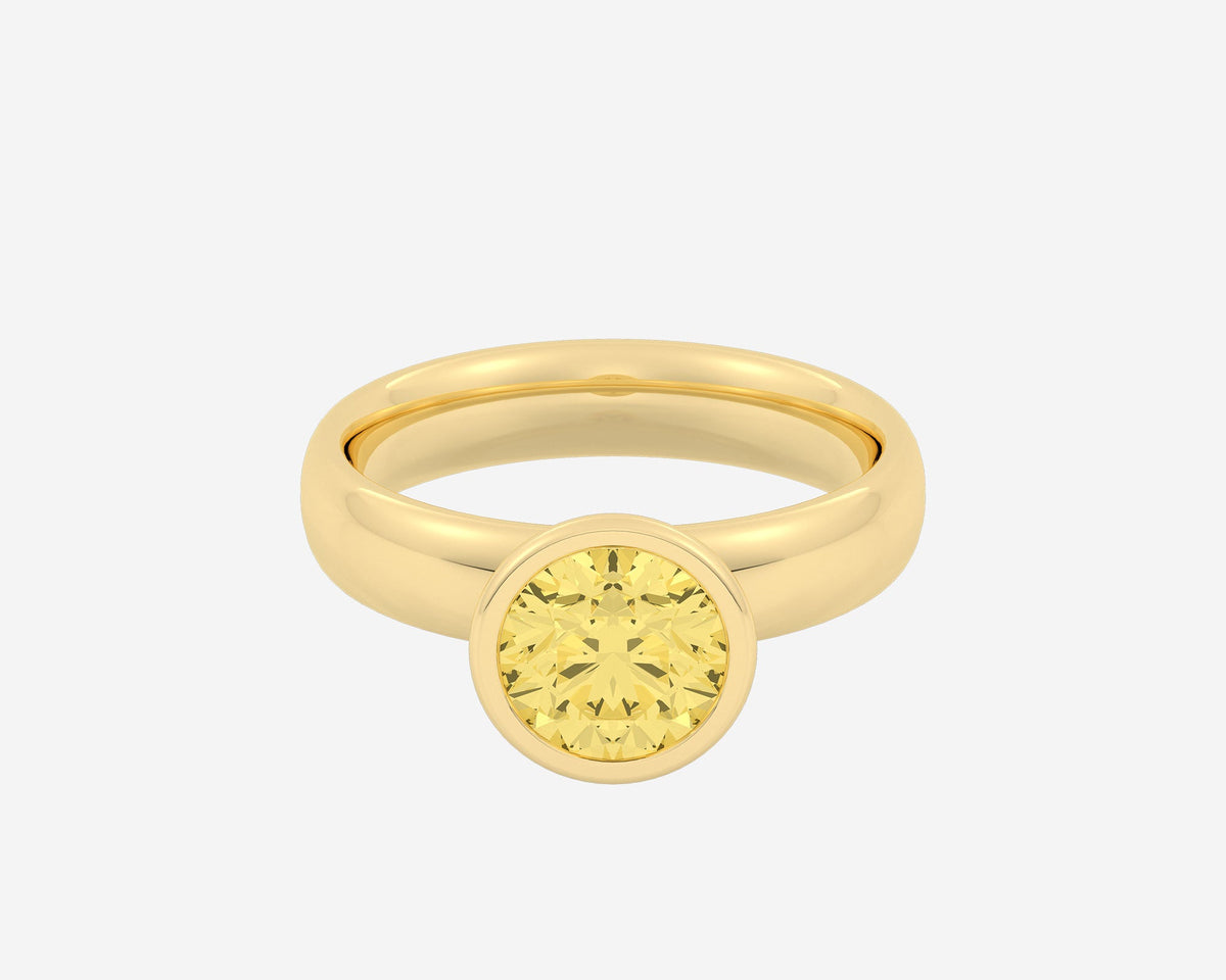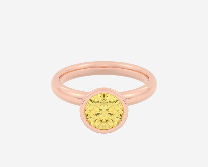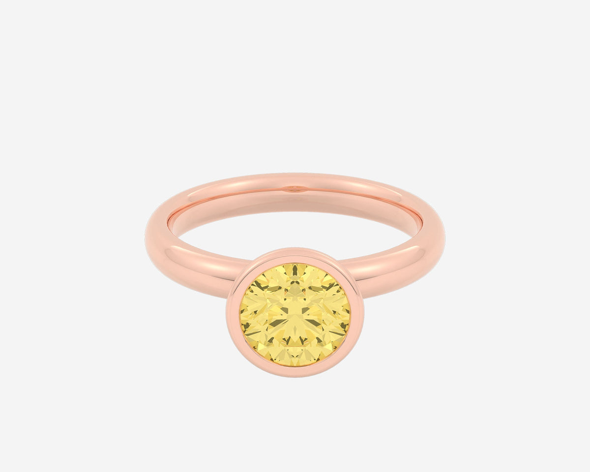 This Gem Bezel Solitaire — Round by Holden offers a sleek and secure setting for a round-cut lab-grown gemstone, set in recycled solid gold or 950 platinum bezel setting. The slender 1.5mm band elegantly showcases the gem’s brilliance, available in various karats and gold tones. This solitaire engagement ring is a meaningful blend of modern design, ethical craftsmanship, and vibrant color choices, with a portion of proceeds donated to The Trevor Project.