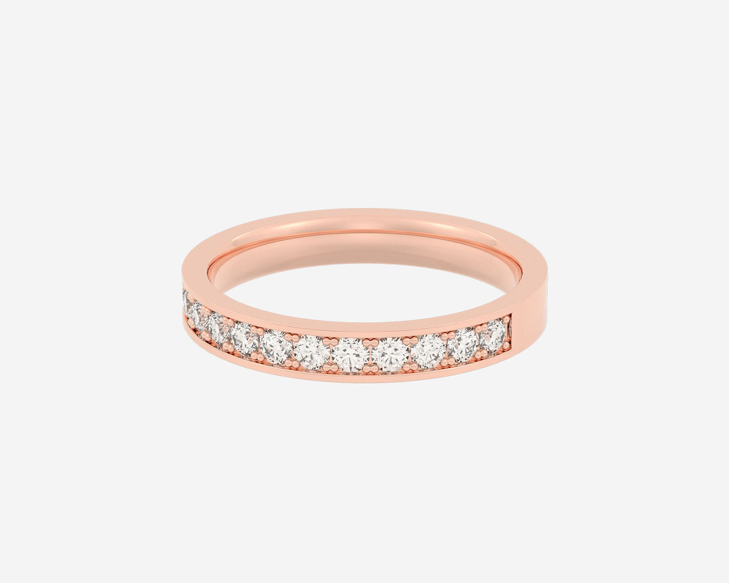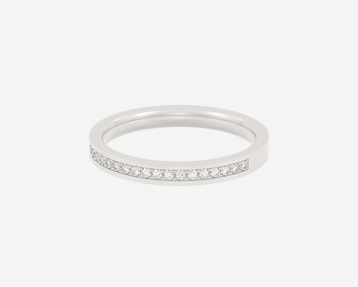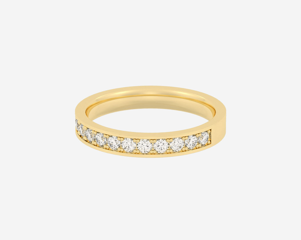 This Half Channel Eternity ring by Holden presents ethical lab-grown diamonds set halfway around a 2mm band in a sleek channel setting. With E-G color and VS clarity, the diamonds reflect delicate brilliance, blending elegance with sustainable luxury. The unisex comfort-fit design crafted in New York City makes it a versatile and timeless piece.