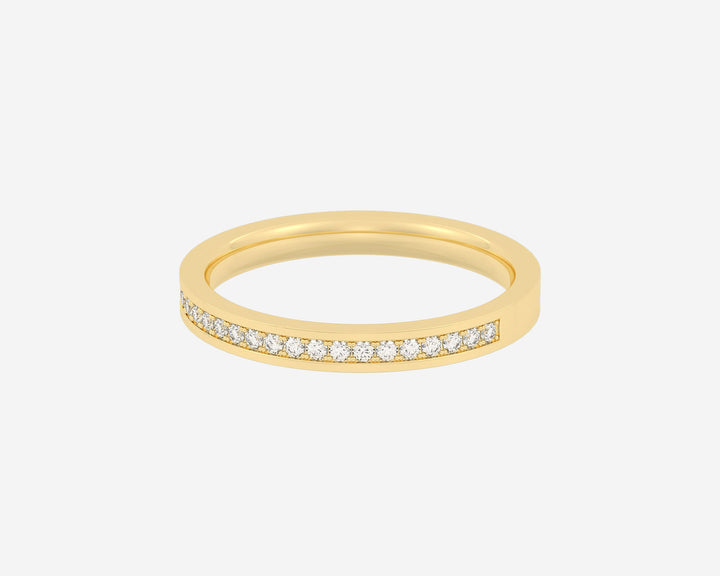 Handcrafted in 14k yellow gold, 2mm width with lab-grown diamonds set halfway in channel style (E-G color, VS clarity). Made from conflict-free, recycled metals with a unisex, comfort-fit design.