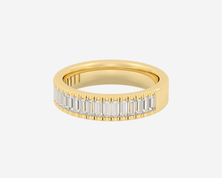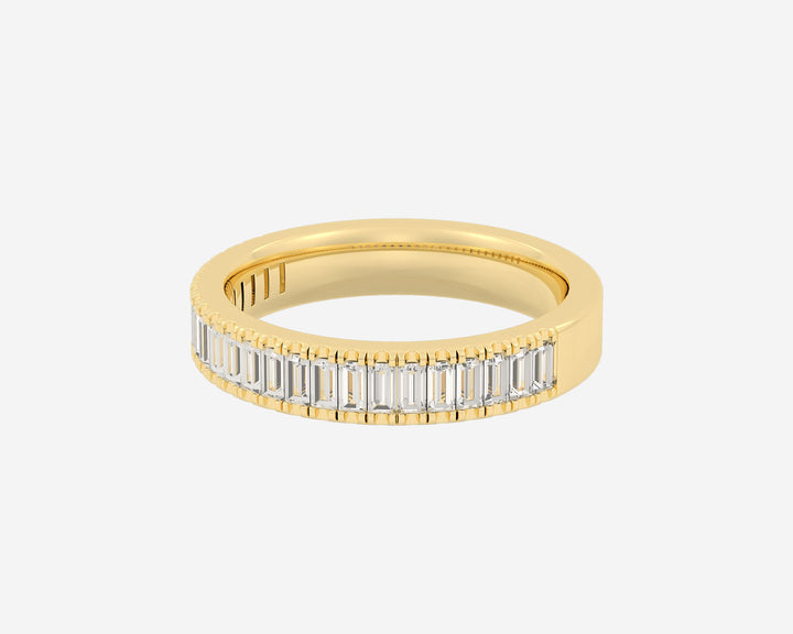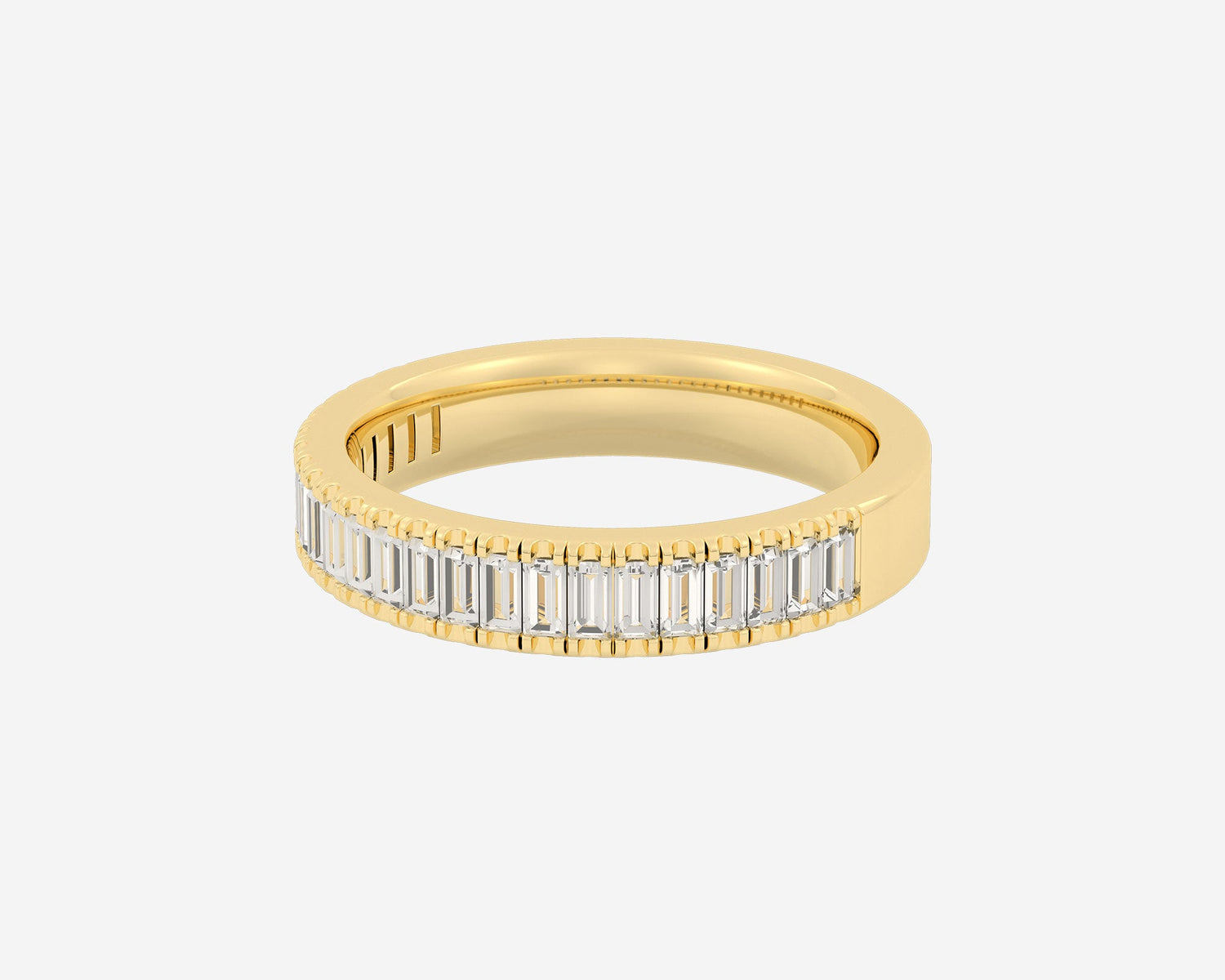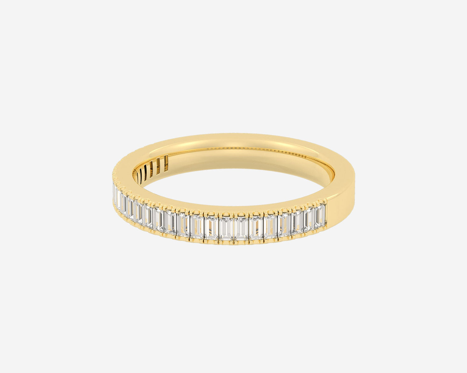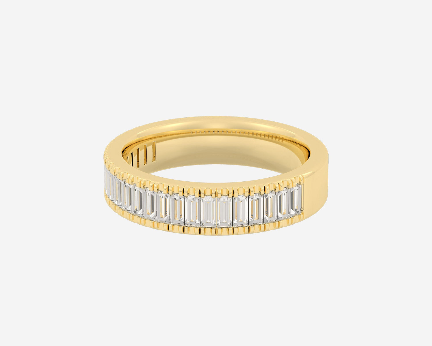 Handcrafted in 14k yellow gold, 3mm width with lab-grown diamonds set halfway in column baguette style (G-H color, VS clarity). Made from conflict-free, recycled metals with a unisex, comfort-fit design.