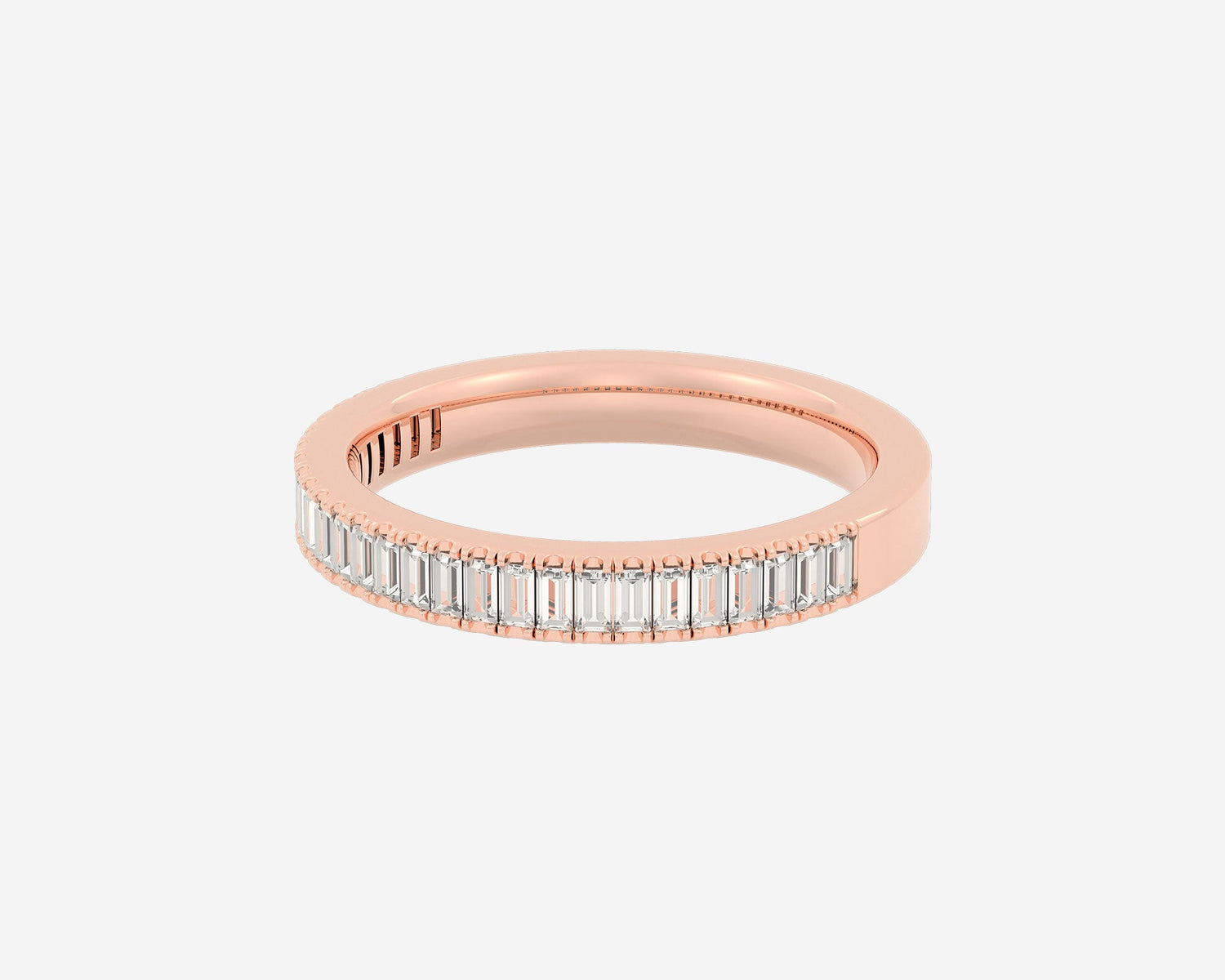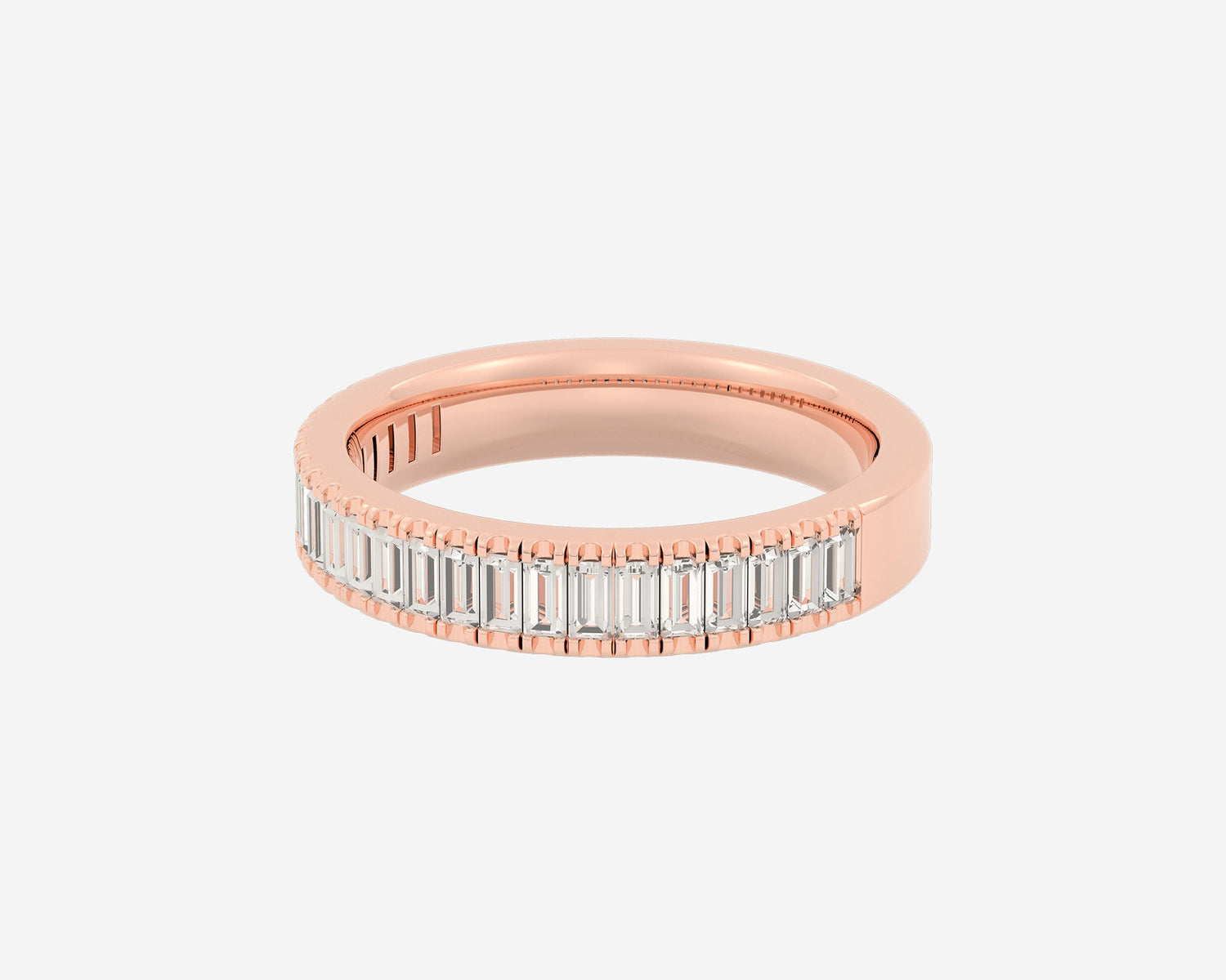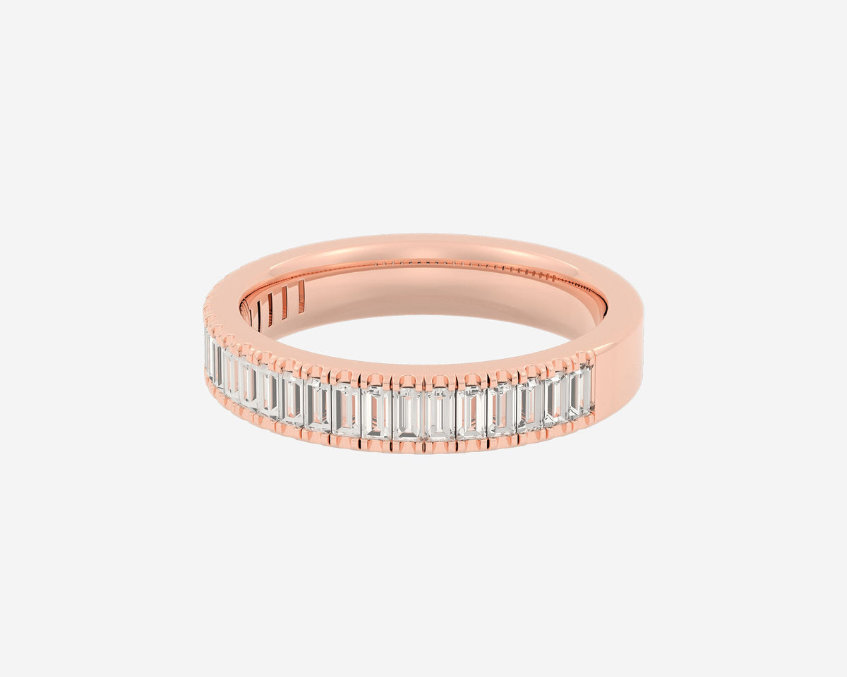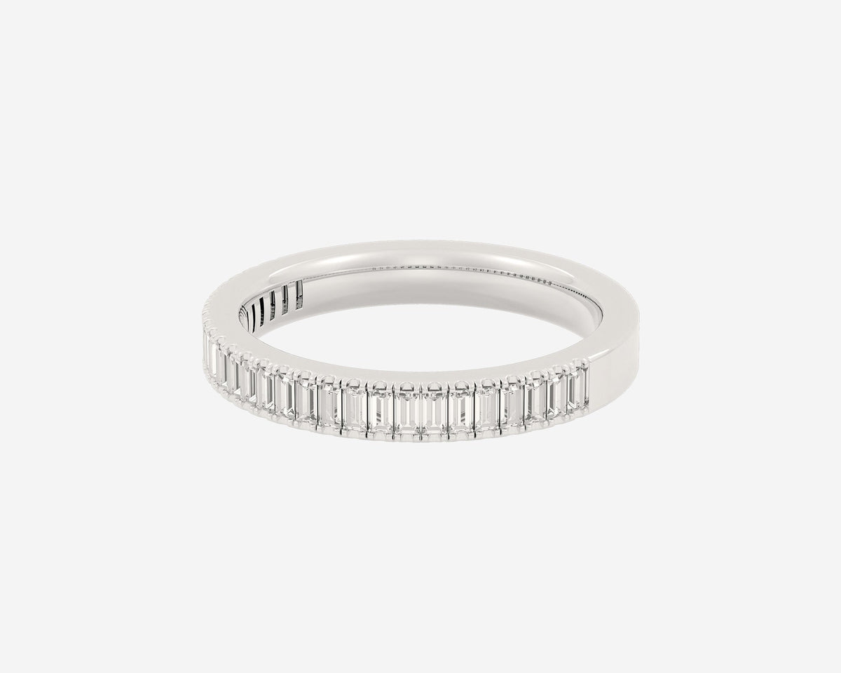 Handcrafted in 14k yellow gold, 3mm width with lab-grown diamonds set halfway in column baguette style (G-H color, VS clarity). Made from conflict-free, recycled metals with a unisex, comfort-fit design.