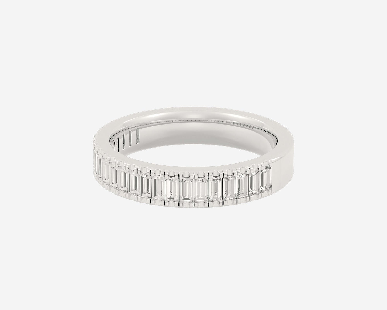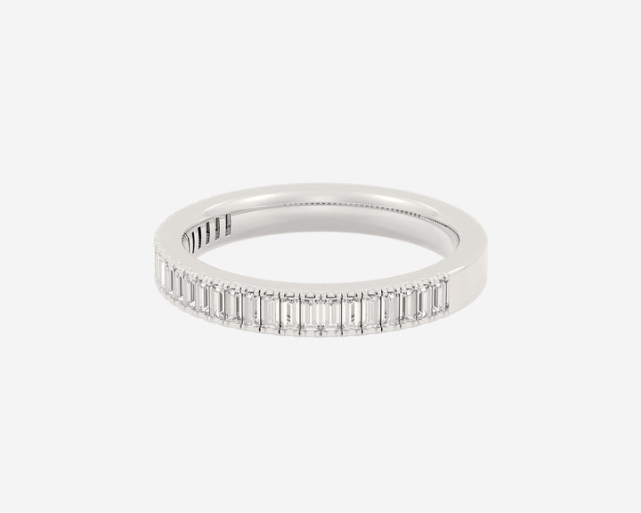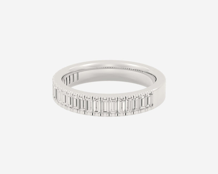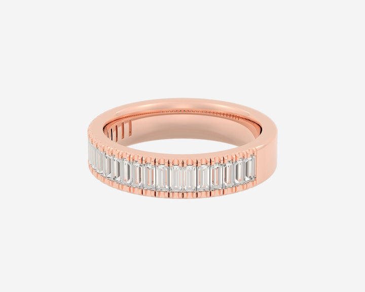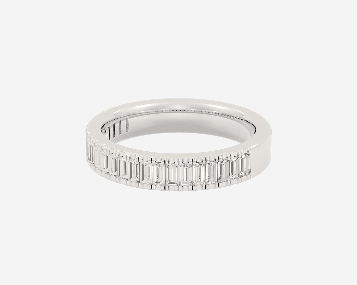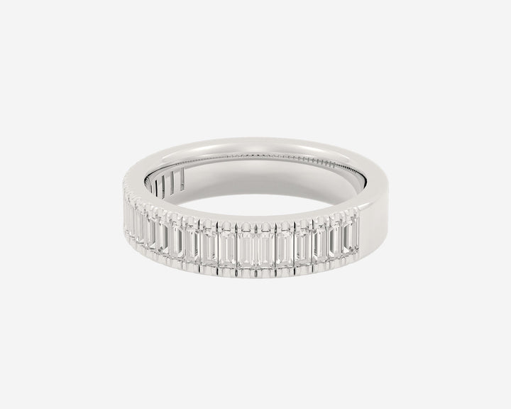 This Half Column Baguette ring by Holden features ethical lab-grown diamonds set halfway around its 3mm band in a vertical column arrangement. With G-H color and VS clarity, the diamonds offer a sophisticated sparkle, combining contemporary elegance with sustainable luxury. The unisex comfort-fit design and New York City craftsmanship ensure both comfort and style.