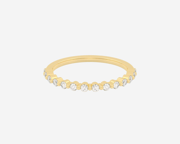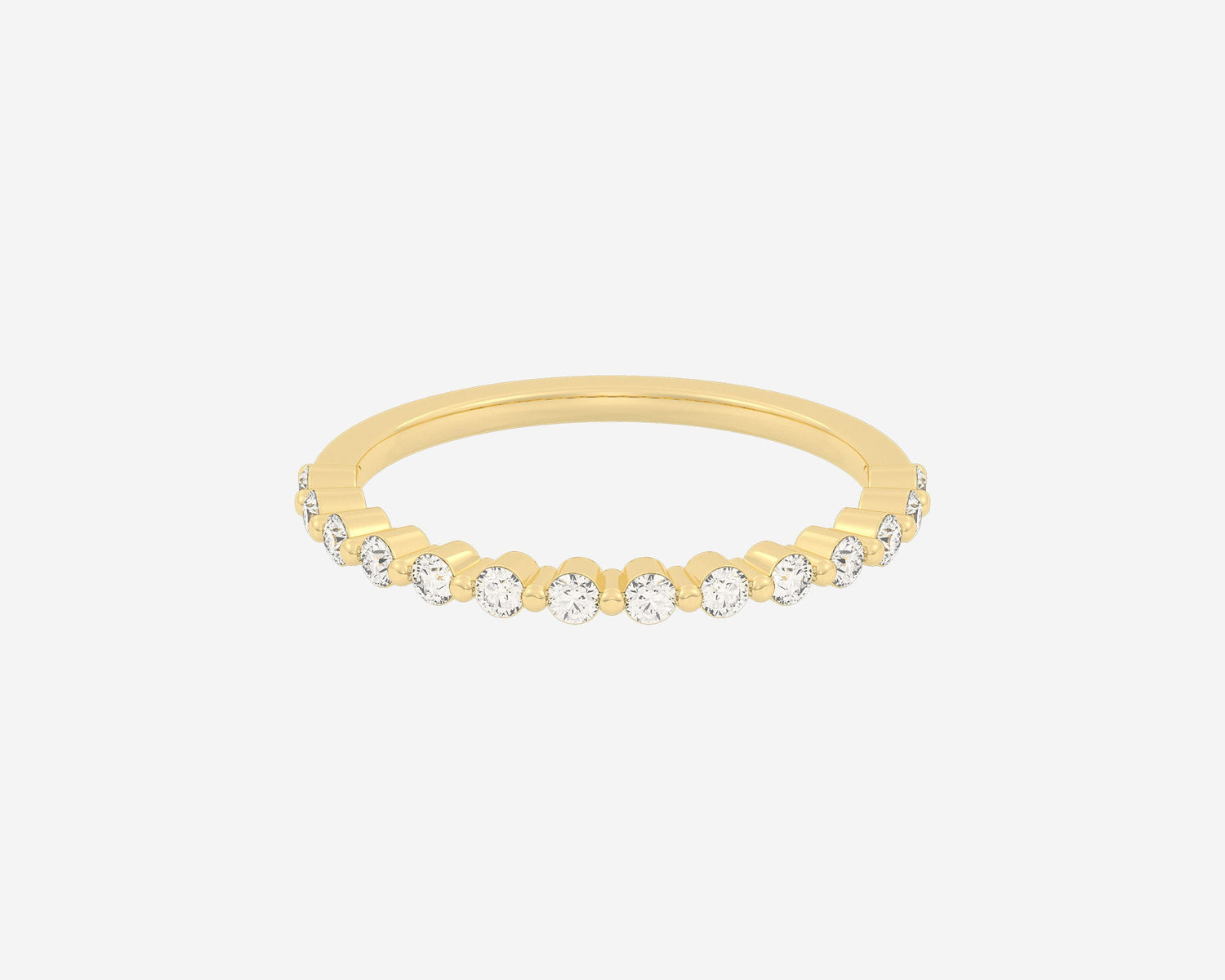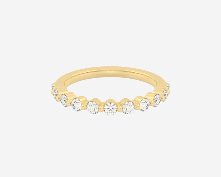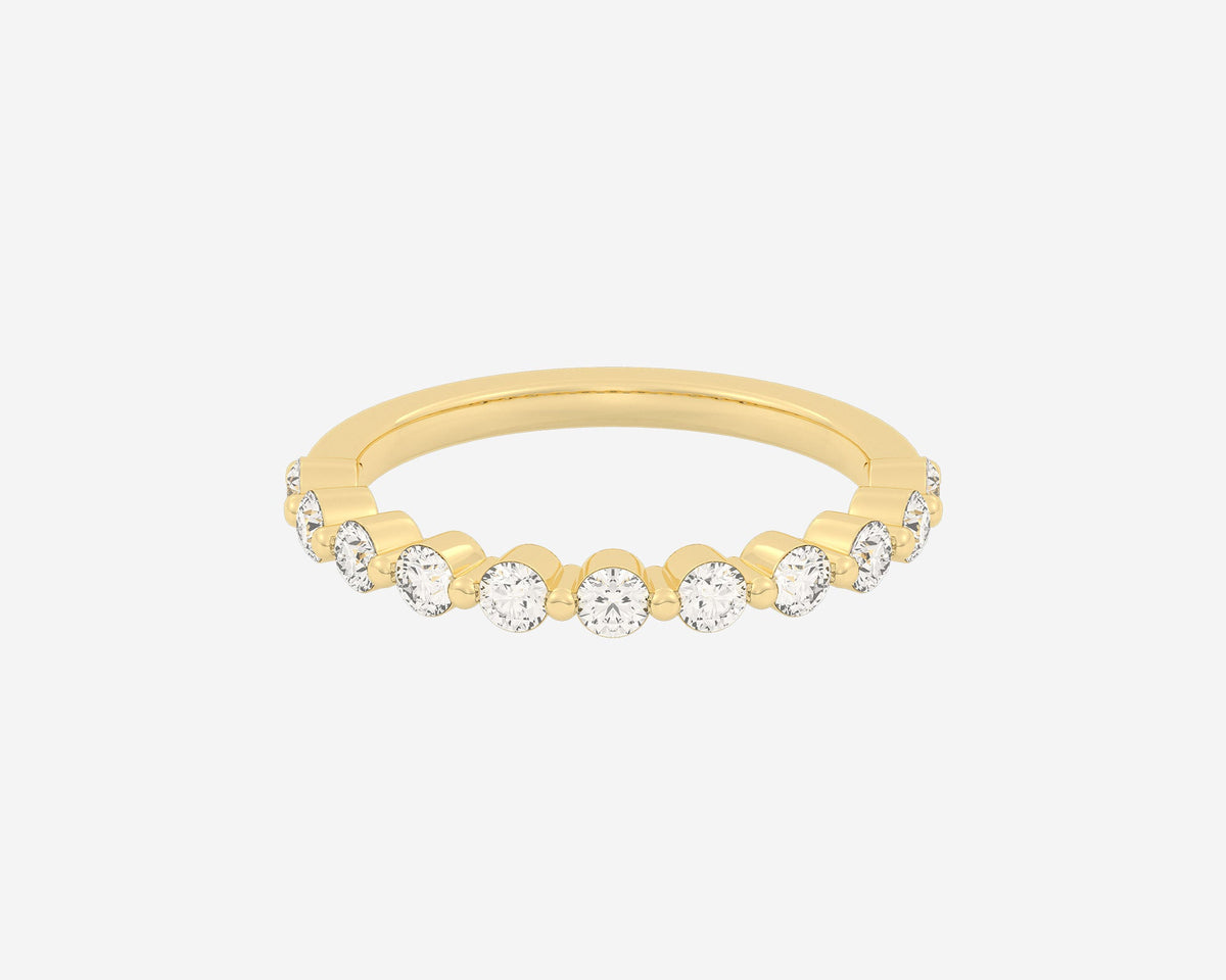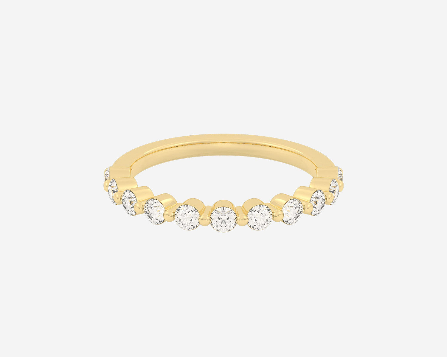 This Half Floating Eternity ring by Holden features ethical lab-grown diamonds set halfway around its slender 1.75mm band in a floating style that enhances light reflection. The E-G color and VS clarity diamonds bring a refined brilliance, while the unisex comfort-fit and New York City craftsmanship ensure a blend of comfort and conscious luxury.