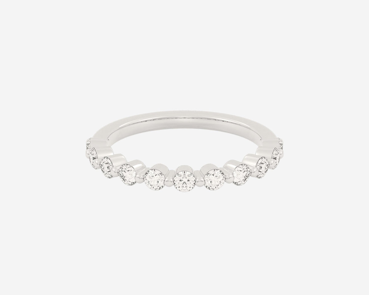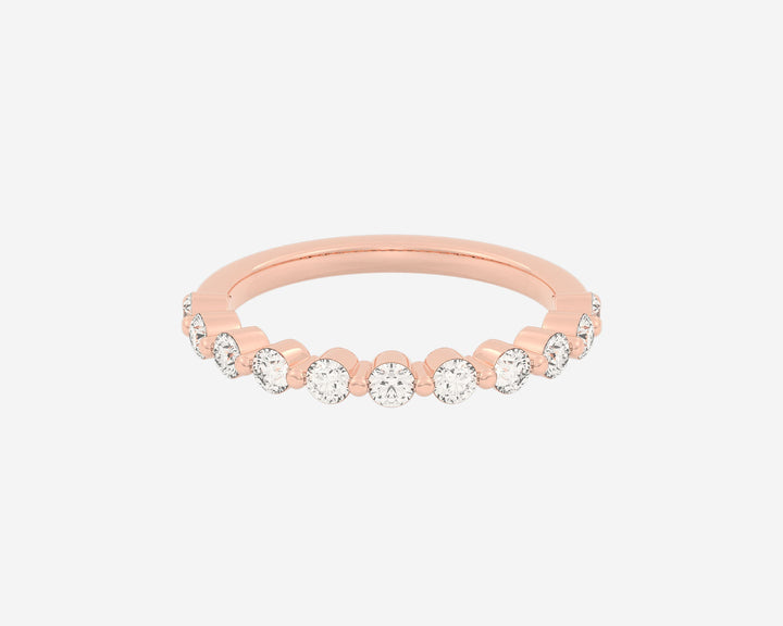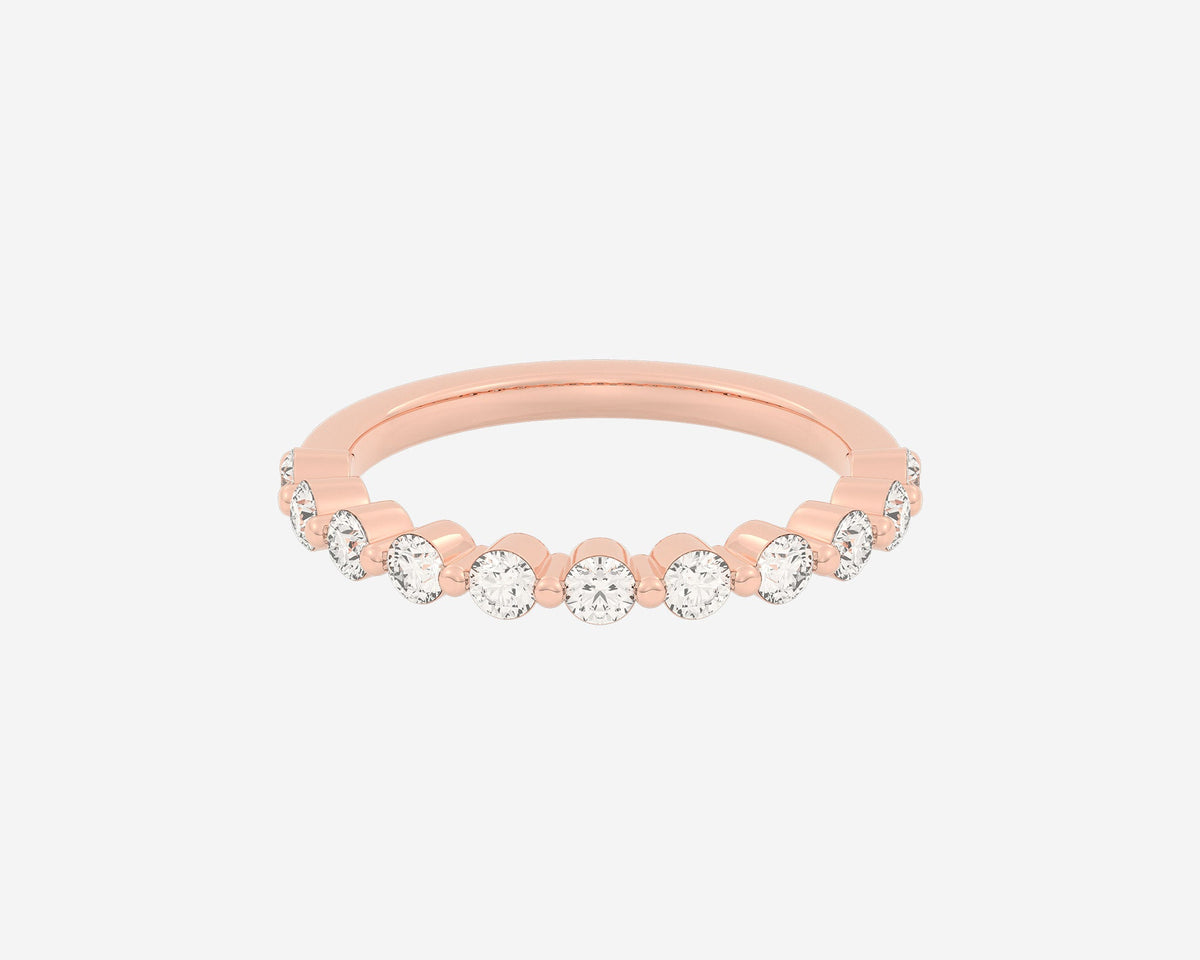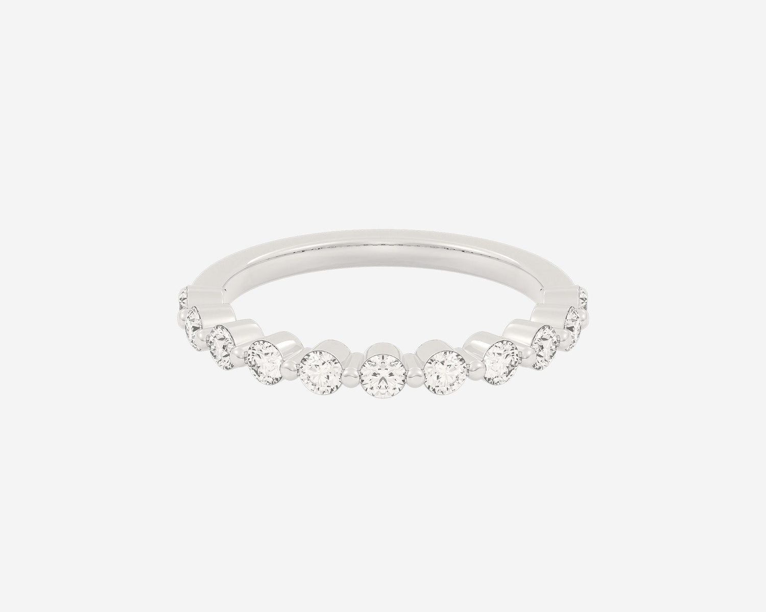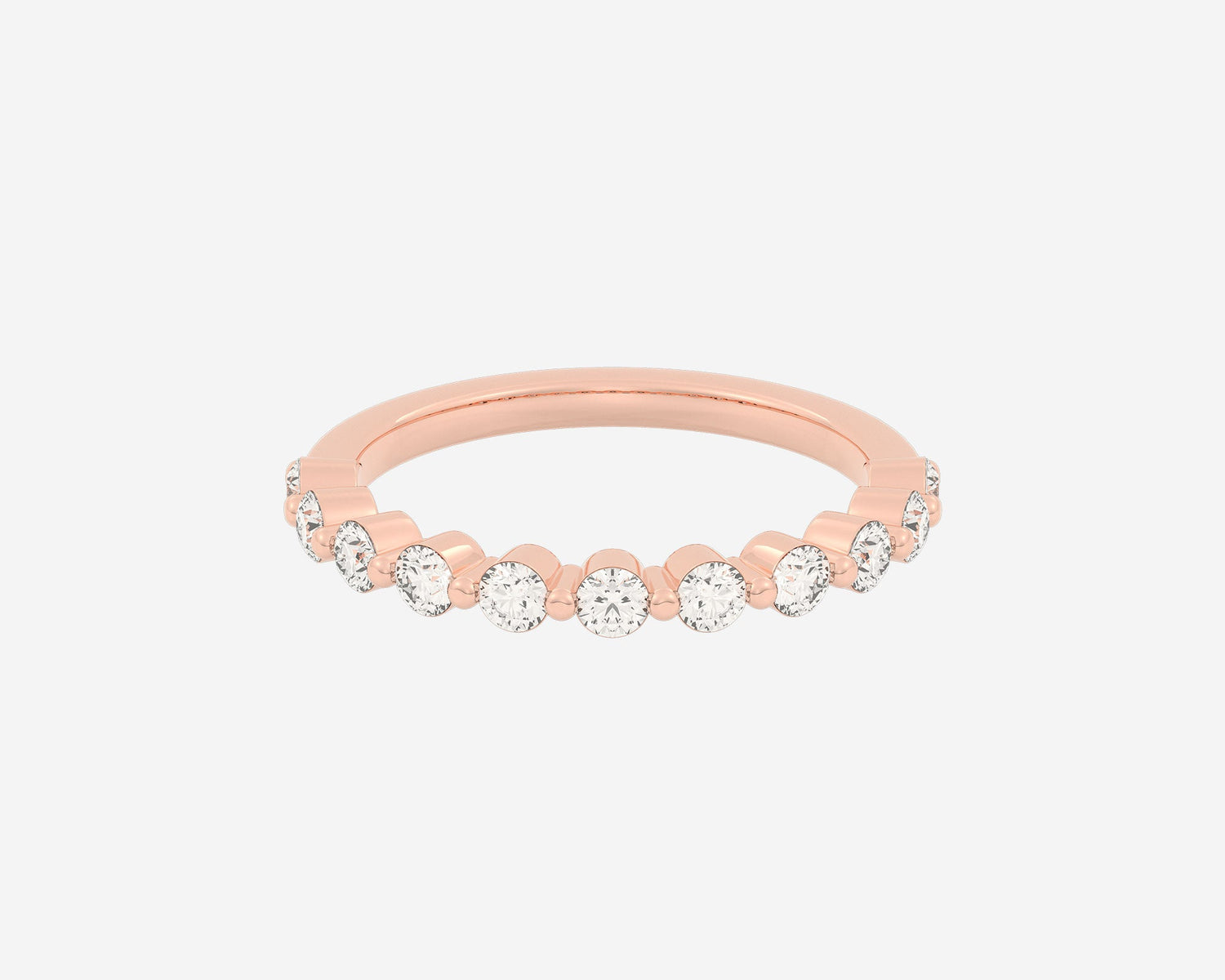 This Half Floating Eternity ring by Holden features ethical lab-grown diamonds set halfway around its slender 1.75mm band in a floating style that enhances light reflection. The E-G color and VS clarity diamonds bring a refined brilliance, while the unisex comfort-fit and New York City craftsmanship ensure a blend of comfort and conscious luxury.