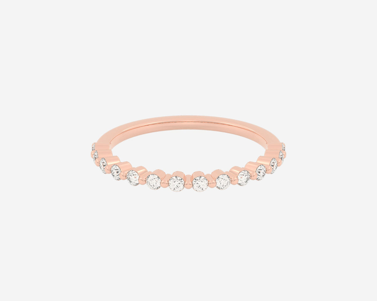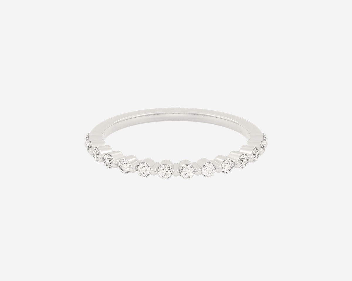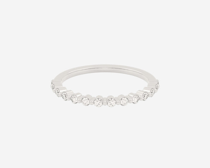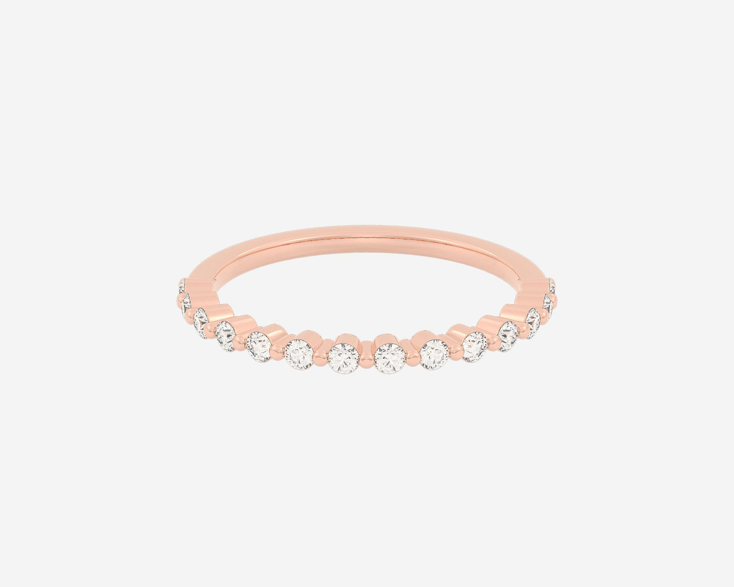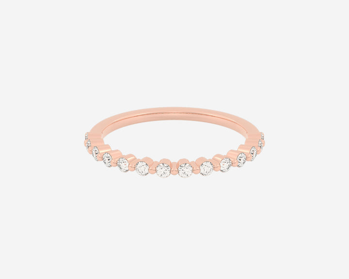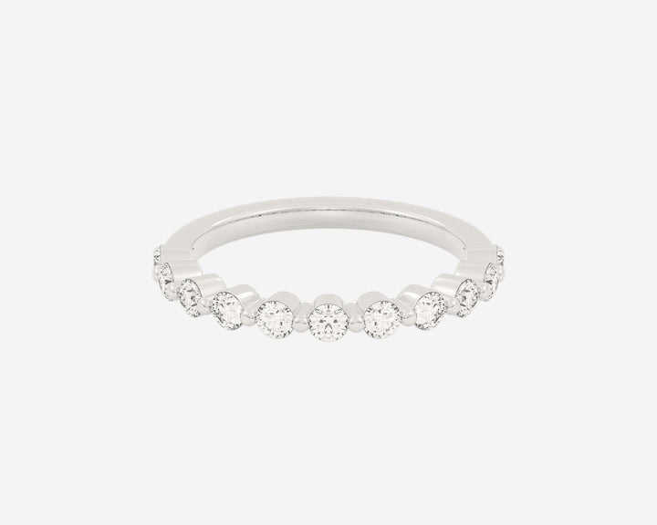 This Half Floating Eternity ring by Holden features ethical lab-grown diamonds set halfway around its slender 1.75mm band in a floating style that enhances light reflection. The E-G color and VS clarity diamonds bring a refined brilliance, while the unisex comfort-fit and New York City craftsmanship ensure a blend of comfort and conscious luxury.