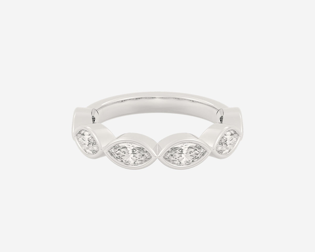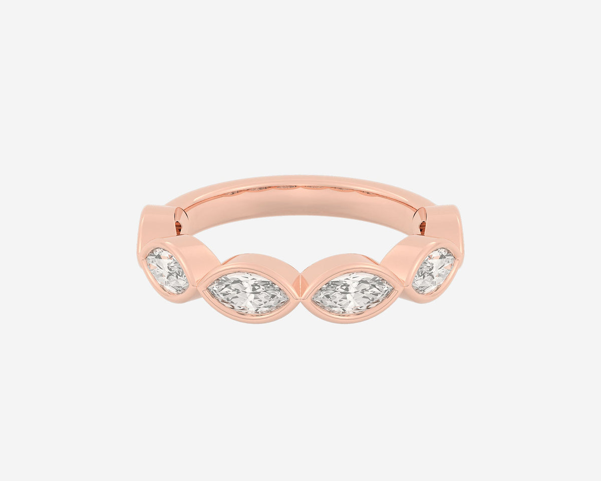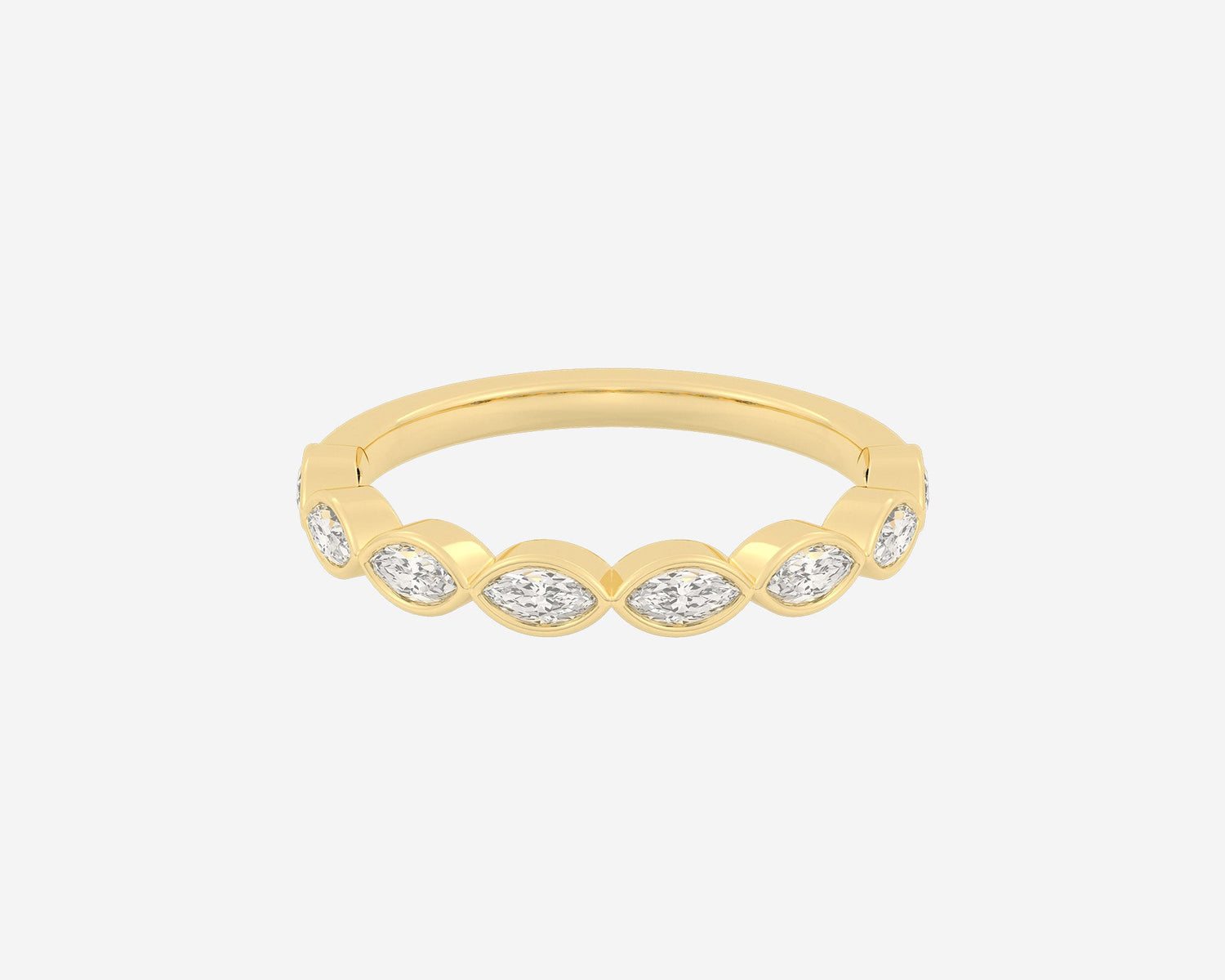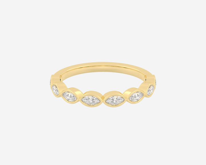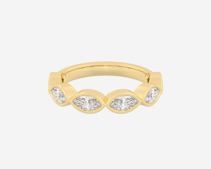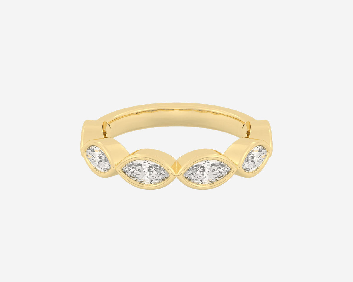 Handcrafted in 14k yellow gold, 3mm band width with horizontally bezel-set lab-grown marquise diamonds.