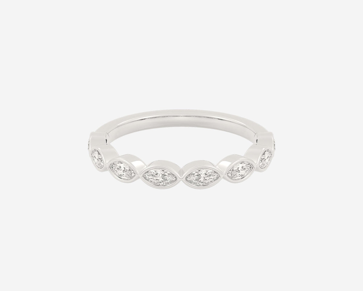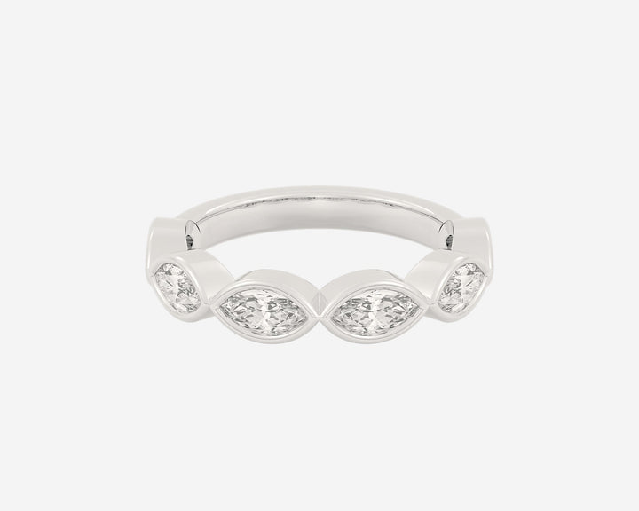 This Half Frame Marquise eternity ring by Holden showcases horizontally set marquise lab-grown diamonds framed in a bezel setting on half the band. Resizable and engravable, it pairs beautifully with most engagement rings or as part of a stylish everyday stack. Custom-made to order with a focus on craftsmanship and sustainable materials.