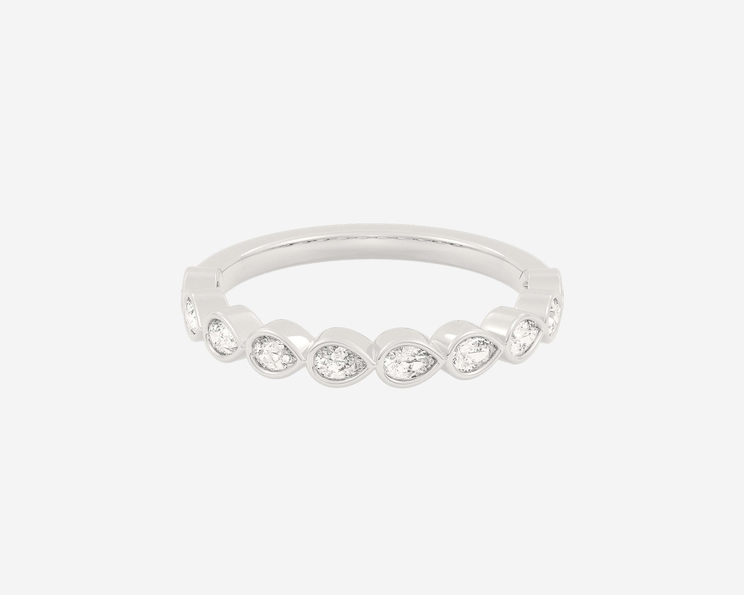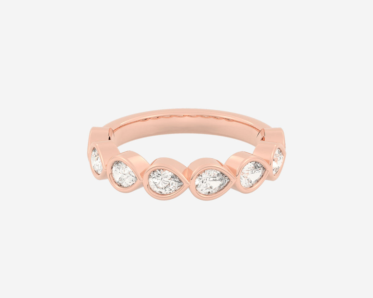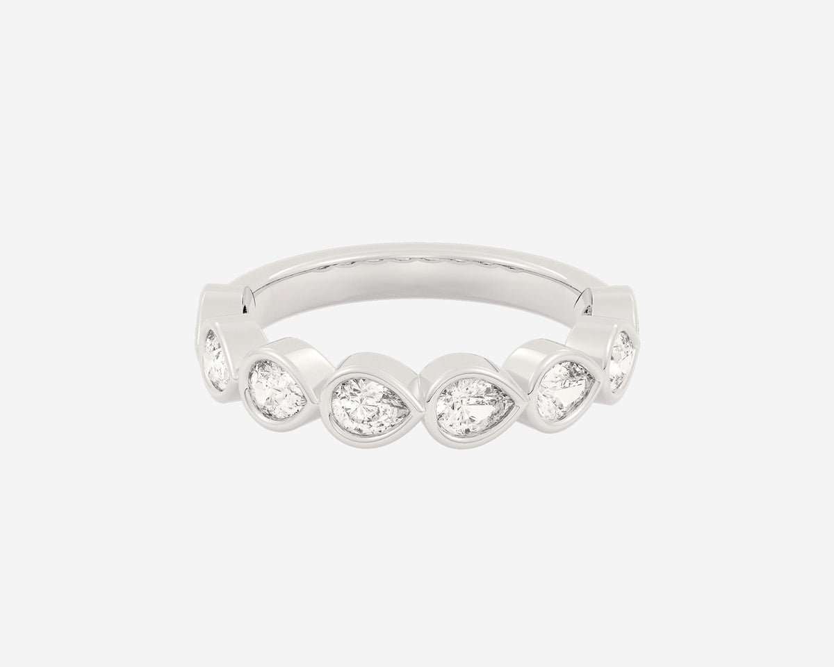 These Half Frame Pear rings by Holden are a captivating fusion of elegance and modern design, featuring lab-grown pear-cut diamonds set horizontally in an east-west orientation and framed by a sleek bezel setting. Diamonds adorn only half the band, allowing for resizing and engraving, making each ring truly customizable. Ideal as a wedding ring, part of a stylish ring stack, or worn solo, this piece brings a fresh, refined twist to the eternity ring tradition.