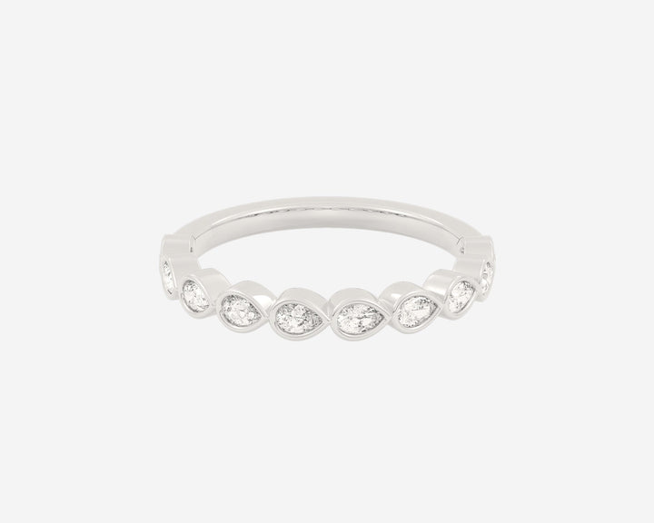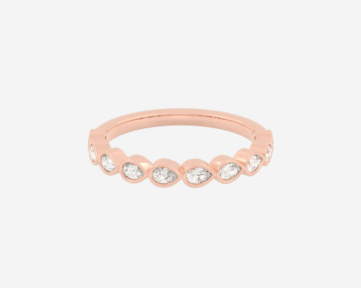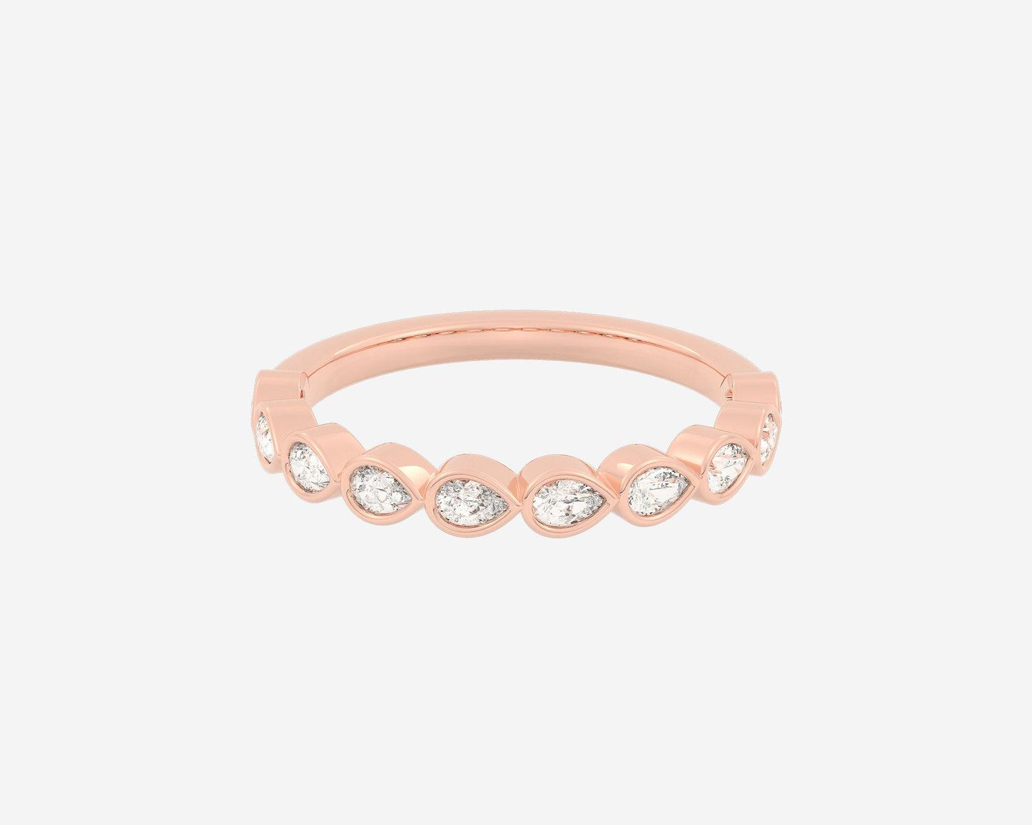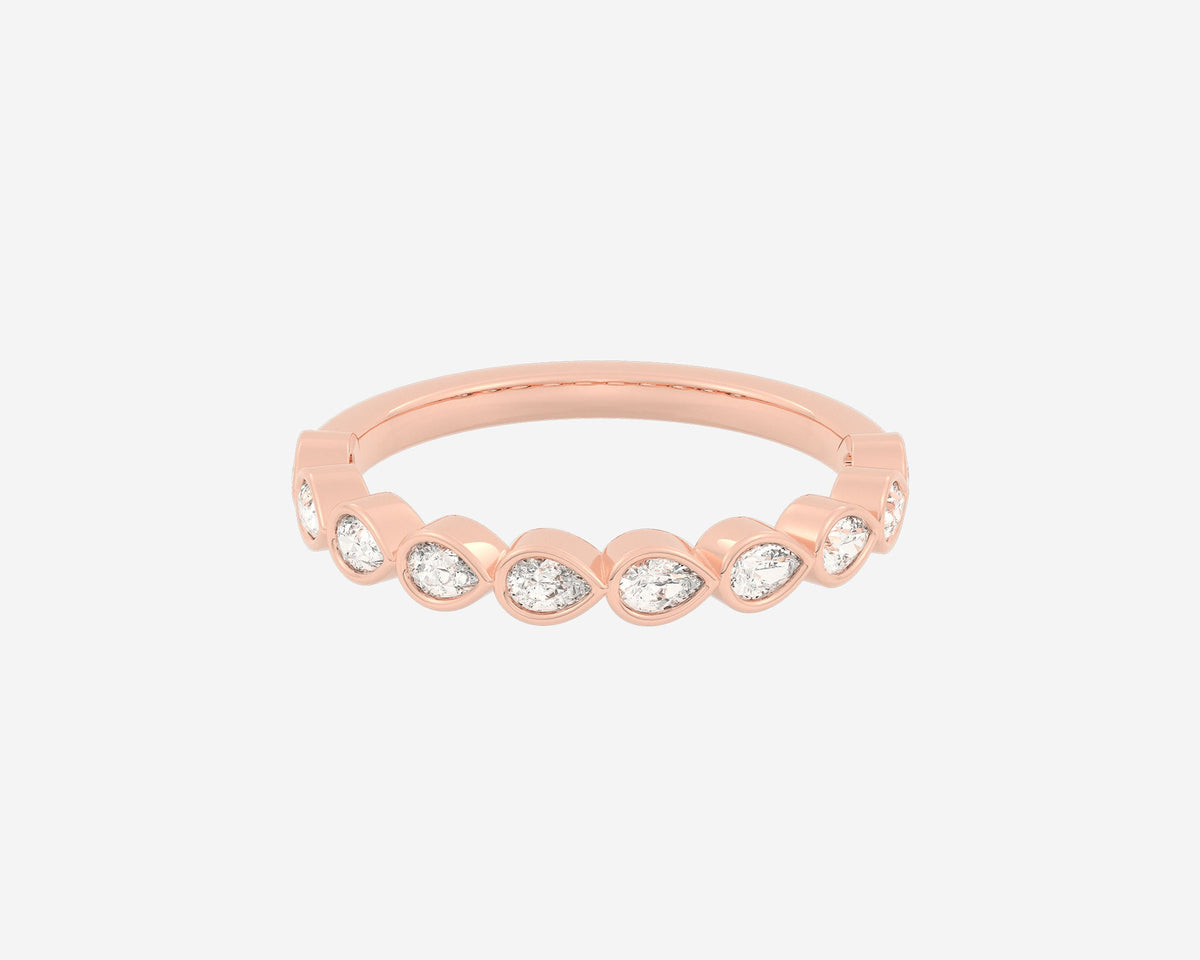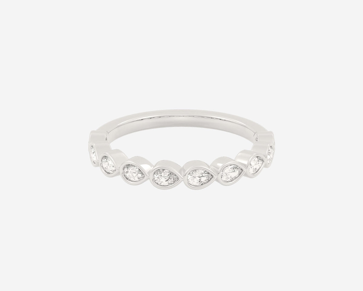 These Half Frame Pear rings by Holden are a captivating fusion of elegance and modern design, featuring lab-grown pear-cut diamonds set horizontally in an east-west orientation and framed by a sleek bezel setting. Diamonds adorn only half the band, allowing for resizing and engraving, making each ring truly customizable. Ideal as a wedding ring, part of a stylish ring stack, or worn solo, this piece brings a fresh, refined twist to the eternity ring tradition.
