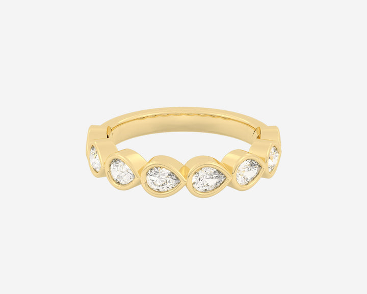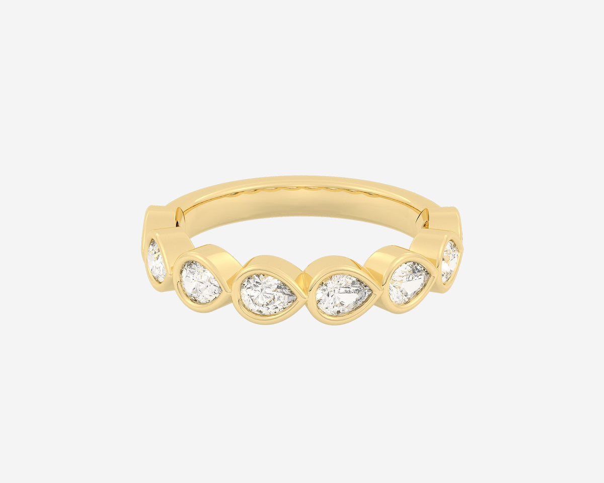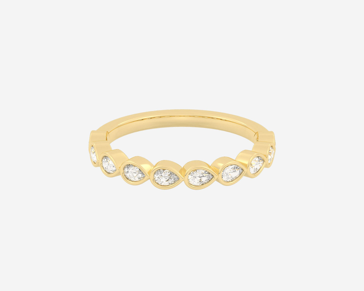 Handcrafted in 14k yellow gold. Width 3mm. Lab-grown pear-cut diamonds set in bezel setting on half the band. Comfort-fit design.