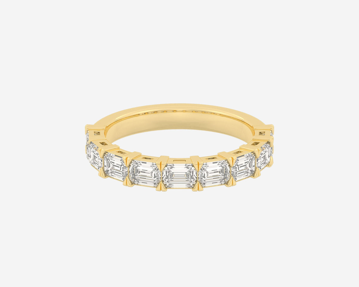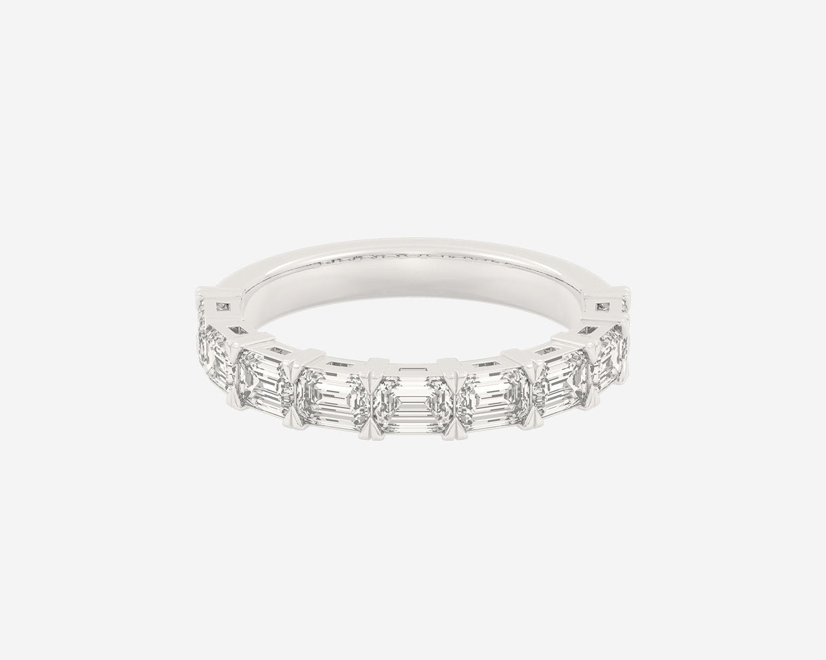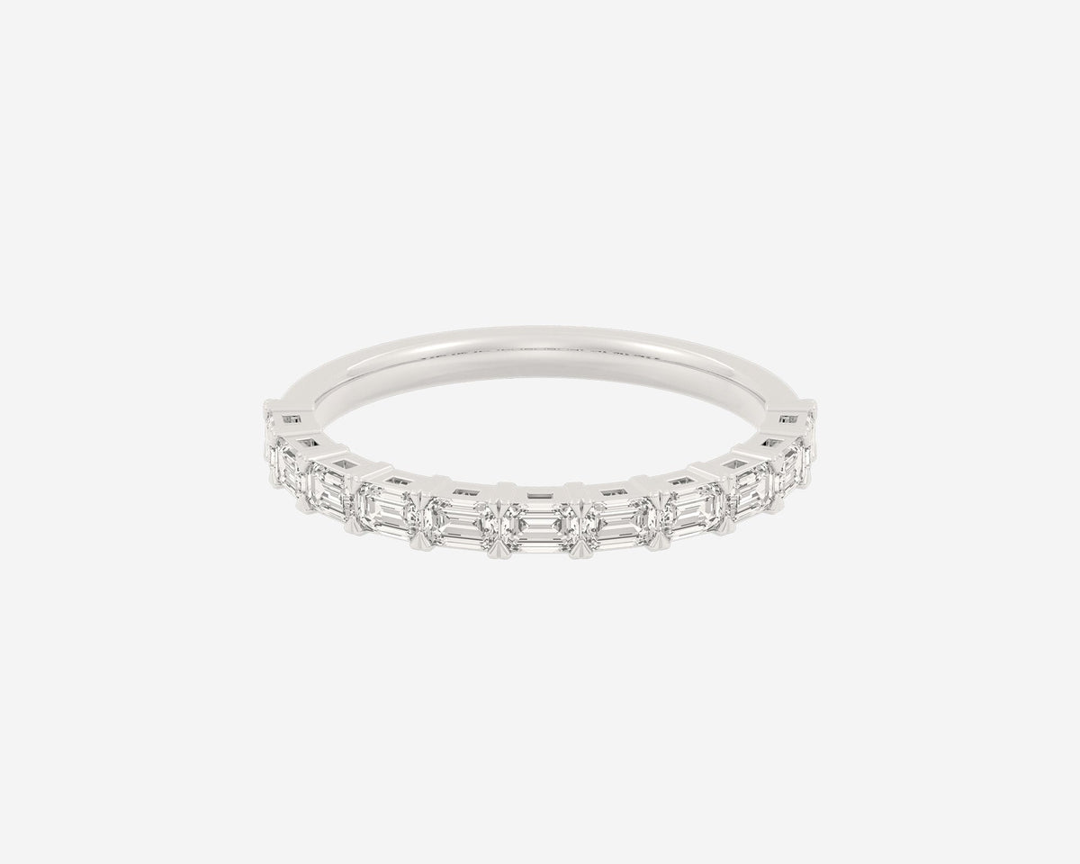 This Half Row Emerald wedding ring by Holden features a refined line of emerald-cut ethical lab-grown diamonds set halfway around a 2.75mm band. Crafted in NYC from sustainable, recycled metals, this piece perfectly balances modern elegance with conscious craftsmanship, making it a sophisticated choice for lifelong commitment.