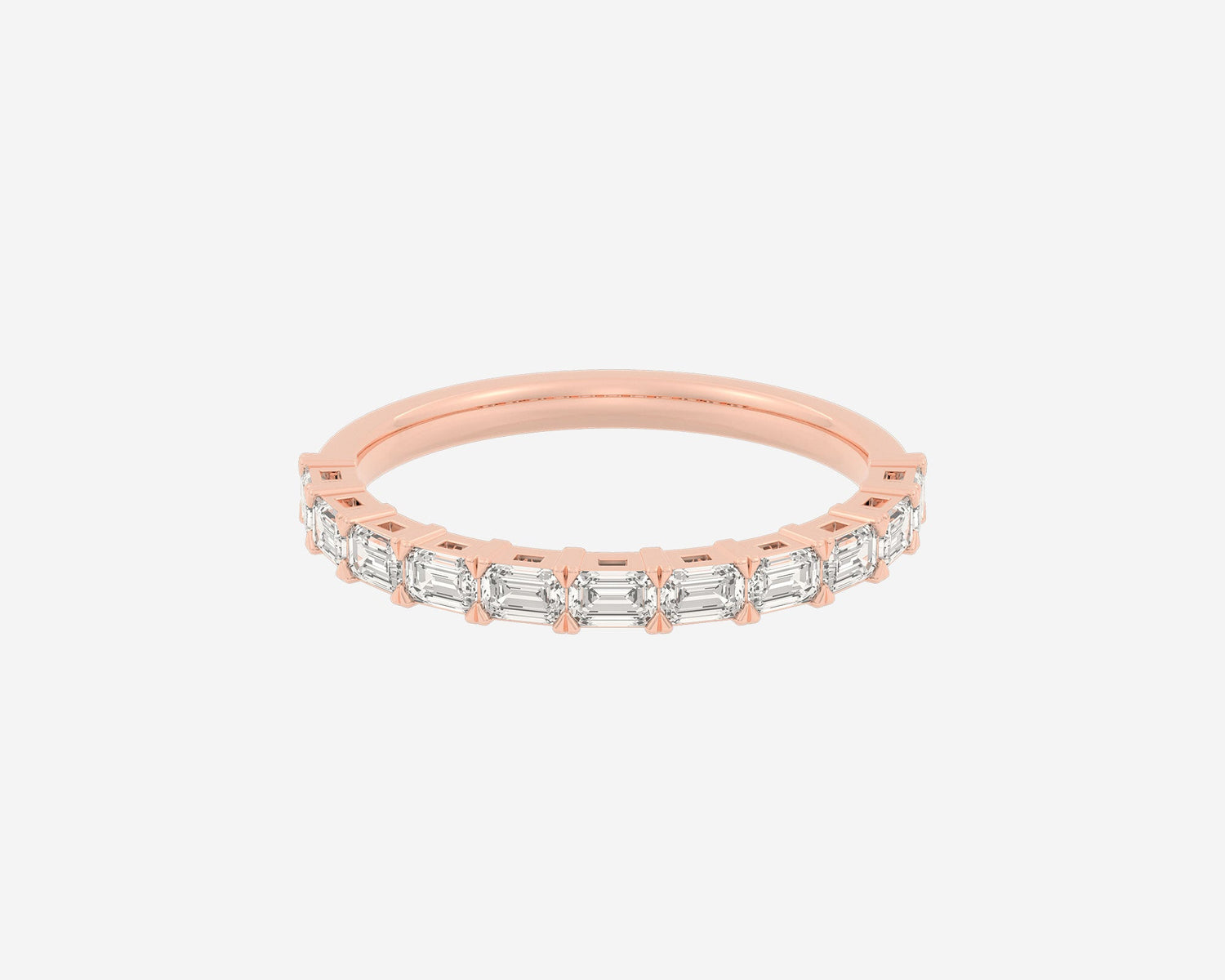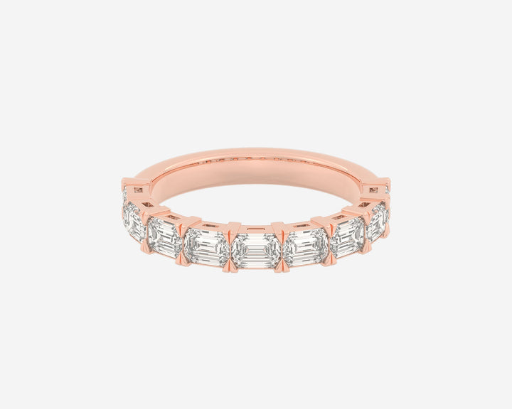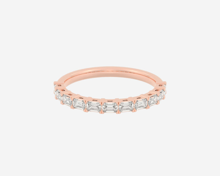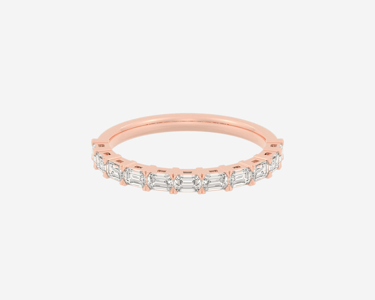 This Half Row Emerald wedding ring by Holden features a refined line of emerald-cut ethical lab-grown diamonds set halfway around a 2.75mm band. Crafted in NYC from sustainable, recycled metals, this piece perfectly balances modern elegance with conscious craftsmanship, making it a sophisticated choice for lifelong commitment.