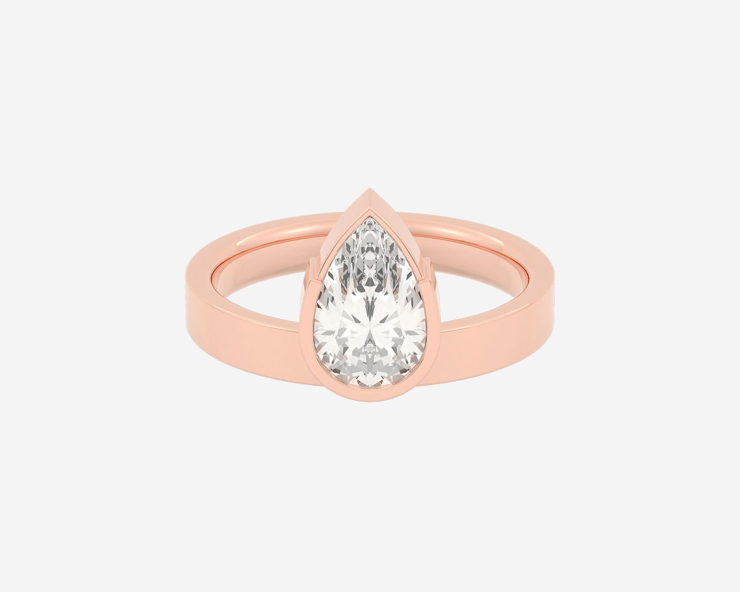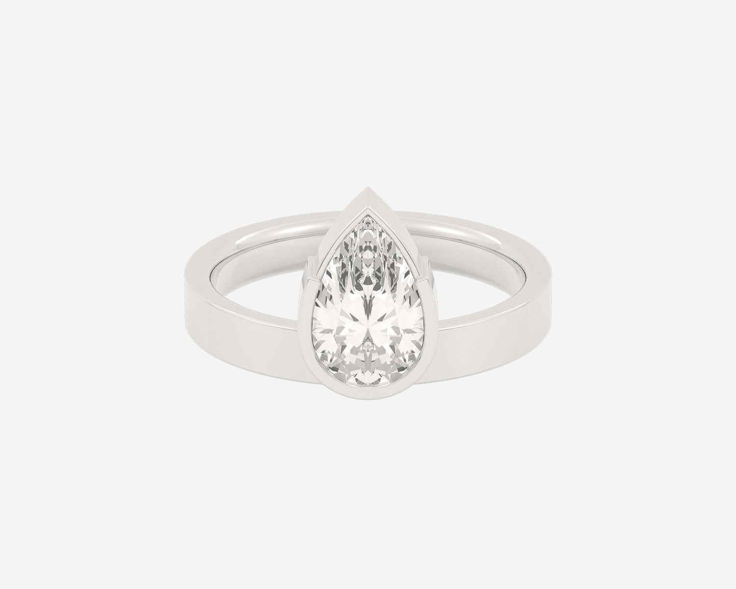 This Horizon Half Bezel — Pear by Holden features a pear-shaped lab-grown diamond secured in a horizon-inspired half bezel setting, blending architectural form with delicate beauty. Handcrafted sustainably in NYC, this ring symbolizes forward-looking love and timeless commitment.