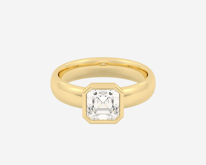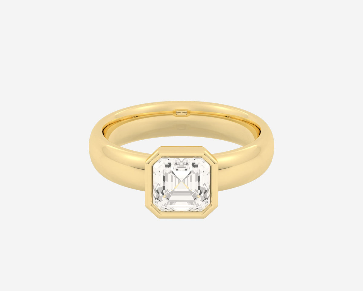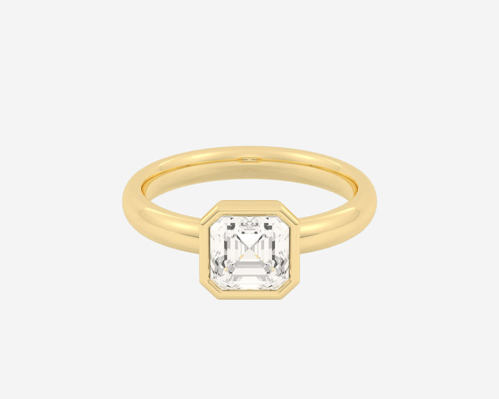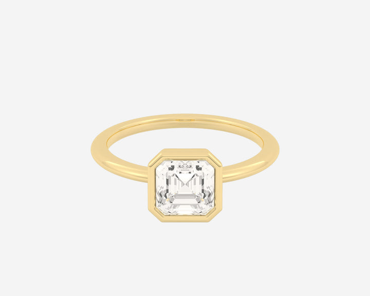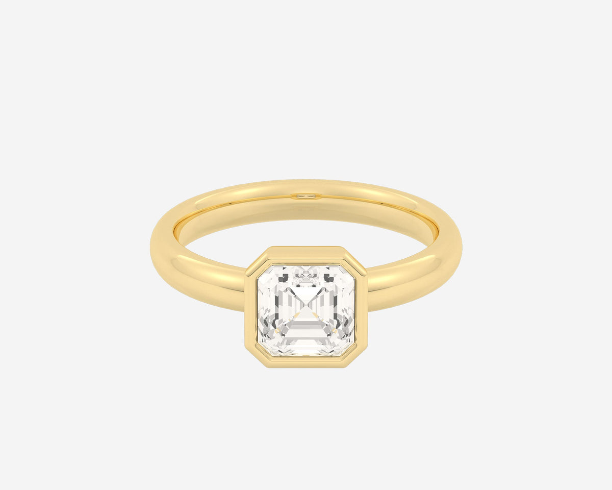 Handcrafted in 14k yellow gold, 1.5mm band width with bezel-set lab-grown Asscher-cut diamond.